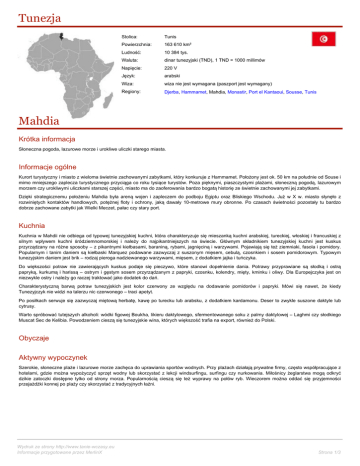 Tunezja Stolica: Tunis Powierzchnia: 163 610 km² Ludność: 10 384 tys. Waluta: dinar tunezyjski (TND), 1 TND = 1000 millimów Napięcie: 220 V Język: arabski Wiza: wiza nie jest wymagana (paszport jest wymagany) Regiony: Djerba, Hammamet, Mahdia, Monastir, Port el Kantaoui, Sousse, Tunis Mahdia Krótka informacja Słoneczna pogoda, lazurowe morze i urokliwe uliczki starego miasta. Informacje ogólne Kurort turystyczny i miasto z wieloma świetnie zachowanymi zabytkami, który konkuruje z Hammamet. Położony jest ok. 50 km na południe od Souse i mimo mniejszego zaplecza turystycznego przyciąga co roku tysiące turystów. Poza pięknymi, piaszczystymi plażami, słoneczną pogodą, lazurowym morzem czy urokliwymi uliczkami starszej części, miasto ma do zaoferowania bardzo bogatą historię ze świetnie zachowanymi jej zabytkami. Dzięki strategicznemu położeniu Mahdia była areną wojen i zapleczem do podboju Egiptu oraz Bliskiego Wschodu. Już w X w. miasto słynęło z rozwiniętych kontaktów handlowych, potężnej floty i ochrony, jaką dawały 10-metrowe mury obronne. Po czasach świetności pozostały tu bardzo dobrze zachowane zabytki jak Wielki Meczet, pałac czy stary port. Kuchnia Kuchnia w Mahdii nie odbiega od typowej tunezyjskiej kuchni, która charakteryzuje się mieszanką kuchni arabskiej, tureckiej, włoskiej i francuskiej z silnym wpływem kuchni śródziemnomorskiej i należy do najpikantniejszych na świecie. Głównym składnikiem tunezyjskiej kuchni jest kuskus przyrządzany na różne sposoby – z pikantnymi kiełbasami, baraniną, rybami, jagnięciną i warzywami. Pojawiają się też ziemniaki, fasola i pomidory. Popularnym i tanim daniem są kiełbaski Marquez podawane zazwyczaj z suszonym mięsem, cebulą, czosnkiem i sosem pomidorowym. Typowym tunezyjskim daniem jest brik – rodzaj pieroga nadziewanego warzywami, mięsem, z dodatkiem jajka i tuńczyka. Do większości potraw nie zawierających kuskus podaje się pieczywo, które stanowi dopełnienie dania. Potrawy przyprawiane są słodką i ostrą papryką, kurkumą i harissą – ostrym i gęstym sosem przyrządzanym z papryki, czosnku, kolendry, mięty, kminku i oliwy. Dla Europejczyka jest on niezwykle ostry i należy go raczej traktować jako dodatek do dań. Charakterystyczną barwą potraw tunezyjskich jest kolor czerwony ze względu na dodawanie pomidorów i papryki. Mówi się nawet, że kiedy Tunezyjczyk nie widzi na talerzu nic czerwonego – traci apetyt. Po posiłkach serwuje się zazwyczaj miętową herbatę, kawę po turecku lub arabsku, z dodatkiem kardamonu. Deser to zwykle suszone daktyle lub cytrusy. Warto spróbować tutejszych alkoholi: wódki figowej Boukha, likieru daktylowego, sfermentowanego soku z palmy daktylowej – Laghmi czy słodkiego Muscat Sec de Kelibia. Powodzeniem cieszą się tunezyjskie wina, których większość trafia na export, również do Polski. Obyczaje Aktywny wypoczynek Szerokie, słoneczne plaże i lazurowe morze zachęca do uprawiania sportów wodnych. Przy plażach działają prywatne firmy, często współpracujące z hotelami, gdzie można wypożyczyć sprzęt wodny lub skorzystać z lekcji windsurfingu, surfingu czy nurkowania. Miłośnicy żeglarstwa mogą odkryć dzikie zatoczki dostępne tylko od strony morza. Popularnością cieszą się też wyprawy na połów ryb. Wieczorem można oddać się przyjemności przejażdżki konnej po plaży czy skorzystać z tradycyjnych łaźni. Wydruk ze strony http://www.tanie-wczasy.eu Informacje przygotowane przez MerlinX Strona 1/3 Wycieczki Fakultatywne Tunis – wycieczki do stolicy Tunezji organizowane są zwykle w ciągu jednego dnia, podczas którego spotykamy się z fascynującą historią i architekturą tego miasta jak również z współczesnym życiem jego mieszkańców. Dzięki wąskim i urokliwym uliczkom Medyny, pamiątkom architektury liczącym nawet kilkanaście stuleci czy tradycyjnym targowiskom można poczuć wyjątkową atmosferę tego miasta. Jednym z najważniejszych punktów zwiedzania Tunisu jest Muzeum Bardo, która poza zbiorami świadczącymi o wspaniałej i bogatej historii kraju, posiada największe na świecie zbiory mozaik. Najokazalszą budowlą Starego Miasta jest Wielki Meczet, a obok niego znajduje się warta zobaczenia Medressa – islamska szkoła wyższa. Będąc w Tunisie warto również zobaczyć Kartaginę – dziś jest to dzielnica Tunisu, w której znajduje się rezydencja prezydenta i posiadłości tunezyjskich elit, a w starożytności była to twierdza i centrum imperium fenickiego, a następnie rzymskiej prowincji w Afryce Północnej. Zobaczyć tu również można pozostałości po ogromnym kompleksie term Antoniusza z II w. n. e., ruiny miasta punickiego na zamkowym wzgórzu Byrsa, gdzie dziś znajduje się katolicka katedra Św. Ludwika czy też amfiteatr mogący pomieścić 50 tys. widzów. Niedaleko znajduje się tajemniczy święty okręg – Tophetu, gdzie ok. VI-III w. p.n.e. składano ofiary z ludzi. Nieopodal znajduje się urokliwa mauretańska, biało-niebieska wioska Sidi Bou Said, położona nad urwistym wybrzeżem. Wyprawa na Saharę– organizowana jest na jeden lub dwa dni, z czego najciekawszą wersją jest opcja dwu-dniowa. Stałym punktem programu jest zwiedzanie doskonale zachowanych ruin amfiteatru rzymskiego w El Jem, Douz – nazywane „wrotami Sahary” czy unikatowa w skali świata Matmata. Ta ostatnia to berberyjska wioska gdzie od ponad 2,5 tysiąca istnieją gliniane domy, budowane po części pod ziemią, a po nakręceniu tu kilku scen do „Gwiezdnych Wojen” bardzo zyskała na popularności. Wycieczka na największą pustynię świata to również niezapomniane krajobrazy i przejażdżki jeepami, quadami, wielbłądami czy też konno. Często pod wieczór organizowane są spotkania folkowe w wioskach berberyjskich, ogniska czy wszelkiego rodzaju pokazy. Podczas eskapady obowiązkowym punktem programu jest Kairouan – czwarte 