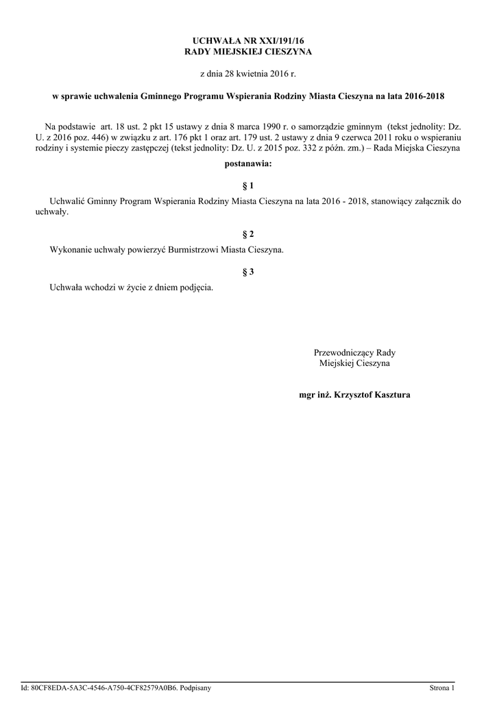 UCHWAŁA NR XXI/191/16 RADY MIEJSKIEJ CIESZYNA z dnia 28 kwietnia 2016 r. w sprawie uchwalenia Gminnego Programu Wspierania Rodziny Miasta Cieszyna na lata 2016-2018 Na podstawie art. 18 ust. 2 pkt 15 ustawy z dnia 8 marca 1990 r. o samorządzie gminnym (tekst jednolity: Dz. U. z 2016 poz. 446) w związku z art. 176 pkt 1 oraz art. 179 ust. 2 ustawy z dnia 9 czerwca 2011 roku o wspieraniu rodziny i systemie pieczy zastępczej (tekst jednolity: Dz. U. z 2015 poz. 332 z późn. zm.) – Rada Miejska Cieszyna postanawia: §1 Uchwalić Gminny Program Wspierania Rodziny Miasta Cieszyna na lata 2016 - 2018, stanowiący załącznik do uchwały. §2 Wykonanie uchwały powierzyć Burmistrzowi Miasta Cieszyna. §3 Uchwała wchodzi w życie z dniem podjęcia. Przewodniczący Rady Miejskiej Cieszyna mgr inż. Krzysztof Kasztura Id: 80CF8EDA-5A3C-4546-A750-4CF82579A0B6. Podpisany Strona 1 Załącznik do Uchwały Nr XXI/191/16 Rady Miejskiej Cieszyna z dnia 28 kwietnia 2016 r. GMINNY PROGRAM WSPIERANIA RODZINY MIASTA CIESZYNA NA LATA 2016 – 2018 Opracowanie: Miejski Ośrodek Pomocy Społecznej Cieszyn, marzec 2016 Id: 80CF8EDA-5A3C-4546-A750-4CF82579A0B6. Podpisany Strona 1 Spis treści: Wstęp 1. Podstawa prawna Programu 5 2. Zgodność Programu z innymi dokumentami 5 3. Podstawy prawne tworzenia i funkcjonowania gminnego systemu wspierania rodziny 5 4. Opis funkcjonującego w Cieszynie systemu wspierania rodziny 8 5. Specyficzne problemy rodzin w Cieszynie – obszary wsparcia 19 6. Cele Programu 26 7. Zadania Programu 26 8. Realizacja Programu 31 9. Sprawozdawczość i ewaluacja Programu 31 2 Id: 80CF8EDA-5A3C-4546-A750-4CF82579A0B6. Podpisany Strona 2 Wstęp Rodzina jest podstawową komórką społeczną, która powinna zaspokoić potrzeby każdego z jej członków. Jest miejscem, gdzie człowiek wchodzi w podstawowe dla siebie związki z innymi ludźmi, uczy się bliskości emocjonalnej. Podstawą prawidłowego rozwoju człowieka jest zaspokojenie potrzeb fizjologicznych i biologicznych, które powinna gwarantować rodzina. Jeżeli związek pomiędzy rodzicami jest zdrowy i funkcjonalny, to dzieci mają możliwość prawidłowego rozwoju. Przez kontakt z matką i ojcem dziecko zaspokaja swoją potrzebę bezpieczeństwa, miłości i przynależności. Na bazie tej interakcji dziecko buduje swoją tożsamość, swoje „ja”, tworząc podwaliny pod przyszłą autonomię człowieka dorosłego. Rodzina wywiera istotny wpływ na kształtowanie się postaw, aspiracji, systemów wartości. Rodzina jest jednym z najważniejszych czynników socjalizacji, jest pierwszym światem społecznym dla niemowlęcia i dziecka. W niej powstają pierwsze i najbardziej trwałe więzi. Możliwości życiowe jednostki, zdrowie, wykształcenie są w dużym stopniu uzależnione od rodziny, w której się urodziła, bowiem dziecko wchodzi zawsze w pewien układ stworzony przez rodziców. „Rodzina współczesna znajduje się pod naporem wielu czynników zewnętrznych, które wpływają na jej gwałtowne, wielorakie przemiany. Jedne z nich wywierają wpływ pozytywny i polepszają jej warunki życia (postęp techniczny, osiągnięcia medycyny), inne zaś powodują dezintegrację i dezorganizację; naruszają podstawowe normy rodzinne regulujące funkcjonowanie rodziny i jej członków, w samej rodzinie i poza nią”1 . Ludzi żyjących w obecnym czasie charakteryzuje konsumpcyjny styl życia, pogoń za pieniądzem, ciągły brak czasu, negacja i skłonność do przemocy. Wszystkie te zjawiska przenoszone na grunt rodziny, mogą stanowić ogromne zagrożenie dla procesu wychowania dzieci i młodzieży. Dezorganizacja rodziny to stan, w którym członkowie rodziny nie wykonują swoich wzajemnych obowiązków. W rodzinie zdezorganizowanej gospodarstwo domowe ulega rozpadowi, postawy rodziców stają się antagonistyczne, zanikają jej funkcje socjalizacyjne, a przede wszystkim wychowawcze. 1 Tyszka Z., (1999) Rodzina współczesna – jej geneza i kierunki przemian. [w:] Ziemska M. (red.), Rodzina współczesna, Warszawa 3 Id: 80CF8EDA-5A3C-4546-A750-4CF82579A0B6. Podpisany Strona 3 Nieprawidłowe funkcjonowanie rodziny, błędne lub złe wypełnianie ról społecznych, powoduje jej destrukcję. Następuje przekazanie złych wzorców, z którymi identyfikują i utożsamiają się dzieci. Rodzina z problemami opiekuńczo–wychowawczymi nie spełnia swoich podstawowych zadań, a problemy te mogą wynikać z niedojrzałości życiowej rodziców, która powoduje zaburzenia w pełnieniu ról rodzicielskich, małżeńskich i zawodowych, wyuczonej bezradności życiowej, niezaradności w prowadzeniu gospodarstwa domowego, zaburzonej struktury rodziny (rodzina niepełna), słabości charakteru i ulegania niekorzystnym wpływom otoczenia, uzależnienia od środków psychoaktywnych, przemocy domowej, chorób psychicznych i somatycznych. W sytuacjach kryzysowych, gdy rodzina nie radzi sobie z problemami, w szczególności gdy sytuacja taka powoduje zagrożenie zdrowia lub życia dzieci, niezbędna jest interwencja odpowiednich służb. Mając na uwadze fundamentalną rolę rodziny, zarówno w wymiarze społecznym, jak i indywidualnym, niezbędne jest organizowanie w ramach gminnego systemu, działań profilaktycznych, zapobiegających występowaniu negatywnych zjawisk, mogących mieć wpływ na jej funkcjonowanie, działań wspierających i wzmacniających ją, a także korekcyjnych w sytuacji, gdy nie wypełnia prawidłowo swoich zadań. W ramach realizacji Gminnego Programu Wspierania Rodziny na lata 2013 – 2015 udało się skoordynować wiele działań zmierzających do stworzenia w Cieszynie spójnego i skutecznego systemu wsparcia rodzin wychowujących dzieci, a także borykających się z trudnościami w wypełnianiu funkcji opiekuńczo-wychowawczych. Aby zapewnić rodzinom wychowującym dzieci na terenie naszego miasta dalsze warunki dla prawidłowego funkcjonowania konieczne jest kontynuowanie działań podjętych w Gminny