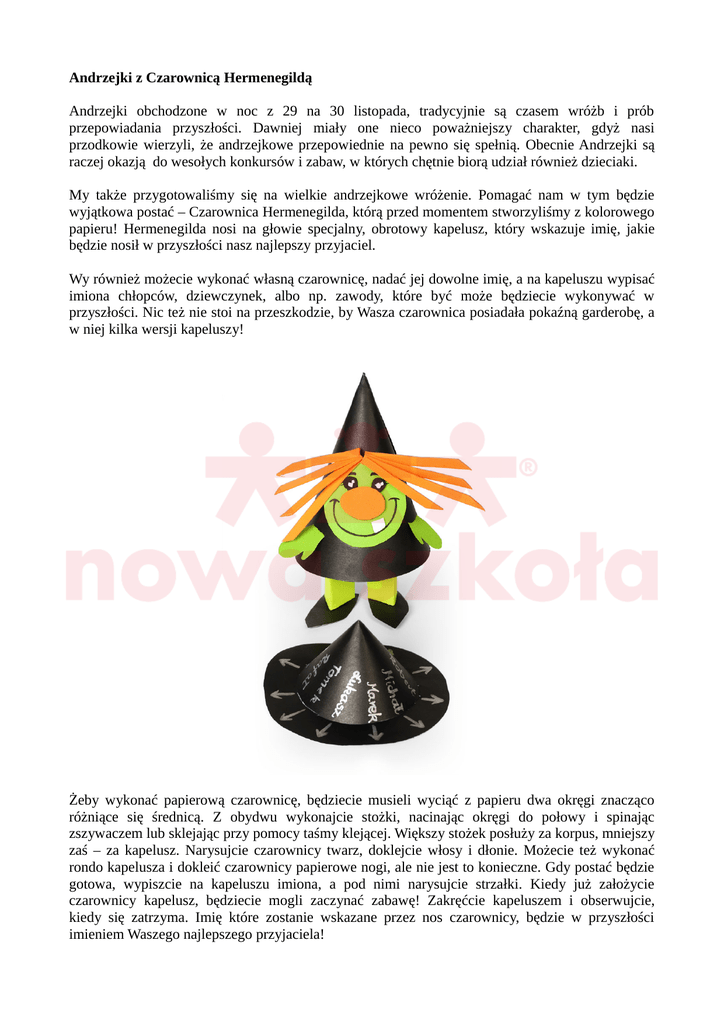 Andrzejki z Czarownicą Hermenegildą Andrzejki obchodzone w noc z 29 na 30 listopada, tradycyjnie są czasem wróżb i prób przepowiadania przyszłości. Dawniej miały one nieco poważniejszy charakter, gdyż nasi przodkowie wierzyli, że andrzejkowe przepowiednie na pewno się spełnią. Obecnie Andrzejki są raczej okazją do wesołych konkursów i zabaw, w których chętnie biorą udział również dzieciaki. My także przygotowaliśmy się na wielkie andrzejkowe wróżenie. Pomagać nam w tym będzie wyjątkowa postać – Czarownica Hermenegilda, którą przed momentem stworzyliśmy z kolorowego papieru! Hermenegilda nosi na głowie specjalny, obrotowy kapelusz, który wskazuje imię, jakie będzie nosił w przyszłości nasz najlepszy przyjaciel. Wy również możecie wykonać własną czarownicę, nadać jej dowolne imię, a na kapeluszu wypisać imiona chłopców, dziewczynek, albo np. zawody, które być może będziecie wykonywać w przyszłości. Nic też nie stoi na przeszkodzie, by Wasza czarownica posiadała pokaźną garderobę, a w niej kilka wersji kapeluszy! Żeby wykonać papierową czarownicę, będziecie musieli wyciąć z papieru dwa okręgi znacząco różniące się średnicą. Z obydwu wykonajcie stożki, nacinając okręgi do połowy i spinając zszywaczem lub sklejając przy pomocy taśmy klejącej. Większy stożek posłuży za korpus, mniejszy zaś – za kapelusz. Narysujcie czarownicy twarz, doklejcie włosy i dłonie. Możecie też wykonać rondo kapelusza i dokleić czarownicy papierowe nogi, ale nie jest to konieczne. Gdy postać będzie gotowa, wypiszcie na kapeluszu imiona, a pod nimi narysujcie strzałki. Kiedy już założycie czarownicy kapelusz, będziecie mogli zaczynać zabawę! Zakręćcie kapeluszem i obserwujcie, kiedy się zatrzyma. Imię które zostanie wskazane przez nos czarownicy, będzie w przyszłości imieniem Waszego najlepszego przyjaciela! Do wykonania postaci czarownicy użyliśmy: • • • • • blok kartonów czarnych A3 10 arkuszy, blok kartonów kolorowych A4, folia piankowa, taśma dwustronna, nożyczki tradycyjne.