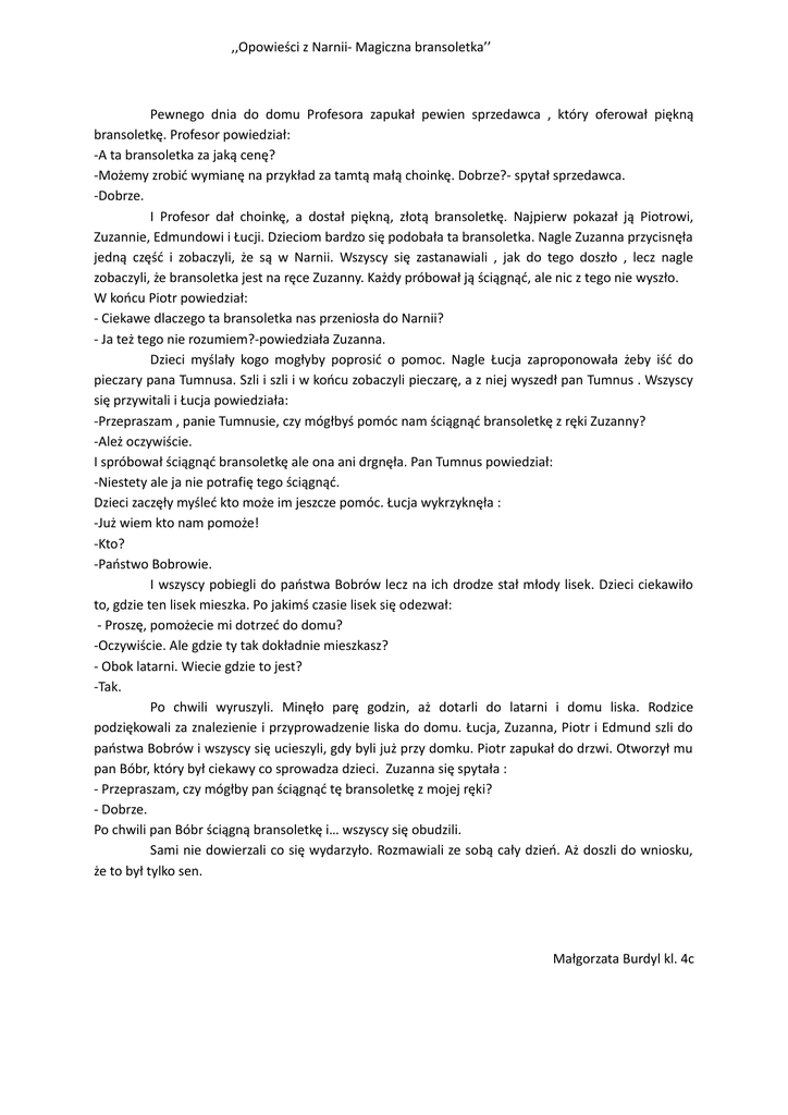 ,,Opowieści z Narnii- Magiczna bransoletka’’ Pewnego dnia do domu Profesora zapukał pewien sprzedawca , który oferował piękną bransoletkę. Profesor powiedział: -A ta bransoletka za jaką cenę? -Możemy zrobić wymianę na przykład za tamtą małą choinkę. Dobrze?- spytał sprzedawca. -Dobrze. I Profesor dał choinkę, a dostał piękną, złotą bransoletkę. Najpierw pokazał ją Piotrowi, Zuzannie, Edmundowi i Łucji. Dzieciom bardzo się podobała ta bransoletka. Nagle Zuzanna przycisnęła jedną część i zobaczyli, że są w Narnii. Wszyscy się zastanawiali , jak do tego doszło , lecz nagle zobaczyli, że bransoletka jest na ręce Zuzanny. Każdy próbował ją ściągnąć, ale nic z tego nie wyszło. W końcu Piotr powiedział: - Ciekawe dlaczego ta bransoletka nas przeniosła do Narnii? - Ja też tego nie rozumiem?-powiedziała Zuzanna. Dzieci myślały kogo mogłyby poprosić o pomoc. Nagle Łucja zaproponowała żeby iść do pieczary pana Tumnusa. Szli i szli i w końcu zobaczyli pieczarę, a z niej wyszedł pan Tumnus . Wszyscy się przywitali i Łucja powiedziała: -Przepraszam , panie Tumnusie, czy mógłbyś pomóc nam ściągnąć bransoletkę z ręki Zuzanny? -Ależ oczywiście. I spróbował ściągnąć bransoletkę ale ona ani drgnęła. Pan Tumnus powiedział: -Niestety ale ja nie potrafię tego ściągnąć. Dzieci zaczęły myśleć kto może im jeszcze pomóc. Łucja wykrzyknęła : -Już wiem kto nam pomoże! -Kto? -Państwo Bobrowie. I wszyscy pobiegli do państwa Bobrów lecz na ich drodze stał młody lisek. Dzieci ciekawiło to, gdzie ten lisek mieszka. Po jakimś czasie lisek się odezwał: - Proszę, pomożecie mi dotrzeć do domu? -Oczywiście. Ale gdzie ty tak dokładnie mieszkasz? - Obok latarni. Wiecie gdzie to jest? -Tak. Po chwili wyruszyli. Minęło parę godzin, aż dotarli do latarni i domu liska. Rodzice podziękowali za znalezienie i przyprowadzenie liska do domu. Łucja, Zuzanna, Piotr i Edmund szli do państwa Bobrów i wszyscy się ucieszyli, gdy byli już przy domku. Piotr zapukał do drzwi. Otworzył mu pan Bóbr, który był ciekawy co sprowadza dzieci. Zuzanna się spytała : - Przepraszam, czy mógłby pan ściągnąć tę bransoletkę z mojej ręki? - Dobrze. Po chwili pan Bóbr ściągną bransoletkę i… wszyscy się obudzili. Sami nie dowierzali co się wydarzyło. Rozmawiali ze sobą cały dzień. Aż doszli do wniosku, że to był tylko sen. Małgorzata Burdyl kl. 4c