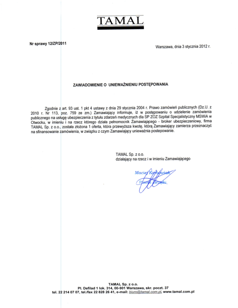 TAMAL Nrsprawy12/ZP/2011 Warszawa, dnia 3 stycznia 2012 r. ZAWIADOMIENIE 0 UNIEWAZNIENIU POSTEPOWANIA Zgodnie z art. 93 ust. 1 pkt 4 ustawy z dnia 29 stycznia 2004 r. Prawo zamowieh publicznych (Dz.U. z 2010 r. Nr 113, poz. 759 ze zm.) Zamawiajacy informuje, iz w post^powaniu o udzielenie zamowienia publicznego na uslug§ ubezpieczenia z tytulu zdarzeh medycznych dla SP ZOZ Szpital Specjalistyczny MSWiA w Otwocku, w imieniu i na rzecz ktorego dziala pelnomocnik Zamawiajacego - broker ubezpieczeniowy, firma TAMAL Sp. z o.o., zostata ztozona 1 oferta, ktora przewyzsza kwote_, ktora^ Zamawiajapy zamierza przeznaczyc na sfinansowanie zamowienia, w zwiazku z czym Zamawiajapy uniewaznia postepowanie. TAMAL Sp. z o.o. dzialajacy na rzecz i w imieniu Zamawiajapego Maciejt TAMAL Sp. z o.o. PI. Defilad 1 lok. 314, 00-901 Warszawa, skr. poczt. 37 tel. 2 214 07 07, tel./fax 22 828 26 41, e-mail: biuro&.tamal.com.pl. www.tamal.com.pl
