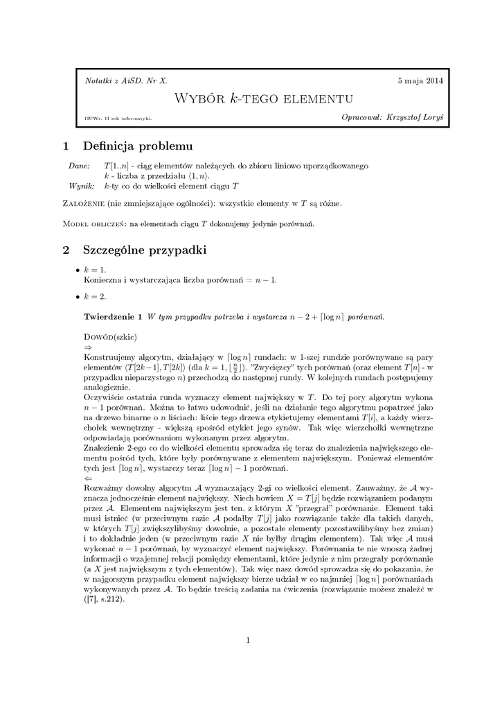 Znalezienie 2-ego co do wielko±ci elementu sprowadza si¦ teraz do znalezienia najwi¦kszego elementu po±ród tych, które byªy porównywane z elementem najwi¦kszym. Poniewa» elementów