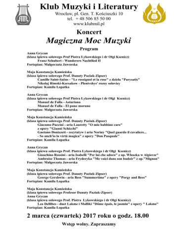 Klub Muzyki i Literatury Wrocław, pl. Gen. T. Kościuszki 10 tel. + 48 506 85 50 00 www.klubmil.pl Koncert Magiczna Moc Muzyki Program Anna Grycan (klasa śpiewu solowego Prof Piotra Łykowskiego i dr Olgi Ksenicz) Franz Schubert - Wanderers Nachtlied II Fortepian: Małgorzata Jaworska Maja Konstancja Kamieńska (klasa śpiewu solowego Prof. Danuty Paziuk-Zipser) Camille Saint-Saëns - "Le rossignol et la rose" z dzieła "Parysatis" Nikolaj Rimski-Korsakow - Plenivshys' rozoy soloviey Fortepian: Kamila Łopatka Anna Grycan (klasa śpiewu solowego Prof Piotra Łykowskiego i dr Olgi Ksenicz) Manuel de Falla - Asturiana Manuel de Falla - El pano moruno Fortepian: Małgorzata Jaworska Maja Konstancja Kamieńska (klasa śpiewu solowego Prof. Danuty Paziuk-Zipser) Giacomo Puccini - aria Lauretty "O mio babbino caro" z opery "Gianni Schicchi" Gaetano Donizzeti - recytatyw i aria Noriny "Quel guardo il cavaliere... - So anch'io la virtù magica" z opery "Don Pasquale" Fortepian: Kamila Łopatka Anna Grycan (klasa śpiewu solowego Prof. Piotra Łykowskiego i dr Olgi Ksenicz) Gioachino Rossini - aria Isabelli "Per lui che adoro" z op. Włoszka w Algierze" Ambroise Thomas - aria Fryderyka "Me voici dans son budoir" z op."Mignon" Fortepian: Małgorzata Jaworska Maja Konstancja Kamieńska (klasa śpiewu solowego Prof. Danuty Paziuk-Zipser) George Gershwin - aria Bess "Summertime" z opery "Porgy and Bess" Fortepian: Kamila Łopatka Maja Konstancja Kamieńska (klasa śpiewu solowego Profesor Danuty Paziuk-Zipser) Anna Grycan (klasa śpiewu solowego Prof. Piotra Łykowskiego i dr Olgi Ksenicz) Leo Dellibes - duet Lakme i Malliki "Dôme épais, le jasmin" z opery " Lakme" Fortepian: Kamila Łopatka 2 marca (czwartek) 2017 roku o godz. 18.00 Wstęp wolny. Zapraszamy