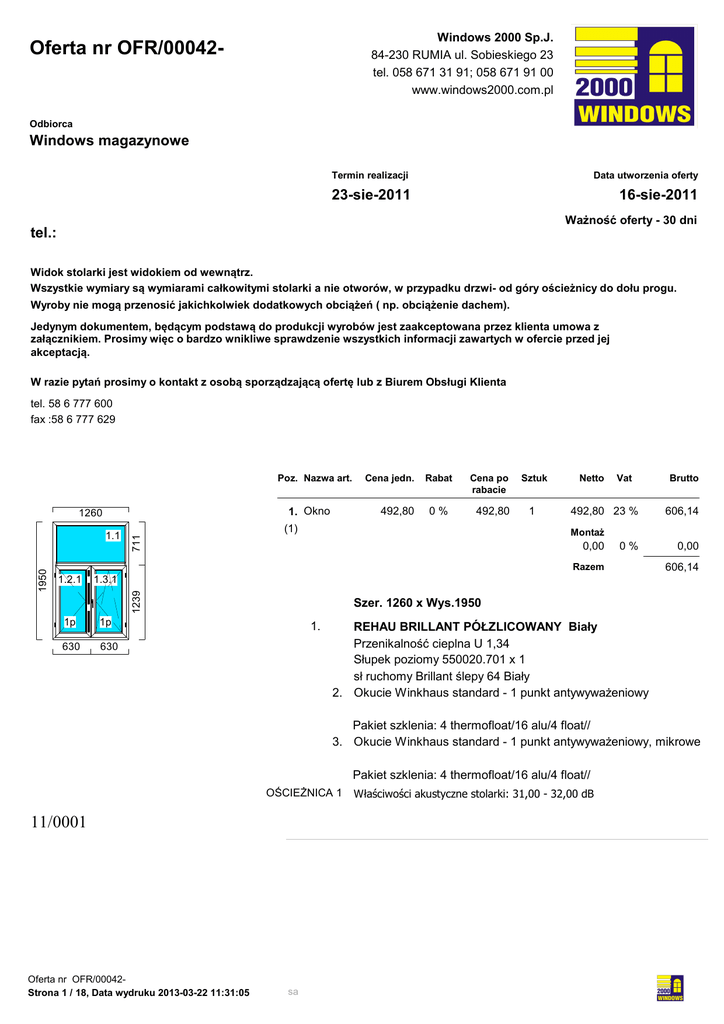 Windows 2000 Sp.J. 84-230 RUMIA ul. Sobieskiego 23 tel. 058 671 31 91; 058 671 91 00 www.windows2000.com.pl Oferta nr OFR/00042- Odbiorca Windows magazynowe Termin realizacji Data utworzenia oferty 23-sie-2011 16-sie-2011 Ważność oferty - 30 dni tel.: Widok stolarki jest widokiem od wewnątrz. Wszystkie wymiary są wymiarami całkowitymi stolarki a nie otworów, w przypadku drzwi- od góry ościeżnicy do dołu progu. Wyroby nie mogą przenosić jakichkolwiek dodatkowych obciążeń ( np. obciążenie dachem). Jedynym dokumentem, będącym podstawą do produkcji wyrobów jest zaakceptowana przez klienta umowa z załącznikiem. Prosimy więc o bardzo wnikliwe sprawdzenie wszystkich informacji zawartych w ofercie przed jej akceptacją. W razie pytań prosimy o kontakt z osobą sporządzającą ofertę lub z Biurem Obsługi Klienta tel. 58 6 777 600 fax :58 6 777 629 Poz. Nazwa art. 1. Okno 1260 492,80 Rabat 0% Cena po rabacie 492,80 (1) Sztuk 1 Netto Vat 492,80 23 % 711 0,00 0% Razem 1.2.1 Brutto 606,14 Montaż 0,00 606,14 1.3.1 1239 1950 1.1 Cena jedn. 1p 1p 630 630 Szer. 1260 x Wys.1950 1. REHAU BRILLANT PÓŁZLICOWANY Biały Przenikalność cieplna U 1,34 Słupek poziomy 550020.701 x 1 sł ruchomy Brillant ślepy 64 Biały 2. Okucie Winkhaus standard - 1 punkt antywyważeniowy Pakiet szklenia: 4 thermofloat/16 alu/4 float// 3. Okucie Winkhaus standard - 1 punkt antywyważeniowy, mikrowentyla Pakiet szklenia: 4 thermofloat/16 alu/4 float// OŚCIEŻNICA 1 11/0001 Oferta nr OFR/00042Strona 1 / 18, Data wydruku 2013-03-22 11:31:05 sa Właściwości akustyczne stolarki: 31,00 - 32,00 dB Oferta nr OFR/00042Windows magazynowe Poz. Nazwa art. 2. Okno 492,82 Rabat 0% Cena po rabacie 492,82 Sztuk 1 (2) Netto Vat 492,82 23 % 0,00 0% Razem 1.2.1 Brutto 606,17 Montaż 0,00 606,17 1.3.1 1239 1950 1.1 711 1260 Cena jedn. 1p 1p 630 630 Szer. 1260 x Wys.1950 1. REHAU BRILLANT PÓŁZLICOWANY Biały Przenikalność cieplna U 1,34 Słupek poziomy 550020.701 x 1 sł ruchomy Brillant ślepy 64 Biały 2. Okucie Winkhaus standard - 1 punkt antywyważeniowy Pakiet szklenia: 4 thermofloat/16 alu/4 float// 3. Okucie Winkhaus standard - 1 punkt antywyważeniowy, mikrowentyla Pakiet szklenia: 4 thermofloat/16 alu/4 float// OŚCIEŻNICA 1 Właściwości akustyczne stolarki: 31,00 - 32,00 dB 11/0002 3. Okno (3) 0% 492,82 1 492,82 23 % 0,00 0% Razem 1.2.1 606,17 Montaż 0,00 606,17 1.3.1 1239 1950 1.1 492,82 711 1260 1p 1p 630 630 Szer. 1260 x Wys.1950 1. REHAU BRILLANT PÓŁZLICOWANY Biały Przenikalność cieplna U 1,34 Słupek poziomy 550020.701 x 1 sł ruchomy Brillant ślepy 64 Biały 2. Okucie Winkhaus standard - 1 punkt antywyważeniowy Pakiet szklenia: 4 thermofloat/16 alu/4 float// 3. Okucie Winkhaus standard - 1 punkt antywyważeniowy, mikrowentyla Pakiet szklenia: 4 thermofloat/16 alu/4 float// OŚCIEŻNICA 1 11/0003 Oferta nr OFR/00042Strona 2 / 18, Data wydruku 2013-03-22 11:31:05 sa Właściwości akustyczne stolarki: 31,00 - 32,00 dB Oferta nr OFR/00042Windows magazynowe Poz. Nazwa art. 4. Okno 1470 1.1.1 1.2.1 Cena jedn. 540,21 Rabat 0% Cena po rabacie 540,21 Sztuk 1 (4) Netto Vat 540,21 23 % Brutto 664,46 Montaż 0,00 0% 2050 Razem 0,00 664,46 Szer. 1470 x Wys.2050 1p 1p 735 1. 735 REHAU BRILLANT EURO PROSTE Biały Przenikalność cieplna U 1,33 sł ruchomy Brillant ślepy 64 Biały 1. Okucie Winkhaus standard - 1 punkt antywyważeniowy Pakiet szklenia: 4 thermofloat/16 alu/4 float// 2. Okucie Winkhaus standard - 1 punkt antywyważeniowy, mikrowentyla Pakiet szklenia: 4 thermofloat/16 alu/4 float// OŚCIEŻNICA 1 Właściwości akustyczne stolarki: 30,00 - 31,00 dB 11/0004 5. Okno 1470 1.1.1 1.2.1 540,21 0% 540,21 (5) 1 540,21 23 % 664,46 Montaż 0,00 0% 2050 Razem 0,00 664,46 Szer. 1470 x Wys.2050 1p 735 1p 1. 735 REHAU BRILLANT EURO PROSTE Biały Przenikalność cieplna U 1,33 sł ruchomy Brillant ślepy 64 Biały 1. Okucie Winkhaus standard - 1 punkt antywyważeniowy Pakiet szklenia: 4 thermofloat/16 alu/4 float// 2. Okucie Winkhaus standard - 1 punkt antywyważeniowy, mikrowentyla Pakiet szklenia: 4 thermofloat/16 alu/4 float// OŚCIEŻNICA 1 11/0005 Oferta nr OFR/00042Strona 3 / 18, Data wydruku 2013-03-22 11:31:05 sa Właściwości akustyczne stolarki: 30,00 - 31,00 dB Oferta nr OFR/00042Windows magazynowe Poz. Nazwa art. 6. Okno 2010 Cena jedn. 620,41 Rabat 0% Cena po rabacie 620,41 Sztuk 1 (6) 1.1.1 Netto Vat 620,41 23 % Brutto 763,10 Montaż 1.2.1 0,00 0% 1385 Razem 0,00 763,10 Szer. 2010 x Wys.1385 1pkt 1p 1310 1. 700 REHAU BRILLANT PÓŁZLICOWANY Złoty Dąb\Biały Przenikalność cieplna U 1,27 Słupek pionowy 599020.741 x 1 1. Okucie Winkhaus standard - 1 punkt antywyważeniowy Pakiet szklenia: 4 thermofloat/16 alu/4 float// 2. Okucie Winkhaus standard - 1 punkt antywyważeniowy, mikrowentyla Pakiet szklenia: 4 thermofloat/16 alu/4 float// OŚCIEŻNICA 1 Właściwości akustyczne stolarki: 30,00 - 31,00 dB 11/0006 7. Okno 1770 862,62 0% 862,62 (7) 1410 1.1.1 1 862,62 23 % Montaż 1.2.1 0,00 0% Razem XS XS UR 1+A UR 1+A Szer. 1770 x Wys.1410 885 1. 885 REHAU BRILLANT PÓŁZLICOWANY Orzech Włoski Przenikalność cieplna U 1,29 Słupek pionowy 599020.093 x 1 1. Okucie UR 1 Syg ruch skrzydła Pakiet szklenia: 4 thermofloat/16 alu/4 float// KLAMKA 0755 T35 BR H-P 2. Okucie UR 1 Syg ruch skrzydła Pakiet szklenia: 4 thermofloat/16 alu/4 float// KLAMKA 0755 T35 BR H-P OŚCIEŻNICA 1 11/0007 Chowane zawiasy, czujki alrmowe Oferta nr OFR/00042Strona 4 / 18, Data wydruku 2013-03-22 11:31:05 sa 1 061,02 Właściwości akustyczne stolarki: 31,00 - 32,00 dB 0,00 1 061,02 Oferta nr OFR/00042Windows magazynowe Poz. Nazwa art. 1245 8. Okno Cena jedn. 583,38 Rabat 0% Cena po rabacie 583,38 Sztuk 1 (8) 1.1.1 Netto Vat 583,38 23 % Brutto 717,56 Montaż 1.2.1 0,00 0% 1845 Razem 0,00 717,56 Szer. 1245 x Wys.1845 1p 1p 622 623 1. THERMO 70 Antracyt\Biały Przenikalność cieplna U 1,34 sł ruchomy Thermo 70 ślepy 64 Antracyt\Biały 1. Okucie Winkhaus standard - 1 punkt antywyważeniowy Pakiet szklenia: 4 