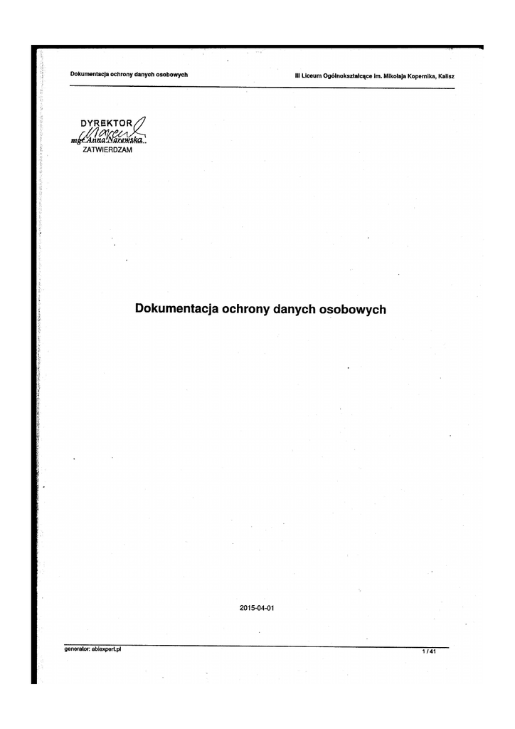 Dokumentacja ochrony danych osobowych III Liceum Ogólnokształcące im. Mikołaja Kopernika, Kalisz Spis treści 1. Wprowadzenie ............................................................................. 3 2. Podstawy prawne ........................................................................... 4 2.1. Ustawa oraz akty wykonawcze .................................................................. 4 2.2. Definicje ................................................................................ 4 3. Najważniejsze zagadnienia ochrony danych osobowych ............................................ 6 3.1. Generalny Inspektor Ochrony Danych Osobowych ..................................................... 6 3.2. Przetwarzanie danych ....................................................................... 7 3.3. Obowiązki informacyjne przy przetwarzaniu danych .................................................... 8 3.4. Obowiązek zgłaszania przetwarzanych danych ....................................................... 9 3.5. Powierzenie przetwarzania danych .............................................................. 10 3.6. Prawa osób, których dane dotyczą .............................................................. 10 3.7. Przekazywanie danych do państwa trzeciego ....................................................... 11 3.8. Dokumentowanie ......................................................................... 12 3.9. Sankcje karne ........................................................................... 13 4. Zagrożenia bezpieczeństwa .................................................................. 14 4.1. Charakterystyka możliwych zagrożeń ............................................................ 14 4.2. Lista potencjalnych zagrożeń przetwarzania danych ................................................... 14 5. Polityka bezpieczeństwa .................................................................... 16 5.1. Deklaracja .............................................................................. 16 5.2. Wykaz zbiorów osobowych ................................................................... 16 5.3. Wykaz miejsc przetwarzania .................................................................. 16 5.4. Opis struktury zbiorów osobowych .............................................................. 16 5.5. Sposób przepływu danych pomiędzy systemami ..................................................... 17 5.6. Ewidencja osób upoważnionych ................................................................ 17 5.7. Środki organizacyjne ochrony danych osobowych .................................................... 17 5.8. Środki techniczne - ochrona fizyczna ............................................................. 18 5.9. Środki techniczne - infrastruktura informatyczna ..................................................... 19 5.10. Środki techniczne - programy i bazy danych ....................................................... 19 5.11. Zadania Administratora bezpieczeństwa informacji ................................................... 20 5.12. Zadania Administratora systemu informatycznego ................................................... 21 6. Instrukcja zarządzania systemem informatycznym ................................................ 6.1. Charakterystyka systemu .................................................................... 6.2. Ogólne zasady pracy w systemie informatycznym .................................................... 6.3. Procedury nadawania uprawnień ............................................................... 6.4. Stosowane metody i środki uwierzytelniania ........................................................ 6.5. Procedury rozpoczęcia, zawieszenia i zakończenia pracy ............................................... 6.6. Procedury tworzenia kopii awaryjnych ........................................................... 6.7. Sposób, miejsce i okres przechowywania elektronicznych nośników informacji .................................. 6.8. Sposób zabezpieczenia systemu przed wirusami ..................................................... 6.9. Informacje o odbiorcach danych ................................................................ 6.10. Przesyłanie danych poza obszar przetwarzania ..................................................... 6.11. Procedury wykonywania przeglądów i konserwacji ................................................... 7. Załącznik nr 1 ............................................................................. 8. Załącznik nr 2 ............................................................................. 9. Załącznik nr 3 ............................................................................. generator: abiexpert.pl 2 / 41 22 22 22 22 23 23 24 25 25 25 26 26 27 36 37 Dokumentacja ochrony danych osobowych III Liceum Ogólnokształcące im. Mikołaja Kopernika, Kalisz 1. Wprowadzenie Celem niniejszego dokumentu jest opisanie zasad ochrony danych osobowych oraz dostarczenie podstawowej wiedzy z zakresu ich przetwarzania. W celu zwiększenia świadomości obowiązków i odpowiedzialności pracowników, a tym samym skuteczności ochrony przetwarzanych zasobów, w dokumencie opisano podstawy prawne przetwarzania danych osobowych oraz scharakteryzowano zagrożenia bezpieczeństwa, podając jednocześnie schematy postępowań na wypadek wystąpienia naruszenia bezpieczeństwa. Dokument szczegółowo opisuje podstawowe zasady organizacji pracy przy zbiorach osobowych przetwarzanych metodami tradycyjnymi oraz w systemie informatycznym wyrażone w Polityce bezpieczeństwa oraz w Instrukcji zarządzania systemem informatycznym służącym do przetwarzania danych osobowych. Wszelkie zestawienia uzupełniające treść dokumentu zebrano w postaci załączników. Do najważniejszych należy ewidencja zbiorów osobowych, miejsc ich przetwarzania oraz osób upoważnionych do przetwarzania danyc