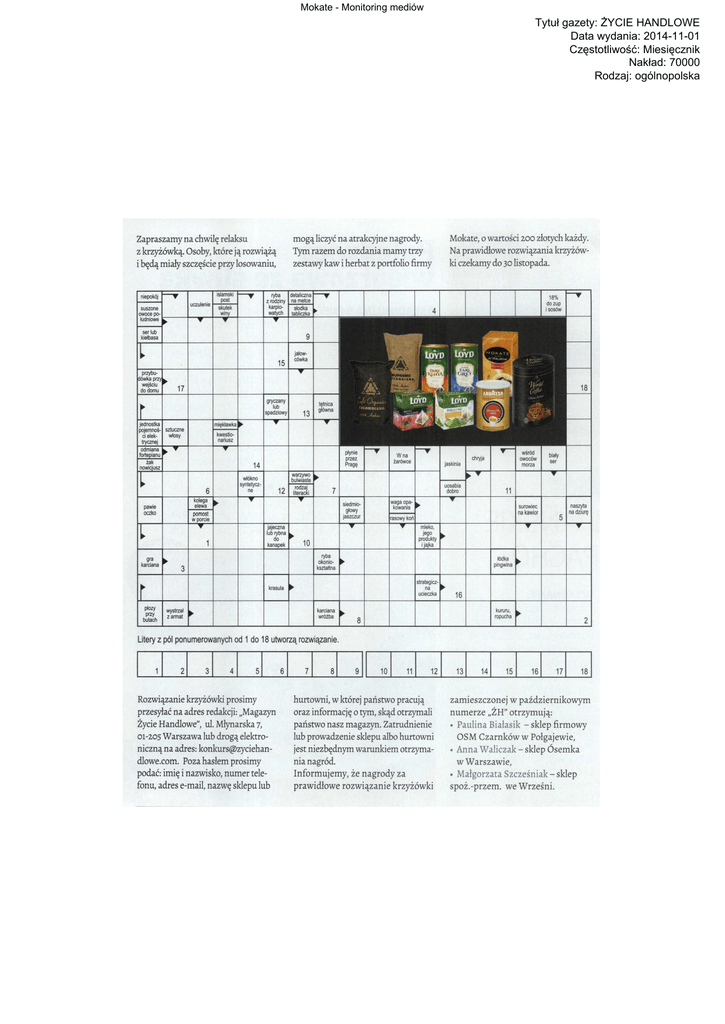 Mokate - Monitoring mediów Tytu³ gazety: ¯YCIE HANDLOWE Data wydania: 2014-11-01 Czêstotliwo¶æ: Miesiêcznik Nak³ad: 70000 Rodzaj: ogólnopolska Zapraszamy na chwilę relaksu z krzyżówką. Osoby, które ją rozwiążą i będą miafy szczęście przy losowaniu, niepoko islamski post suszone owoce po. :r :>,ve skutek mogą liczyć na atrakcyjne nagrody. Tym razem do rozdania mamy trzy zestawy kaw i herbat z portfolio firmy Mokate, owartości 200 złotych każdy, Na prawidłowe rozwiązania krzyżówki czekamy do 30 listopada. detaliczna ryba z rodziny na metce karpiowatych do zup T ser lub kiełbasa przybu dówka wejściu do domu gryczany lub spadziowy jednostka pojemnoś :i elek trycznej miekławka • • kwestio nariusz • odmiana fortepianu W na żarówce nowigusz włókno syntetycz- siedmio głowy pomost w porcie jajeczna lub rybna do kanapek waga opa kowania laszczur rasowy kon T • surowiec na kawior mleko, jego produkty yajka ryba okoniokształtna gra <arciana naszyta na dziurę łódka pingwina strategicz a JC:ćC.>.5 wystrzał z armat kururu ropucha karciana wróżba Litery z pól ponumerowanych od 1 do 18 utworzą rozwiązanie. 13 Rozwiązanie krzyżówki prosimy przesyłać na adres redakcji: „Magazyn Życie Handlowe", ul. Młynarska 7, 01-205 Warszawa lub drogą elektro niczną na adres: konkurs(®zyciehandlowe.com. Poza hasłem prosimy podać: imię i nazwisko, numer tele fonu, adres e-mail, nazwę sklepu lub hurtowni, w której państwo pracują oraz informację o tym, skąd otrzymali państwo nasz magazyn. Zatrudnienie lub prowadzenie sklepu albo hurtowni jest niezbędnym warunkiem otrzyma nia nagród. Informujemy, że nagrody za prawidłowe rozwiązanie krzyżówki 18 zamieszczonej w październikowym numerze „ŻH" otrzymują: • Paulina Bialasik - sklep firmowy OSM Czarnków w Połgajewie, • Anna Waliczak - sklep Ósemka w Warszawie, • Małgorzata Szcześniak - sklep spoż.-przem. we Wrześni.