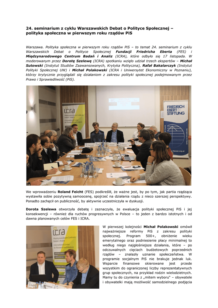 24. seminarium z cyklu Warszawskich Debat o Polityce Społecznej – polityka społeczna w pierwszym roku rządów PiS Warszawa. Polityka społeczna w pierwszym roku rządów PiS – to temat 24. seminarium z cyklu Warszawskich Debat o Polityce Społecznej Fundacji Friedricha Eberta (FES) i Międzynarodowego Centrum Badań i Analiz (ICRA), które odbyło się 17 listopada. W moderowanym przez Dorotę Szelewę (ICRA) spotkaniu wzięło udział trzech ekspertów – Michał Sutowski (Instytut Studiów Zaawansowanych, Krytyka Polityczna), Rafał Bakalarczyk (Instytut Polityki Społecznej UW) i Michał Polakowski (ICRA i Uniwersytet Ekonomiczny w Poznaniu), którzy krytycznie przyglądali się działaniom z zakresu polityki społecznej podejmowanym przez Prawo i Sprawiedliwość (PiS). We wprowadzeniu Roland Feicht (FES) podkreślił, że ważne jest, by po tym, jak partia rządząca wystawiła sobie pozytywną samoocenę, spojrzeć na działania rządu z nieco szerszej perspektywy. Ponadto zachęcił on publiczność, by aktywnie uczestniczyła w dyskusji. Dorota Szelewa otworzyła debatę i zaznaczyła, że ewaluacja polityki społecznej PiS i jej konsekwencji – również dla ruchów progresywnych w Polsce – to jeden z bardzo istotnych i od dawna planowanych celów FES i ICRA. W pierwszej kolejności Michał Polakowski omówił najważniejsze reformy PiS z zakresu polityki społecznej. Program 500+, obniżenie wieku emerytalnego oraz podniesienie płacy minimalnej to według niego najgłośniejsze działania, które – po odczuwalnych cięciach budżetowych poprzednich rządów – znalazły uznanie społeczeństwa. W programie socjalnym PiS nie brakuje jednak luk. Wsparcie finansowe skierowane jest przede wszystkim do ograniczonej liczby reprezentatywnych grup społecznych, na przykład rodzin wielodzietnych. Mamy tu do czynienia z „mitem wyboru“ – obywatele i obywatelki mają możliwość samodzielnego podjęcia decyzji, na co przeznaczą środki. Co do zasady jest jeszcze zbyt wcześnie na ocenę konsekwencji programu 500+, ale już staje się jasne, że skutkiem zachęcania matek do pozostania w domach jest marginalizacja opieki nad dziećmi i kształcenia w placówkach publicznych, a stabilność finansowa podjętych działań pozostawia wiele do życzenia. Rafał Bakalarczyk zauważył, że odpowiednią presję na Prawo i Sprawiedliwość można wywrzeć wyłącznie poprzez debatę nad polityką społeczną partii. Lewica zbyt rzadko podejmuje ten temat, swoje niezadowolenie wyrażając raczej w stosunku do innych obszarów. Ważne jest jednak, by trzonem debaty publicznej było wzmacnianie marginalizowanych grup i ujawnianie słabości polityki społecznej partii rządzącej. W debacie społecznej i politycznej zaniedbywana jest na przykład kwestia opieki nad dziećmi z niepełnosprawnością. Ponadto PiS uprawia „niezrównoważoną politykę społeczną“, której podstawą są transfery finansowe. Partia usiłuje zdobyć popularność i zaskarbić sobie sympatię konserwatywnych wyborców kosztem licznych grup społecznych, które zaniedbuje. Brakuje inicjatyw mających na celu aktywizację zawodową. W swojej narracji partia mówi o naprawianiu błędów popełnionych przez poprzedni rząd, jednak istniejący system socjalny nie jest ulepszany, a jedynie uzupełniany o nowe programy, co czynni go nieefektywnym. Michał Sutowski zwrócił uwagę na to, że Polacy i Polki dosyć pozytywnie oceniają dotychczasowe działania podjęte przez PiS w zakresie polityki społecznej. Partia rządząca w ekspresowym tempie zaspokaja oczekiwania obywateli i obywatelek. PiS wprawił jednak przy tym w ruch interwencjonizm państwowy na dużą skalę – w długiej perspektywie będzie on nie do zatrzymania. Ekspert przywołał liczne aspekty w rządach PiS, które mogłyby spotkać się z otwartą krytyką partii lewicowych. Do solidarności społecznej i wolności przyczyniają się nie świadczenia finansowe – którymi partia tak chętnie szafuje – ale rozbudowa instytucji socjalnych. Ponadto program społeczny PiS, na przykład reforma emerytalna, pogłębia tylko nierówności społeczne. Według Michała Sutowskiego problem tkwi przede wszystkim w demobilizacji przeciwników prawicy, która umożliwia zwycięstwo małym ugrupowaniom populistycznym – co ekspert zobrazował na przykładzie sukcesu Donalda Trumpa. Opozycja liberalna i socjaldemokratyczna w Polsce musi się zjednoczyć, by mieć szansę w kolejnych wyborach. Pod koniec spotkania do dyskusji na temat programu socjalnego PiS włączyła się publiczność. Niektórzy podkreślali problem wykluczenia osób żyjących w ubóstwie, bezrobotnych i zamieszkujących tereny wiejskie. Krytykowano jednak również lewą stronę sceny politycznej, która stała się „burżuazją“ i tym samym oddaliła się od obywateli. Programy takie jak jednorazowe świadczenie wypłacane ze względu na urodzenie dziecka z niepełnosprawnością mają na celu raczej zaskarbienie sobie sympatii wyborców w krótkiej perspektywie niż zapewnienie długofalowego wsparcia. Szczególnie często w dyskusji poruszano kwestię osób starszych i należnej im godnej emerytury. System emerytalny oceniono jako niesprawiedliwy (szczególnie z perspektywy pokoleniowej) i nierozsądny oraz trudny do sfinansowania w obliczu przyszłych wyzwań. Mając na względzie wnioski płynące z dyskusji, Bakalarczyk uwrażliwił uczestników i uczestniczki na to, by w dyskurs dotyczący polityki społecznej włączać również prawa osób z marginalizowanych grup społecznych. Polakowski ostrzegł natomiast przed emocjonalnie prowadzoną polityką partii rządzącej. Obywatelom i obywatelkom trzeba uświadamiać korzyści płynące z polityki społecznej o charakterze długofalowym, nawet jeśli w perspektywie krótkofalowej są one praktycznie nieodczuwalne. Właśnie to będzie stanowić wyzwanie dla opozycji przed nadchodzącymi wyborami.
