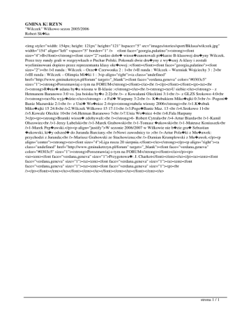GMINA K�RZYN "Wilczek" Wilkowo sezon 2005/2006 Robert Sk�ka <img style="width: 154px; height: 121px" height="121" hspace="5" src="images/stories/sport/Bklasa/wilczek.jpg" width="154" align="left" vspace="5" border="1" /> <font face="georgia,palatino"><strong><font size="4">B</font></strong><font size="2">ardzo dobr� wiosn�zanotowali pi�karze B-klasowej dru�yny Wilczek. Przez trzy rundy grali w rozgrywkach o Puchar Polski. Pokonali dwie dru�yny z wy�szej A-klasy i zostali wyeliminowani dopiero przez reprezentanta klasy okr�owej :</font></font><font face="georgia,palatino"><font size="2"><br />I runda : Wilczek – Orze� Czerwonka 2 : 1<br />II runda : Wilczek – Warmiak Wojciechy 3 : 2<br />III runda : Wilczek – Olimpia Mi�ki 1 : 3<p align="right"><a class="undefined" href="http://www.gminaketrzyn.pl/forum" target="_blank"><font face="verdana,geneva" color="#0303c5" size="1"><strong>Porozmawiaj o tym na FORUM</strong></font></a><br /></p></font></font><p><u><br /><strong>R�nie� udana by�a wiosna w B-klasie :</strong></u><br /><strong><u>U siebie:</u></strong> - z Hetmanem Baranowo 3:0 vo. [na boisku by�o 2:2]<br />- z Kowalami Oleckimi 3:1<br />- z GLZS Srokowo 4:0<br /><strong><u>Na wyje�dzie:</u></strong> - z Fal� Warpuny 3:2<br />- K�obukiem Miko�ajki 0:3<br />- Pogoni� Banie Mazurskie 2:1<br />- z Uni� Wo�nice 2:4<p><strong>tabela wiosny 2006</strong><br />1.K�obuk Miko�ajki 15 24:8<br />2.Wilczek Wilkowo 15 17:11<br />3.Pogo�Banie Maz. 13 <br />4.Srokowo 11<br />5.Kowale Oleckie 10<br />6.Hetman Baranowo 7<br />7.Unia Wo�nice 4<br />8.Fala Harpuny 3</p><p><strong>Bramki wiosn� zdobywali:<br /></strong>6- Robert Cytrala<br />4-Artur Biarda<br />1-Kamil Olszowiec<br />1-Jerzy Lubelski<br />1-Marek Grabowski<br />1-Tomasz �ukowski<br />1-Mateusz Koniuszek<br />1-Marek Pep�awski.</p><p align="justify">W sezonie 2006/2007 w Wilkowie nie b�zie gra� Sebastian �ukowski, kt�y odszed� do Juranda Barciany.<br />Nowi zawodnicy to ;<br />-Artur Pola�ki z Mu�awek: przychodzi z Juranda;<br />-Mariusz Grabowski ze Stachowizna;<br />-Damian Krumplewski z Mu�awek.</p><p align="center"><strong><u><font size="4">Liga rusza 20 sierpnia.</font></u></strong></p><p align="right"><a class="undefined" href="http://www.gminaketrzyn.pl/forum" target="_blank"><font face="verdana,geneva" color="#0303c5" size="1"><strong>Porozmawiaj o tym na FORUM</strong></font></a></p><p> <u><em><font face="verdana,geneva" size="1">Przygotowa�: J. Charkot</font></em></u></p><u><em><font face="verdana,geneva" size="1"><u><em><font face="verdana,geneva" size="1"><u><em><font face="verdana,geneva" size="1"><u><em><font face="verdana,geneva" size="1"><p><br /></p></font></em></u></font></em></u></font></em></u></font></em></u> strona 1 / 1