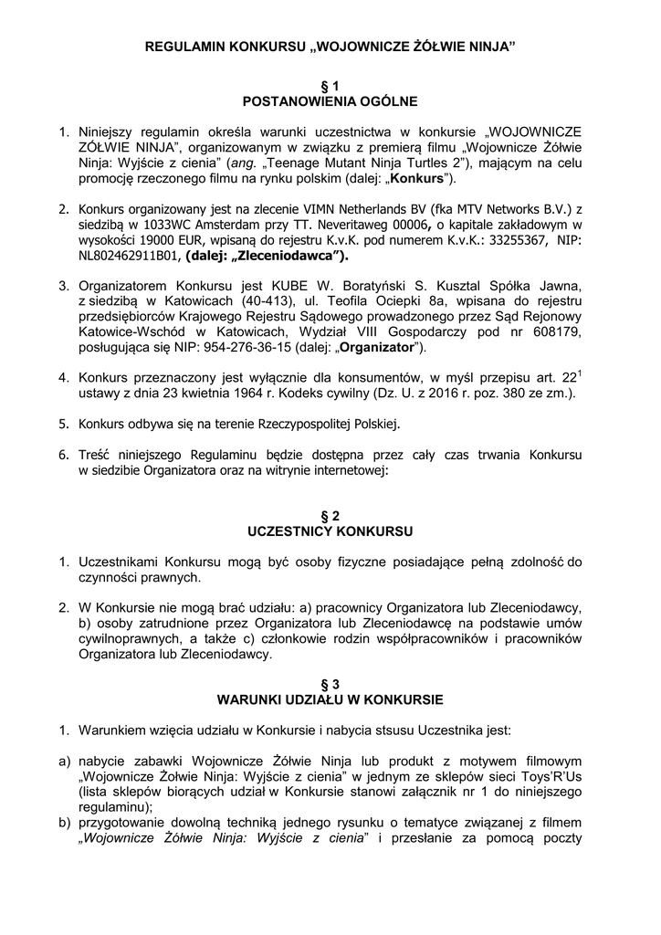 REGULAMIN KONKURSU „WOJOWNICZE ŻÓŁWIE NINJA” §1 POSTANOWIENIA OGÓLNE 1. Niniejszy regulamin określa warunki uczestnictwa w konkursie „WOJOWNICZE ZÓŁWIE NINJA”, organizowanym w związku z premierą filmu „Wojownicze Żółwie Ninja: Wyjście z cienia” (ang. „Teenage Mutant Ninja Turtles 2”), mającym na celu promocję rzeczonego filmu na rynku polskim (dalej: „Konkurs”). 2. Konkurs organizowany jest na zlecenie VIMN Netherlands BV (fka MTV Networks B.V.) z siedzibą w 1033WC Amsterdam przy TT. Neveritaweg 00006, o kapitale zakładowym w wysokości 19000 EUR, wpisaną do rejestru K.v.K. pod numerem K.v.K.: 33255367, NIP: NL802462911B01, (dalej: „Zleceniodawca”). 3. Organizatorem Konkursu jest KUBE W. Boratyński S. Kusztal Spółka Jawna, z siedzibą w Katowicach (40-413), ul. Teofila Ociepki 8a, wpisana do rejestru przedsiębiorców Krajowego Rejestru Sądowego prowadzonego przez Sąd Rejonowy Katowice-Wschód w Katowicach, Wydział VIII Gospodarczy pod nr 608179, posługująca się NIP: 954-276-36-15 (dalej: „Organizator”). 4. Konkurs przeznaczony jest wyłącznie dla konsumentów, w myśl przepisu art. 221 ustawy z dnia 23 kwietnia 1964 r. Kodeks cywilny (Dz. U. z 2016 r. poz. 380 ze zm.). 5. Konkurs odbywa się na terenie Rzeczypospolitej Polskiej. 6. Treść niniejszego Regulaminu będzie dostępna przez cały czas trwania Konkursu w siedzibie Organizatora oraz na witrynie internetowej: §2 UCZESTNICY KONKURSU 1. Uczestnikami Konkursu mogą być osoby fizyczne posiadające pełną zdolność do czynności prawnych. 2. W Konkursie nie mogą brać udziału: a) pracownicy Organizatora lub Zleceniodawcy, b) osoby zatrudnione przez Organizatora lub Zleceniodawcę na podstawie umów cywilnoprawnych, a także c) członkowie rodzin współpracowników i pracowników Organizatora lub Zleceniodawcy. §3 WARUNKI UDZIAŁU W KONKURSIE 1. Warunkiem wzięcia udziału w Konkursie i nabycia stsusu Uczestnika jest: a) nabycie zabawki Wojownicze Żółwie Ninja lub produkt z motywem filmowym „Wojownicze Żołwie Ninja: Wyjście z cienia” w jednym ze sklepów sieci Toys’R’Us (lista sklepów biorących udział w Konkursie stanowi załącznik nr 1 do niniejszego regulaminu); b) przygotowanie dowolną techniką jednego rysunku o tematyce związanej z filmem „Wojownicze Żółwie Ninja: Wyjście z cienia” i przesłanie za pomocą poczty REGULAMIN KONKURSU „WOJOWNICZE ŻÓŁWIE NINJA” elektronicznej (e-mail) jego zdjęcia lub skanu wraz ze skanem lub zdjęciem paragonu dokumentującym nabycie zabawki, o której mowa powyżej, a także imieniem i nazwiskiem uczestnika - na niniejszy adres Organizatora [email protected] (dalej: „Elektroniczne Zgłoszenie Konkursowe”) w terminie oznaczonym w § 3 pkt 3 niniejszego Regulaminu; c) akceptacja niniejszego regulaminu poprzez zamieszczenie w Elektronicznym Zgłoszeniu Konkursowym oświadczenia o następującej treści: „Zapoznałem się z treścią Regulaminu konkursu „Wojownicze Żółwie Ninja” organizowanego przez KUBE W. Boratyński S. Kusztal Spółka Jawna, z siedzibą w Katowicach, dostępnego pod adresem ______________ - i akceptuję jego postanowienia.” 2. Konkurs będzie trwał od dnia 3 czerwca 2016 r. (00:00) do dnia 1 lipca 2016 r. (24:00) włącznie. 3. Elektroniczne Zgłoszenia Konkursowe można przesyłać na wskazany wyżej adres e mail organizatora wyłącznie do godziny 24:00 dnia 1 lipca 2016 r. Elektroniczne Zgłoszenia konkursowe przesłane po tym terminie nie będą brały udziału w Konkursie. 4. Prace przesyłane w formie innej niż przewidziana w § 3 pkt 1 lit. b) niniejszego Regulaminu – w tym zwłaszcza z wykorzystaniem operatorów pocztowych – nie będą brały udziału w Konkursie. 5. Zakup jednej zabawki lub produktu związanego z filmem „Wojownicze Żółwie Ninja: Wyjscie z cienia” uprawnia do przesłania jednego Elektronicznego Zgłoszenia Konkursowego. 6. W przypadku, gdy po dokonaniu Elektronicznego Zgłoszenia Konkursowego przez Uczestnika dojdzie do rozwiązania umowy udokumentowanej danym paragonem, w szczególności na skutek odstąpienia lub wypowiedzenia, bez względu na przyczynę tych zdarzeń – Uczestnik zobowiązany jest niezwłocznie poinformować o tym Organizatora. Dotyczy to w szczególności zwrotów zakupionych przez Uczestnika Zabawek, dokonanych za zgodą sprzedawcy lub z uwagi na ujawnione wady. 7. W przypadku wskazanym w ust. 6 Organizator ma prawo uznać dane Elektroniczne Zgłoszenie Konkursowe za niebyłe, a jeżeli w wyniku jego dokonania Uczestnik nabył prawo do otrzymania Vouchera lub go odebrał - ma prawo odpowiednio odmówić wydania Vouchera lub żądać jego zwrotu. Voucher taki wraca do puli nagród dostępnych w Konkursie, a w razie wcześniejszego zakończenia konkursu – pozostaje własnością Organizatora. §4 UPRAWNIENIA ORGANIZATORA Organizator ma prawo w szczególności: 1) pomijać (weryfikować) zgłoszenia do Konkursu, które nie spełniają wymogów, o których mowa w § 3 pkt 1 niniejszego Regulaminu, jak też te, których treść może zostać uznana za sprzeczną z powszechnie obowiązującymi przepisami, REGULAMIN KONKURSU „WOJOWNICZE ŻÓŁWIE NINJA” naruszającą prawa lub dobra osobiste jakiejkolwiek osoby, wulgarną bądź obelżywą. 2) usuwać z Konkursu prace tych uczestników Konkursu, którzy naruszyli niniejszy Regulamin, a w szczególności ich prace naruszają wymogi określone w pkt. 1 powyżej. §5 NAGRODY 1. Nagrodami w Konkursie są Vouchery do wykorzystania w sieci kin należących do Cinema City Poland – CC Sp. z o.o. Sp. j., z siedzibą w Warszawie (02-768), przy ulicy Fosa 37 (dalej: „Voucher”) - o wartości 86,50 zł każdy. 2. Każdy Voucher uprawnia do odbioru w kasie kina Cinema City Poland – CC Sp. z o.o. Sp. j. dwóch biletów na film 3D znajdujący się w repertuarze kina Cimena City w okresie obowiązywania vouchera, i dwóch par okularów 3D oraz w barze danego kina Cin