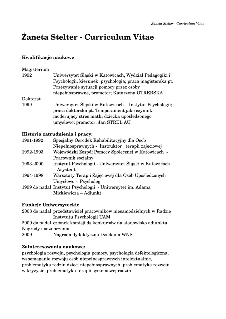 Żaneta Stelter Curriculum Vitae - Instytut Psychologii