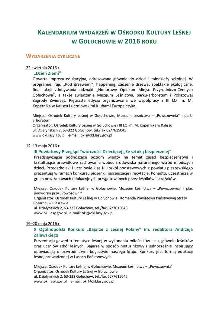 22 kwietnia 2016 r. „Dzień Ziemi” Otwarta impreza edukacyjna, adresowana głównie do dzieci i młodzieży szkolnej. W programie: rajd „Pod drzewami”, happening, sadzenie drzewa, spektakle ekologiczne, finał akcji zdobywania odznaki „Honorowy Opiekun Miejsc Przyrodniczo-Cennych Gołuchowa”, a także zwiedzanie Muzeum Leśnictwa, parku-arboretum i Pokazowej Zagrody Zwierząt. Piętnasta edycja organizowana we współpracy z III LO im. M. Kopernika w Kaliszu i uczniowskimi Klubami Europejczyka. Miejsce: Ośrodek Kultury Leśnej w Gołuchowie, Muzeum Leśnictwa – „Powozownia” i parkarboretum Organizator: Ośrodek Kultury Leśnej w Gołuchowie i III LO im. M. Kopernika w Kaliszu ul. Działyńskich 2, 63-322 Gołuchów, tel./fax 62/7615045 www.okl.lasy.gov.pl e-mail: [email protected] 12–13 maja 2016 r. III Powiatowy Przegląd Twórczości Dziecięcej „Ze sztuką bezpieczniej” Przedsięwzięcie podnoszące poziom wiedzy na temat zasad bezpieczeństwa i kształtujące prawidłowe zachowania wobec środowiska naturalnego wśród młodszych dzieci. Przedszkolaki i uczniowie klas I-III szkół podstawowych z powiatu pleszewskiego prezentują w ramach konkursu piosenki, inscenizacje i recytacje. Ponadto, uczestniczą w grach oraz zabawach edukacyjnych przygotowanych przez leśników i strażaków. Miejsce: Ośrodek Kultury Leśnej w Gołuchowie, Muzeum Leśnictwa – „Powozownia” i plac podworski przy „Powozowni” Organizator: Ośrodek Kultury Leśnej w Gołuchowie i Komenda Powiatowa Państwowej Straży Pożarnej w Pleszewie ul. Działyńskich 2, 63-322 Gołuchów, tel./fax 62/7615045 www.okl.lasy.gov.pl e-mail: [email protected] 19–20 maja 2016 r. X Ogólnopolski Konkurs „Bajarze z Leśnej Polany” im. redaktora Andrzeja Zalewskiego Prezentacja gawęd o tematyce leśnej w wykonaniu miłośników lasu, głównie leśników oraz uczniów szkół leśnych. Bajarze w sposób nietuzinkowy i jednocześnie inspirujący opowiadają o przyrodniczym bogactwie naszego kraju. Konkurs jest formą edukacji leśnej prowadzonej w Lasach Państwowych. Miejsce: Ośrodek Kultury Leśnej w Gołuchowie, Muzeum Leśnictwa – „Powozownia” Organizator: Ośrodek Kultury Leśnej w Gołuchowie ul. Działyńskich 2, 63-322 Gołuchów, tel./fax 62/7615045 www.okl.lasy.gov.pl e-mail: [email protected] 10 czerwca 2016 r. „Spotkanie z lasem” – festyn edukacyjny Jest to plenerowa, otwarta impreza o charakterze cyklicznym. Propozycja dla wszystkich, którzy kochają las i chcą poznawać jego tajemnice. Podczas festynu przeprowadzane będą zabawy i konkursy, młodzi aktorzy zaprezentują spektakle ekologiczne. Odbędą się pokazy rzemiosła związanego z lasem: otrzymywania dziegciu, pracy pilarzy, rzeźby w drewnie, a także warsztaty papieru czerpanego i zdobienia drewna. Miejsce: Ośrodek Kultury Leśnej w Gołuchowie Organizator: Ośrodek Kultury Leśnej w Gołuchowie ul. Działyńskich 2, 63-322 Gołuchów, tel./fax 62/7615045 www.okl.lasy.gov.pl e-mail: [email protected] 18 czerwca 2016 r. III Międzynarodowy Festiwal Kultury Leśnej i Łowieckiej Wydarzenie o charakterze otwartym, na które składają się Konkurs Sygnałów Łowieckich i Muzyki Myśliwskiej, pokazy wabiarzy zwierząt łownych, ptaków łowczych, psów myśliwskich oraz prowadzenie zabaw i konkursów o tematyce leśnej w ramach przygotowanych stoisk edukacyjnych. Miejsce: Ośrodek Kultury Leśnej w Gołuchowie Organizator: Ośrodek Kultury Leśnej w Gołuchowie ul. Działyńskich 2, 63-322 Gołuchów, tel./fax 62/7615045 www.okl.lasy.gov.pl e-mail: [email protected] 3 września 2016 r. Turniej Nalewek Leśnych i Pasztetów z Dziczyzny Turniej skierowany do pracowników i emerytów Państwowego Gospodarstwa Leśnego Lasy Państwowe. Jego celem są upowszechnianie wiedzy o produktach, tradycji spożywania pasztetów z dziczyzny i produkcji nalewek z roślin leśnych, przepisach oraz recepturach przekazywanych z pokolenia na pokolenie, obecnie częściowo zapomnianych i niepraktykowanych, a posiadających niezaprzeczalne walory smakowe. Miejsce: Ośrodek Kultury Leśnej w Gołuchowie Organizator: Ośrodek Kultury Leśnej w Gołuchowie ul. Działyńskich 2, 63-322 Gołuchów, tel./fax 62/7615045 www.okl.lasy.gov.pl e-mail: [email protected] 14–27 września 2016 r. Międzynarodowy plener artystyczny „Inspiracje leśne IV” Działania artystyczne profesjonalnych twórców w kategoriach: malarstwo, rzeźba w drewnie i fotografia zakończone wystawą prac poplenerowych w Muzeum Leśnictwa Miejsce: Ośrodek Kultury Leśnej w Gołuchowie Organizator: Ośrodek Kultury Leśnej w Gołuchowie ul. Działyńskich 2, 63-322 Gołuchów, tel./fax 62/7615045 www.okl.lasy.gov.pl e-mail: [email protected] • Wystawa „Rośliny chronione i rzadkie z terenu nadleśnictwa Turek” wystawa fotograficzna Danuty Lewandowskiej Miejsce: Muzeum Leśnictwa „Oficyna” Czas trwania: marzec 2016 r. • Nabytki Ośrodka Kultury Leśnej w latach 2013–2015 wystawa ze zbiorów własnych Ośrodka Kultury Leśnej Miejsce: Muzeum Leśnictwa „Oficyna” Czas trwania: kwiecień – czerwiec 2016 r. • Wystawa autorska Anny Dryl-Marciniak obrazy na korze Miejsce: Muzeum Leśnictwa „Oficyna” Czas wystawy: lipiec – sierpień 2016 r. • Wystawa „Las i okolice” współczesna twórczość potomków Ludomira Benedyktowicza Miejsce: Muzeum Leśnictwa „Oficyna” Czas trwania: lipiec – grudzień 2015 • Wystawa „Drzewom bliżej do lasu” wystawa fotograficzna Anny Bogdanowskiej, prezentacja połączona z prelekcją autorską Miejsce: Muzeum Leśnictwa „Powozownia” Czas: wrzesień – grudzień 2016 r. • Wystawa „Szabla obca stosowana w wojsku polskim w latach 1792–1945” szable ze zbiorów Pawła Korzeniowskiego Miejsce: Muzeum Leśnictwa „Oficyna” Czas trwania: wrzesień 2016 r. – kwiecień 2017 r. • Wystawa prac powstałych podczas pleneru „Inspiracje leśne IV” malarstwo, rzeźba, fotografia Miejsc