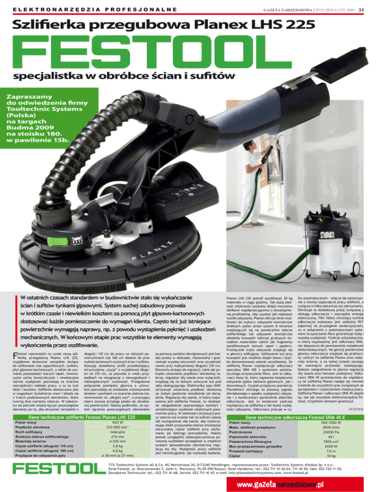 Elektronarzędzia profesjonalne GAZETA NARZĘDZIOWA | STYCZEŃ LUTY 2009 33 Szlifierka przegubowa Planex LHS 225 specjalistka w obróbce ścian i sufitów Zapraszamy do odwiedzenia firmy Tooltechnic Systems (Polska) na targach Budma 2009 na stoisku 180. w pawilonie 15b. W ostatnich czasach standardem w budownictwie stało się wykańczanie ścian i sufitów tynkami gipsowymi. System suchej zabudowy pozwala w krótkim czasie i niewielkim kosztem za pomocą płyt gipsowo-kartonowych dostosować każde pomieszczenie do wymagań klienta. Często też już istniejące powierzchnie wymagają naprawy, np. z powodu wystąpienia pęknięć i uszkodzeń mechanicznych. W końcowym etapie prac wszystkie te elementy wymagają wykończenia przez oszlifowanie. F estool wprowadził na rynek nową szlifierkę przegubową Planex LHS 225, wyjątkowo skuteczne narzędzie służące do szlifowania mas szpachlowych, tynków, płyt gipsowo kartonowych, a także do usuwania pozostałości starych tapet. Innowacyjne cechy konstrukcyjne i rewelacyjna wprost wydajność pozwalają na znaczne oszczędności nakładu pracy, a co za tym idzie i kosztów. Szlifierka dostarczana jest w wygodnym Systainerze maxi i składa się z trzech podstawowych elementów, które tworzą dwa warianty robocze. W zależności od potrzeb można łączyć poszczególne elementy po to, aby otrzymać narzędzie o długości 110 cm do pracy na niższych powierzchniach lub 160 cm idealne do prac wykończeniowych wyższych ścian i sufitów. Stosując dodatkowy profil przedłużający, otrzymujemy „szyję” o wyjątkowej długości aż 210 cm, co pozwala w wielu przypadkach na rezygnację z niewygodnych i niebezpiecznych rusztowań. Przegubowe połączenia pomiędzy głowicą a uchwytem pozwalają na swobodne wykonywanie skrętów i pochyleń co znacznie ułatwia manewrowanie na „długiej szyi”, a pracujący talerz zawsze przylega płasko do obrabianej powierzchni. Należy podkreślić, że system łączenia poszczególnych elementów Dane techniczne szlifierki Festool Planex LHS 225 Pobór mocy Prędkość obrotowa Ruch szlifujący Średnica talerza szlifierskiego Materiały ścierne Ciężar szlifierki (długość 110 cm) Ciężar szlifierki (długość 160 cm) Przyłącze do odsysania pyłu 500 W 310-920 min-1 rotacyjny 215 mm Ø 225 mm 3,8 kg 4,6 kg Ø 36 mm (Ø 27 mm) za pomocą zamków dźwigniowych jest bardzo prosty w obsłudze, niezawodny i gwarantuje wysoką sztywność oraz szczelność nawet przy maksymalnej długości 210 cm. Elementy służące do regulacji, takie jak pokrętło ustawiania prędkości obrotowej talerza, regulator siły ssania oraz wyłącznik, znajdują się na dolnym uchwycie tuż pod ręką obsługującego. Elektronika typu MMC utrzymuje ustawioną prędkość obrotową na stałym poziomie niezależnie od obciążenia. Regulacja siły ssania, w którą wyposażona jest szlifierka Festool, to niezbędne udogodnienie poprawiające komfort i umożliwiające uzyskanie właściwych parametrów pracy. W zależności od pozycji pracy talerza (na ścianie lub na suficie) należy tak wyregulować siłę ssania, aby wykorzystując efekt przysysania talerza zmniejszyć odczuwalny ciężar szlifierki przy zachowaniu jej dobrego prowadzenia. Należy jednak uwzględnić niebezpieczeństwo powstania wyżłobień szczególnie w miękkich tynkach spowodowane niewłaściwą regulacją tej siły. Wydajność pracy szlifierki jest niewiarygodna: jak wykazały badania, Planex LHS 225 potrafi zeszlifować 30 kg materiału w ciągu godziny. Tak dużą zdolność zdzierania uzyskano dzięki mocnemu silnikowi współpracującemu z dwustopniową przekładnią. Aby uzyskać jak najlepsze wyniki odsysania, Planex oferuje dwie możliwości do wyboru: odsysanie wewnętrzne drobnych pyłów przez system 8 otworów znajdujących się na powierzchni talerza szlifierskiego lub odsysanie zewnętrzne (dookoła krawędzi talerza) grubszych kawałków materiałów takich jak fragmenty zeszlifowanych starych tapet i papieru. Przełącznik trybu odsysania znajduje się w głowicy szlifującej. Szlifowanie tuż przy krawędzi jest możliwe dzięki łatwo i szybko demontowanej osłonie szczotkowej. Ze szlifierką Planex współpracuje odkurzacz specjalny SRM 45E z systemem automatycznego oczyszczania filtra. Jest to odkurzacz klasy M, który zapewnia bezpieczne odsysanie pyłów zarówno gipsowych, jak i drewnianych. Czujnik przepływu powietrza FlowDetect ostrzega za pomocą sygnału dźwiękowego o spadku wydajności odsysania i o konieczności opróżnienia zbiornika odkurzacza. Jest to konieczne podczas współpracy ze szlifierką o tak dużej wydajności odsysania. Odkurzacz pracuje w cy- klu automatycznym – włącza się samoczynnie z chwilą rozpoczęcia pracy szlifierki, a wyłącza w kilka sekund po jej zatrzymaniu. Eliminuje to dodatkową pracę związaną z obsługą odkurzacza i oszczędza energię elektryczną. Filtr falisty chroniący turbinę odkurzacza wykonany jest włókniny PET odpornej na przyleganie zanieczyszczeń, co w połączeniu z automatycznym systemem oczyszczania filtra gwarantuje stałą i wysoką wydajność. Funkcja antystatyczna, w którą wyposażony jest odkurzacz SRM, nie dopuszcza do powstawania wyładowań elektrostatycznych. Na górnej powierzchni głowicy odkurzacza znajduje się praktyczny uchwyt na szlifierkę Planex oraz materiały ścierne, a na tylnej ścianie zaczepy do nawinięcia przewodu zasilającego. Kolejne udogodnienie to płynna regulacja siły ssania oraz hamulec postojowy. Odkurzacz SRM 45 przeznaczony do współpracy ze szlifierką Planex nadaje się również świetnie do wszystkich prac związanych ze sprzątaniem i czyszczeniem miejsca pracy. Szlifierka Planex i odkurzacz SRM 45 objęte są, tak jak wszystkie elektronarzędzia Festool, trzyletnim okresem gwarancji. FESTOOL Dane techniczne odkurzacza Festool SRM 45 E Pobór mocy Maks. wielkość przepływu Podciśnienie Pojemność z
