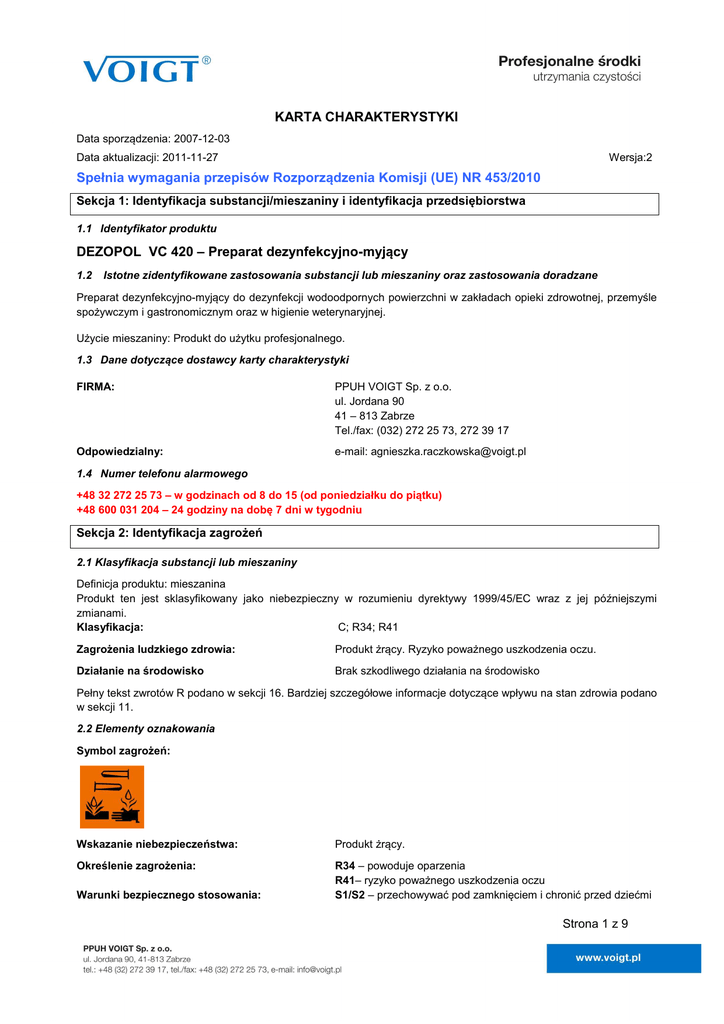 KARTA CHARAKTERYSTYKI Data sporządzenia: 2007-12-03 Data aktualizacji: 2011-11-27 Wersja:2 Spełnia wymagania przepisów Rozporządzenia Komisji (UE) NR 453/2010 Sekcja 1: Identyfikacja substancji/mieszaniny i identyfikacja przedsiębiorstwa 1.1 Identyfikator produktu DEZOPOL VC 420 – Preparat dezynfekcyjno-myjący 1.2 Istotne zidentyfikowane zastosowania substancji lub mieszaniny oraz zastosowania doradzane Preparat dezynfekcyjno-myjący do dezynfekcji wodoodpornych powierzchni w zakładach opieki zdrowotnej, przemyśle spożywczym i gastronomicznym oraz w higienie weterynaryjnej. Użycie mieszaniny: Produkt do użytku profesjonalnego. 1.3 Dane dotyczące dostawcy karty charakterystyki FIRMA: PPUH VOIGT Sp. z o.o. ul. Jordana 90 41 – 813 Zabrze Tel./fax: (032) 272 25 73, 272 39 17 Odpowiedzialny: e-mail: [email protected] 1.4 Numer telefonu alarmowego +48 32 272 25 73 – w godzinach od 8 do 15 (od poniedziałku do piątku) +48 600 031 204 – 24 godziny na dobę 7 dni w tygodniu Sekcja 2: Identyfikacja zagrożeń 2.1 Klasyfikacja substancji lub mieszaniny Definicja produktu: mieszanina Produkt ten jest sklasyfikowany jako niebezpieczny w rozumieniu dyrektywy 1999/45/EC wraz z jej późniejszymi zmianami. Klasyfikacja: C; R34; R41 Zagrożenia ludzkiego zdrowia: Produkt żrący. Ryzyko poważnego uszkodzenia oczu. Działanie na środowisko Brak szkodliwego działania na środowisko Pełny tekst zwrotów R podano w sekcji 16. Bardziej szczegółowe informacje dotyczące wpływu na stan zdrowia podano w sekcji 11. 2.2 Elementy oznakowania Symbol zagrożeń: Wskazanie niebezpieczeństwa: Produkt żrący. Określenie zagrożenia: R34 – powoduje oparzenia R41– ryzyko poważnego uszkodzenia oczu S1/S2 – przechowywać pod zamknięciem i chronić przed dziećmi Warunki bezpiecznego stosowania: Strona 1 z 9 S26 – zanieczyszczone oczy przemyć natychmiast dużą ilością wody i zasięgnąć porady lekarza S36 – nosić odpowiednią odzież ochronną S37/39 – nosić odpowiednie rękawice ochronne i okulary lub ochron® twarzy S45 - w przypadku awarii lub jeśli źle się poczujesz, niezwłocznie zasięgnij porady lekarza-jeżeli to możliwe, pokaż etykietę 2.3 Inne zagrożenia Brak. Sekcja 3: Skład/informacja o składnikach 3.1 Mieszaniny Nazwa Chemiczna Identyfikatory % Klasyfikacja 67/548/EWG Chlorek didecylodimetyloamonowy (roztwór wodnoalkoholowy) CAS: 7173-51-5 Nr WE: 230-525-2 Nr indeksowy: brak informacji Nr rejestracji: brak informacji <20 C; R34 Xn; R22 Rozporządzenie WE Nr 127/2008 [CLP] Acute Tox. 4; H 302 Skinn Corr. 1B; H 314 Komentarz części składowych: Pełna treść przytoczonych wskazówek dotyczących zagrożeń znajduje się w sekcji 16. Sekcja 4: Środki pierwszej pomocy 4.1 Opis środków pierwszej pomocy W razie dostania się do dróg oddechowych: Zapewnić dopływ świeżego powietrza. W przypadku nie ustąpienia objawów, wezwać pomoc medyczną Kontakt ze skórą: Spłukać skażoną skórę dużą ilością wody, zdjąć odzież, skontaktować się z lekarzem. Kontakt z oczami: Płukać przez kilka minut pod bieżącą wodą przy otwartych powiekach, nałożyć jałowy opatrunek, skontaktować się z lekarzem. Droga pokarmowa: Popić dużą ilością wody, nie wywoływać wymiotów, natychmiast skontaktować się z lekarzem. 4.2 Najważniejsze ostre i opóźnione objawy oraz skutki narażenia Potencjalne ostre narażenie na zdrowie: Może wywoływać podrażnienia skóry i oczu. Może powodować podrażnienia gardła, żołądka. Objawy wynikające z nadmiernej ekspozycji: Kontakt z okiem: ból, łzawienie, zaczerwienienie. Kontakt ze skórą: poparzenie, zaczerwienienie. Spożycie: nudności, ból żołądka. 4.3 Wskazania dotyczące wszelkiej natychmiastowej pomocy lekarskiej i szczególne postępowania z poszkodowanym Wskazówki dla lekarza: Leczenie objawowe. Sekcja 5: Postępowanie w przypadku pożaru 5.1 Środki gaśnicze Stosowany środek gaszący: Użyć środka gaśniczego odpowiedniego dla otaczającego ognia Strona 2 z 9 Niewłaściwe środki gaśnicze: Nie znane. 5.2 Szczególne zagrożenia związane z substancją lub mieszaniną W wyniku pożaru mogą tworzyć się szkodliwe dla zdrowia opary – stosować środki ochrony dróg oddechowych. 5.3 Informacje dla straży pożarnej Specjalny sprzęt ochronny dla strażaków: Podstawowy sprzęt ochrony osobistej oraz indywidualne aparaty oddechowe. Podstawowy poziom ochrony podczas wypadków chemicznych zapewnia odzież stosowana przez strażaków (włączając hełmy, buty ochronne i rękawice). Dodatkowe wskazówki: Pozostałości po pożarze i zanieczyszczoną wodę używaną do gaszenia ognia, muszą być usunięte zgodnie z przepisami. Sekcja 6: Postępowanie w przypadku niezamierzonego uwolnienia do środowiska 6.1 Indywidualne środki ostrożności, wyposażenie ochronne i procedury w sytuacjach awaryjnych Dla osób nienależących do personelu udzielającego pomocy: Dla osób udzielających pomocy: Nie należy podejmować żadnych działań, które stwarzałyby ryzyko dla kogokolwiek chyba, że jest się odpowiednio przeszkolonym. Nie dotykać, ani nie przechodzić po rozlanym materiale. Stosować środki ochrony indywidualnej. Unikać zanieczyszczenia oczu i skóry. Zapewnić odpowiednią wentylację. Dopilnować, aby usuwanie awarii i jej skutków przeprowadzał wyłącznie przeszkolony personel. Stosować środki ochrony indywidualnej. 6.2 Środki ostrożności w zakresie ochrony środowiska W przypadku uwolnienia większych ilości preparatu należy niedopuścić do rozprzestrzenienia się w środowisku naturalnym. Powiadomić odpowiednie służby ratownicze. 6.3 Metody i materiały zapobiegające rozprzestrzenianiu się skażenia i służące do usuwania skażenia Metody zapobiegające rozprzestrzenianiu się wycieku: Metody likwidacji wycieku: O ile to możliwe zlikwidować wyciek, uszczelnić, uszkodzone opakowania umieścić w pojemniku ochronnym. miejsca gromadzenia się cie