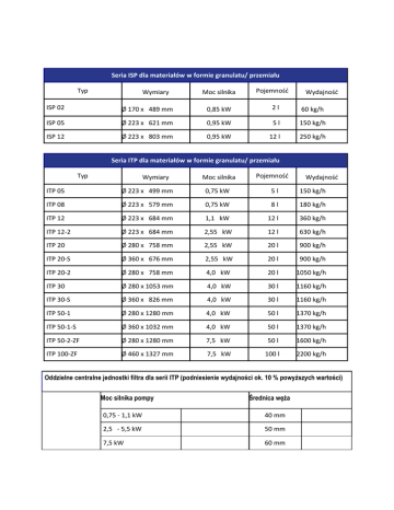 Seria ISP dla materiałów w formie granulatu/ przemiału Typ Wymiary Moc silnika Pojemność Wydajność ISP 02 Ø 170 x 489 mm 0,85 kW 2 l 60 kg/h ISP 05 Ø 223 x 621 mm 0,95 kW 5 l 150 kg/h ISP 12 Ø 223 x 803 mm 0,95 kW 12 l 250 kg/h Seria ITP dla materiałów w formie granulatu/ przemiału Typ Wymiary Moc silnika Pojemność Wydajność ITP 05 Ø 223 x 499 mm 0,75 kW 5 l 150 kg/h ITP 08 Ø 223 x 579 mm 0,75 kW 8 l 180 kg/h ITP 12 Ø 223 x 684 mm 1,1 kW 12 l 360 kg/h ITP 12‐2 Ø 223 x 684 mm 2,55 kW 12 l 630 kg/h ITP 20 Ø 280 x 758 mm 2,55 kW 20 l 900 kg/h ITP 20‐S Ø 360 x 676 mm 2,55 kW 20 l 900 kg/h ITP 20‐2 Ø 280 x 758 mm 4,0 kW 20 l 1050 kg/h ITP 30 Ø 280 x 1053 mm 4,0 kW 30 l 1160 kg/h ITP 30‐S Ø 360 x 826 mm 4,0 kW 30 l 1160 kg/h ITP 50‐1 Ø 280 x 1280 mm 4,0 kW 50 l 1370 kg/h ITP 50‐1‐S Ø 360 x 1032 mm 4,0 kW 50 l 1370 kg/h ITP 50‐2‐ZF Ø 280 x 1280 mm 7,5 kW 50 l 1600 kg/h ITP 100‐ZF Ø 460 x 1327 mm 7,5 kW 100 l 2200 kg/h Oddzielne centralne jednostki filtra dla serii ITP (podniesienie wydajności ok. 10 % powyższych wartości) Moc silnika pompy Średnica węża 0,75 ‐ 1,1 kW 40 mm 2,5 ‐ 5,5 kW 50 mm 7,5 kW 60 mm Seria IAL dla materiałów w formie granulatu Typ Ø 170 x 333 Wymiary Moc silnika Pojemność 5‐6 bar max. max. 3m 1 l Wydajność 20 kg/h Seria IPL dla materiałów w formie proszku/ granulatu/ przemiału Ciśnienie powietrza Zużycie Objętość Ø 170 x 622 5‐6 bar max. 3,4 m3/h 2 l 120 kg/h IPL 10 Ø 280 x 817 5‐7 bar max. 5,5 m3/h 10 l 400 kg/h IPL 20 Ø 280 x 1056 5‐7 bar max. 7,5 m3/h 20 l 600 kg/h IPL 30 Ø 360 x 1138 5‐7 bar max. 10 m3/h 30 l 750 kg/h Typ (Venturi) Wymiary IPL 02 Wydajność Seria IPL‐P dla materiałów w formie proszku/ granulatu/ przemiału Typ (z pompą) Wymiary Ciśnienie powietrza Objętość Wydajność IPL‐P 20/40 Ø 360 x 970 Pompa 1,1 kW 20 l 320 kg/h IPL‐P 30/50 Ø 360 x 1110 Pompa 2,55 KW 30 l 720 kg/h IPL‐P 30/60 Ø 360 x 1365 Pompa 4 kW 30 l 960 kg/h IPL‐P 50/60 Ø 360 x 1565 Pompa 4 kW 50 l 1440 kg/h IPL‐P 80/70 Ø 360 x 2070 Pompa 7,5 kW 80 l 2400 kg/h