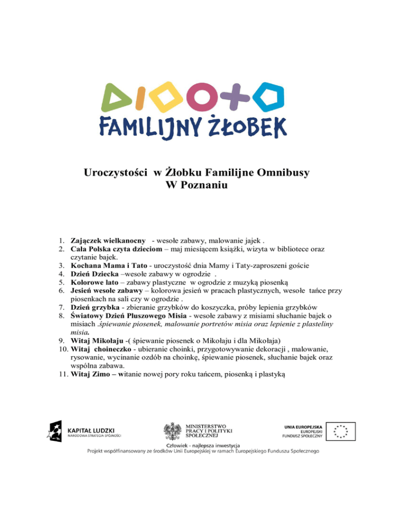 Uroczystości w Żłobku Familijne Omnibusy W Poznaniu 1. Zajączek wielkanocny - wesołe zabawy, malowanie jajek . 2. Cała Polska czyta dzieciom – maj miesiącem książki, wizyta w bibliotece oraz czytanie bajek. 3. Kochana Mama i Tato - uroczystość dnia Mamy i Taty-zaproszeni goście 4. Dzień Dziecka –wesołe zabawy w ogrodzie . 5. Kolorowe lato – zabawy plastyczne w ogrodzie z muzyką piosenką 6. Jesień wesołe zabawy – kolorowa jesień w pracach plastycznych, wesołe tańce przy piosenkach na sali czy w ogrodzie . 7. Dzień grzybka - zbieranie grzybków do koszyczka, próby lepienia grzybków 8. Światowy Dzień Pluszowego Misia - wesołe zabawy z misiami słuchanie bajek o misiach .śpiewanie piosenek, malowanie portretów misia oraz lepienie z plasteliny misia. 9. Witaj Mikołaju -( śpiewanie piosenek o Mikołaju i dla Mikołaja) 10. Witaj choineczko - ubieranie choinki, przygotowywanie dekoracji , malowanie, rysowanie, wycinanie ozdób na choinkę, śpiewanie piosenek, słuchanie bajek oraz wspólna zabawa. 11. Witaj Zimo – witanie nowej pory roku tańcem, piosenką i plastyką