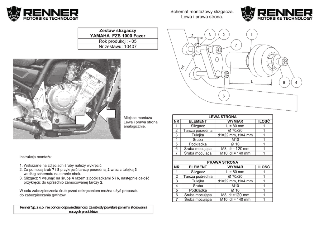 Schemat monta¿owy œlizgacza. Lewa i prawa strona. Zestaw œlizgaczy YAMAHA FZS 1000 Fazer Rok produkcji: -‘05 Nr zestawu: 10407 t1 3 2 1 d1 7 L 5 6 Miejsce monta¿u Lewa i prawa strona analogicznie. NR 1 2 3 4 5 6 7 LEWA STRONA ELEMENT WYMIAR Œlizgacz L = 80 mm Tarcza poœrednia Ø 70x20 Tulejka d1=22 mm, t1=4 mm Œruba M10 Podk³adka Ø 10 Œruba mocuj¹ca M8, d³ = 120 130 mm Œruba mocuj¹ca M10, d³ = 140 mm ILOŒÆ 1 1 1 1 1 1 1 NR 1 2 3 4 5 6 7 PRAWA STRONA ELEMENT WYMIAR Œlizgacz L = 80 mm Tarcza poœrednia Ø 70x20 Tulejka d1=22 mm, t1=4 mm Œruba M10 Podk³adka Ø 10 Œruba mocuj¹ca M8, d³ =120 130 mm Œruba mocuj¹ca M10, d³ = 140 mm ILOŒÆ 1 1 1 1 1 1 1 Instrukcja monta¿u: 1. Wskazane na zdjêciach œruby nale¿y wykrêciæ. 2. Za pomoc¹ œrub 7 i 8 przykrêciæ tarczê poœredni¹ 2 wraz z tulejk¹ 3 wed³ug schematu na stronie obok. 3. Œlizgacz 1 wsun¹æ na œrubê 4 razem z podk³adkami 5 i 6, nastêpnie ca³oœæ przykrêciæ do uprzednio zamocowanej tarczy 2. W celu zabezpieczenia œrub przed odkrêceniem mo¿na u¿yæ preparatu do zabezpieczania gwintów. Renner Sp. z o.o. nie ponosi odpowiedzialnoœci za szkody powsta³e pomimo stosowania naszych produktów. 4