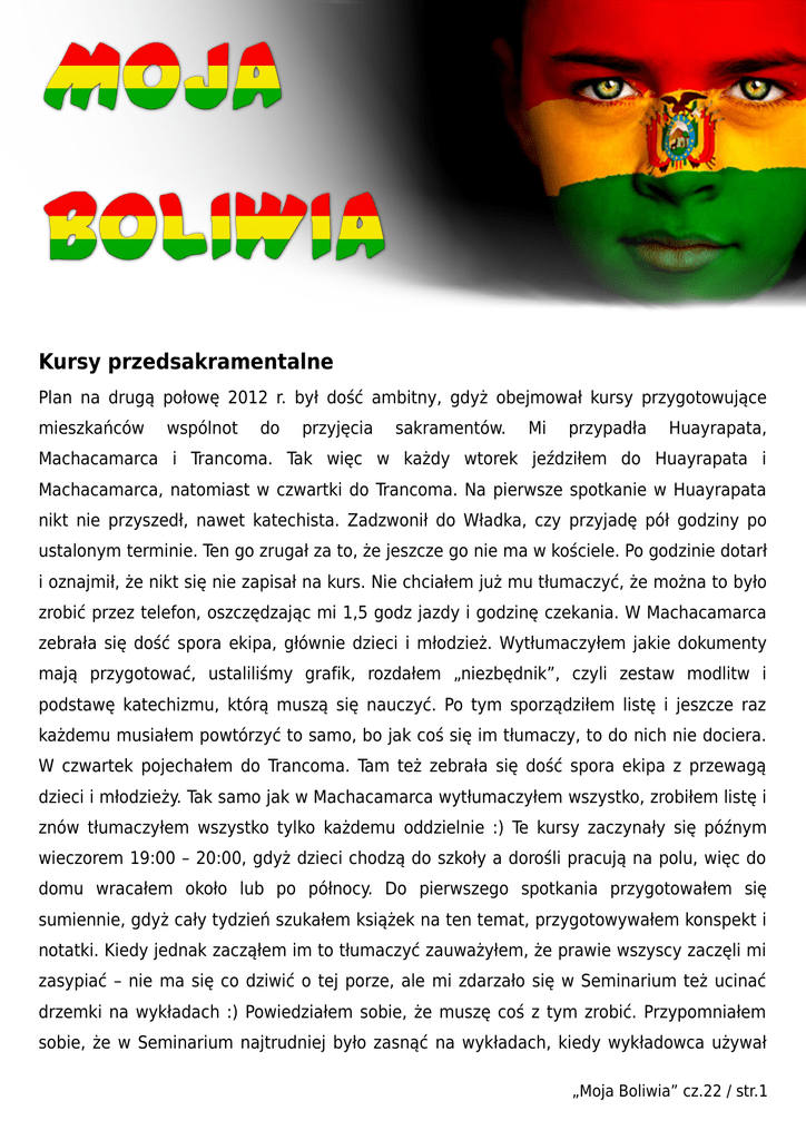 Kursy przedsakramentalne Plan na drugą połowę 2012 r. był dość ambitny, gdyż obejmował kursy przygotowujące mieszkańców wspólnot do przyjęcia sakramentów. Mi przypadła Huayrapata, Machacamarca i Trancoma. Tak więc w każdy wtorek jeździłem do Huayrapata i Machacamarca, natomiast w czwartki do Trancoma. Na pierwsze spotkanie w Huayrapata nikt nie przyszedł, nawet katechista. Zadzwonił do Władka, czy przyjadę pół godziny po ustalonym terminie. Ten go zrugał za to, że jeszcze go nie ma w kościele. Po godzinie dotarł i oznajmił, że nikt się nie zapisał na kurs. Nie chciałem już mu tłumaczyć, że można to było zrobić przez telefon, oszczędzając mi 1,5 godz jazdy i godzinę czekania. W Machacamarca zebrała się dość spora ekipa, głównie dzieci i młodzież. Wytłumaczyłem jakie dokumenty mają przygotować, ustaliliśmy grafik, rozdałem „niezbędnik”, czyli zestaw modlitw i podstawę katechizmu, którą muszą się nauczyć. Po tym sporządziłem listę i jeszcze raz każdemu musiałem powtórzyć to samo, bo jak coś się im tłumaczy, to do nich nie dociera. W czwartek pojechałem do Trancoma. Tam też zebrała się dość spora ekipa z przewagą dzieci i młodzieży. Tak samo jak w Machacamarca wytłumaczyłem wszystko, zrobiłem listę i znów tłumaczyłem wszystko tylko każdemu oddzielnie :) Te kursy zaczynały się późnym wieczorem 19:00 – 20:00, gdyż dzieci chodzą do szkoły a dorośli pracują na polu, więc do domu wracałem około lub po północy. Do pierwszego spotkania przygotowałem się sumiennie, gdyż cały tydzień szukałem książek na ten temat, przygotowywałem konspekt i notatki. Kiedy jednak zacząłem im to tłumaczyć zauważyłem, że prawie wszyscy zaczęli mi zasypiać – nie ma się co dziwić o tej porze, ale mi zdarzało się w Seminarium też ucinać drzemki na wykładach :) Powiedziałem sobie, że muszę coś z tym zrobić. Przypomniałem sobie, że w Seminarium najtrudniej było zasnąć na wykładach, kiedy wykładowca używał „Moja Boliwia” cz.22 / str.1 prezentacji z projektora. Postanowiłem, że też coś takiego przygotuję! :D No i tym samym zawiązałem sobie sznur na szyję, gdyż na przygotowanie ok. godzinnej prezentacji potrzebowałem cały tydzień! Dosłownie, cały tydzień! Najpierw przygotowanie planu, później szukanie materiałów, które mógłbym wykorzystać, przygotowanie tekstu po hiszpańsku, poproszenie kogoś o korektę i w końcu przygotowanie prezentacji. Poległem całkowicie czasowo, gdyż normalnie kończyłem przygotowania na godzinę przed wyjazdem. Poza tym nie było czasu na nic więcej, gdyż życie parafialne toczyło się bez zmian. W każdej wspólnocie zaplanowałem 4 zajęcia podzielone na tematy: moja wiara w Boga, Pismo Święte, Sakramenty ogólnie i szczegółowo Chrzest i Bierzmowanie, Spowiedź i Komunia św. Pomysł z rzutnikiem okazał się skuteczny, do tego po zajęciach puściłem im krótką kreskówkę z Pixar'a i wszyscy byli zadowoleni, choć niektórzy i tak spali, ale znając to doświadczenie, nikogo nie budziłem :) To wszystko odbywało się ogromnym kosztem, gdyż spałem raptem 5 godz. na dobę i poza tą całą karuzelą nie miałem czasu na nic innego. W połowie kursu pojawiło się przemęczenie i zaczęło mnie to już denerwować, ale z Bożą pomocą dotrwałem do końca. Dzięki temu sporo dorosłych przyjęło chrzest, mnóstwo dzieciaków I Komunię, no i uzbieraliśmy sporą grupę do Bierzmowania, które odbędzie się już w najbliższą niedzielę. Miał przyjechać biskup z La Paz, ale że jest już w podeszłym wieku, więc wysłał swojego reprezentanta. „Moja Boliwia” cz.22 / str.2