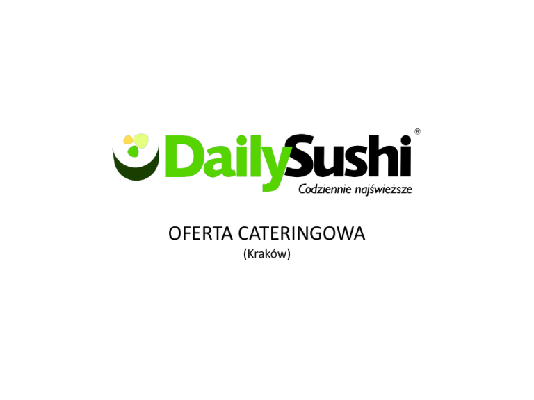 OFERTA CATERINGOWA (Kraków) WARUNKI OFERTY • • • • • • Minimalna kwota zamówienia, to 100zł, Zamówienie należy zgłosid z 48h wyprzedzeniem telefonicznie lub osobiście w dowolnym punkcie sprzedaży DailySushi, Odbiór osobisty w dowolnym punkcie sprzedaży DailySushi – bezpłatnie, Dostawa w obrębie Krakowa – bezpłatnie, Sushi dostarczane jest w jednorazowych pudełkach, Do każdego zamówienia bezpłatnie dodajemy sos sojowy, imbir marynowany oraz pałeczki. Niniejszy cennik nie stanowi oferty w rozumieniu przepisów Kodeksu Cywilnego oraz innych przepisów prawnych i nie przedstawia stanów magazynowych. OFERTA - HOSOMAKI Hosomaki, czyli sushi jednoskładnikowe. Hosomaki z: • Takuanem • Ogórkiem • Omletem • Tykwą • Paluszkiem krabowy • Łososiem • Tuoczykiem Cena za 3 szt. 2,70zł 2,70zł 2,70zł 2,90zł 3,40zł 4,60zł 5,70zł OFERTA - MAKI Maki, czyli sushi wieloskładnikowe. Maki: • Wegetariaoskie Cena za 2 szt. 3,40zł (takuan, tykwa, ogórek, warzywa marynowane) • Maki z tilapią 3,70zł (tilapia, omlet, sałata, serek kremowy) • Filadelfia 4,40zł (łosoś, awokado, sałata, serek kremowy) • Surimi (paluszek krabowy, łosoś, ogórek, majonez) 4,80zł OFERTA - URAMAKI Uramaki, czyli sushi wieloskładnikowe z ryżem na wierzchu. Uramaki: • Surimi Cena za 4 szt. 4,90zł (paluszek krabowy, awokado, ogórek, serek kremowy seza biały i czarny) • Łosoś na ostro 6,80zł (pieczona skóra z łososia, ogórek, przyprawa sichimi) • Tuoczyk na ostro (tuoczyk, awokado, serek kremowy, przyprawa sichimi) 9,00zł OFERTA - NIGIRI Nigiri, czyli porcja (kulka) ryżu z dodatkowym składnikiem np. rybą. Nigiri z: • Omletem • Krewetką • Makrelą • Łososiem • Kalmarem • Węgorzem • Ośmiornicą • Tuoczykiem Cena za 2 szt. 4,00zł 7,30zł 9,00zł 9,40zł 10,00zł 12,00zł 12,00zł 13,40zł USŁUGI DODATKOWE • • • • Przygotowanie sushi z innych składników lub innych rodzajów sushi nie wyszczególnionych w cenniku, Dania gorące kuchni japooskiej, Wypożyczenie zastawy japooskiej, Wynajem sushi master-a, który przygotowuje sushi w trakcie przyjęcia, Jeśli otwarci na Paostwa pomysły Zapraszamy do kontaktu…