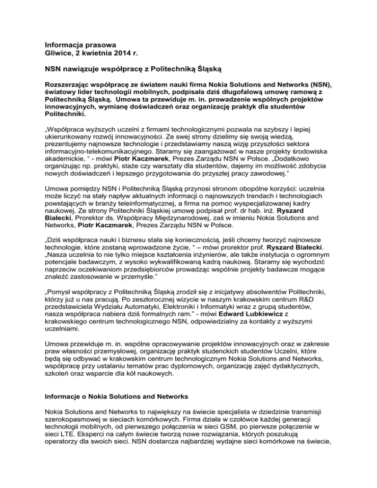 Informacja prasowa Gliwice, 2 kwietnia 2014 r. NSN nawiązuje współpracę z Politechniką Śląską Rozszerzając współpracę ze światem nauki firma Nokia Solutions and Networks (NSN), światowy lider technologii mobilnych, podpisała dziś długofalową umowę ramową z Politechniką Śląską. Umowa ta przewiduje m. in. prowadzenie wspólnych projektów innowacyjnych, wymianę doświadczeń oraz organizację praktyk dla studentów Politechniki. „Współpraca wyższych uczelni z firmami technologicznymi pozwala na szybszy i lepiej ukierunkowany rozwój innowacyjności. Ze swej strony dzielimy się swoją wiedzą, prezentujemy najnowsze technologie i przedstawiamy naszą wizję przyszłości sektora informacyjno-telekomunikacyjnego. Staramy się zaangażować w nasze projekty środowiska akademickie, “ - mówi Piotr Kaczmarek, Prezes Zarządu NSN w Polsce. „Dodatkowo organizując np. praktyki, staże czy warsztaty dla studentów, dajemy im możliwość zdobycia nowych doświadczeń i lepszego przygotowania do przyszłej pracy zawodowej.” Umowa pomiędzy NSN i Politechniką Śląską przynosi stronom obopólne korzyści: uczelnia może liczyć na stały napływ aktualnych informacji o najnowszych trendach i technologiach powstających w branży teleinformatycznej, a firma na pomoc wyspecjalizowanej kadry naukowej. Ze strony Politechniki Śląskiej umowę podpisał prof. dr hab. inż. Ryszard Białecki, Prorektor ds. Współpracy Międzynarodowej, zaś w imieniu Nokia Solutions and Networks, Piotr Kaczmarek, Prezes Zarządu NSN w Polsce. „Dziś współpraca nauki i biznesu stała się koniecznością, jeśli chcemy tworzyć najnowsze technologie, które zostaną wprowadzone życie, “ – mówi prorektor prof. Ryszard Białecki. „Nasza uczelnia to nie tylko miejsce kształcenia inżynierów, ale także instytucja o ogromnym potencjale badawczym, z wysoko wykwalifikowaną kadrą naukową. Staramy się wychodzić naprzeciw oczekiwaniom przedsiębiorców prowadząc wspólnie projekty badawcze mogące znaleźć zastosowanie w przemyśle.” „Pomysł współpracy z Politechniką Śląską zrodził się z inicjatywy absolwentów Politechniki, którzy już u nas pracują. Po zeszłorocznej wizycie w naszym krakowskim centrum R&D przedstawiciela Wydziału Automatyki, Elektroniki i Informatyki wraz z grupą studentów, nasza współpraca nabiera dziś formalnych ram.” - mówi Edward Lubkiewicz z krakowskiego centrum technologicznego NSN, odpowiedzialny za kontakty z wyższymi uczelniami. Umowa przewiduje m. in. wspólne opracowywanie projektów innowacyjnych oraz w zakresie praw własności przemysłowej, organizację praktyk studenckich studentów Uczelni, które będą się odbywać w krakowskim centrum technologicznym Nokia Solutions and Networks, współpracę przy ustalaniu tematów prac dyplomowych, organizację zajęć dydaktycznych, szkoleń oraz wsparcie dla kół naukowych. Informacje o Nokia Solutions and Networks Nokia Solutions and Networks to największy na świecie specjalista w dziedzinie transmisji szerokopasmowej w sieciach komórkowych. Firma działa w czołówce każdej generacji technologii mobilnych, od pierwszego połączenia w sieci GSM, po pierwsze połączenie w sieci LTE. Eksperci na całym świecie tworzą nowe rozwiązania, których poszukują operatorzy dla swoich sieci. NSN dostarcza najbardziej wydajne sieci komórkowe na świecie, wiedzę umożliwiającą maksymalne zwiększenie ich wartości oraz usługi, dzięki którym wszystkie te elementy perfekcyjnie ze sobą współpracują. Główna siedziba mieści się w Espoo w Finlandii. NSN działa w ponad 100 krajach. W 2013 roku przychody netto firmy wyniosły 11,3 mld euro. Więcej informacji: http://www.nsn.com/ NSN w Polsce jest czołowym dostawcą infrastruktury i usług dla operatorów komórkowych. Zatrudniamy już 2500 osób, z tego ponad 2100 pracowników w centrach R&D we Wrocławiu i Krakowie zajmuje się tworzeniem i weryfikacją oprogramowania i aplikacji dla sieci komórkowych. Centra R&D NSN są największą instytucję badawczo-rozwojową w branży ICT – technologii informacyjno-telekomunikacyjnych w Polsce i mogą pochwalić się jednymi z najnowocześniejszych laboratoriów w Europie. Informacje dla prasy Nokia Solutions and Networks Andrzej Styliński ELAT Executive Communications Tel. +48 660 430 098 E-mail: [email protected] Politechnika Śląska Paweł Doś Rzecznik prasowy Politechniki Śląskiej Kierownik Działu Promocji Tel/fax 0-32 237 11 81, kom. 609 427 091 E-Mail: [email protected]