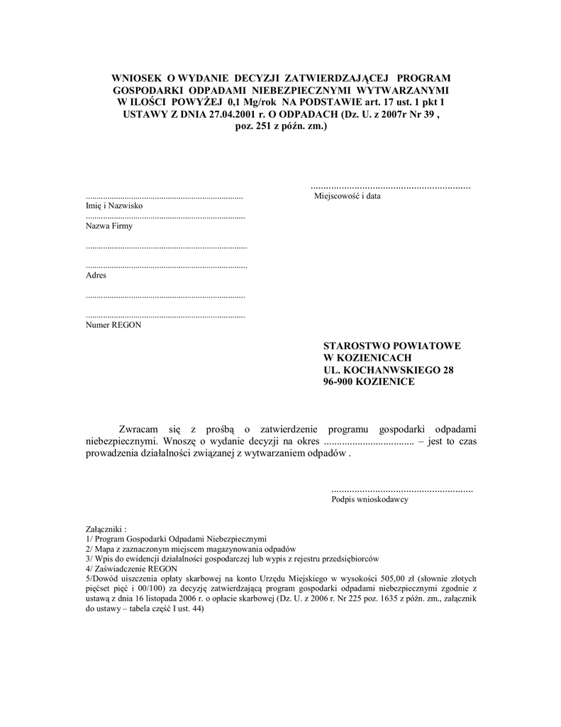 WNIOSEK O WYDANIE DECYZJI ZATWIERDZAJĄCEJ PROGRAM GOSPODARKI ODPADAMI NIEBEZPIECZNYMI WYTWARZANYMI W ILOŚCI POWYŻEJ 0,1 Mg/rok NA PODSTAWIE art. 17 ust. 1 pkt 1 USTAWY Z DNIA 27.04.2001 r. O ODPADACH (Dz. U. z 2007r Nr 39 , poz. 251 z późn. zm.) .............................................................. ......................................................................... Imię i Nazwisko .......................................................................... Nazwa Firmy Miejscowość i data ........................................................................... ........................................................................... Adres .......................................................................... .......................................................................... Numer REGON STAROSTWO POWIATOWE W KOZIENICACH UL. KOCHANWSKIEGO 28 96-900 KOZIENICE Zwracam się z prośbą o zatwierdzenie programu gospodarki odpadami niebezpiecznymi. Wnoszę o wydanie decyzji na okres ................................... – jest to czas prowadzenia działalności związanej z wytwarzaniem odpadów . ....................................................... Podpis wnioskodawcy Załączniki : 1/ Program Gospodarki Odpadami Niebezpiecznymi 2/ Mapa z zaznaczonym miejscem magazynowania odpadów 3/ Wpis do ewidencji działalności gospodarczej lub wypis z rejestru przedsiębiorców 4/ Zaświadczenie REGON 5/Dowód uiszczenia opłaty skarbowej na konto Urzędu Miejskiego w wysokości 505,00 zł (słownie złotych pięćset pięć i 00/100) za decyzję zatwierdzającą program gospodarki odpadami niebezpiecznymi zgodnie z ustawą z dnia 16 listopada 2006 r. o opłacie skarbowej (Dz. U. z 2006 r. Nr 225 poz. 1635 z późn. zm., załącznik do ustawy – tabela część I ust. 44) PROGRAM GOSPODARKI ODPADAMI NIEBEZPIECZNYMI 1/ Wyszczególnienie rodzajów odpadów niebezpiecznych przewidzianych do wytworzenia , z podaniem podstawowego składu chemicznego i właściwości odpadów w przypadku gdy określenie rodzaju nie jest wystarczające do ustalenia zagrożeń , jakie mogą powodować odpady niebezpieczne . Sklasyfikowanie rodzajów odpadów na podstawie Rozporządzenia Ministra Środowiska z dnia 27 września 2001 r. w sprawie katalogu odpadów (Dz. U. z 2001 r. Nr 112 , poz. 1206) : ....................................................................................................................................................... ....................................................................................................................................................... ....................................................................................................................................................... ....................................................................................................................................................... ....................................................................................................................................................... ....................................................................................................................................................... ....................................................................................................................................................... ....................................................................................................................................................... ....................................................................................................................................................... ....................................................................................................................................................... ....................................................................................................................................................... 2/ Określenie ilości odpadów niebezpiecznych poszczególnych rodzajów przewidzianych do wytworzenia w ciągu roku : ....................................................................................................................................................... ....................................................................................................................................................... ....................................................................................................................................................... ....................................................................................................................................................... ....................................................................................................................................................... ....................................................................................................................................................... ....................................................................................................................................................... ....................................................................................................................................................... ....................................................................................................................................................... ....................................................................................................................................................... ....................................................................................................................................................... ....................................................................................................................................................... 3/ Informacje wskazujące na sposoby zapobi