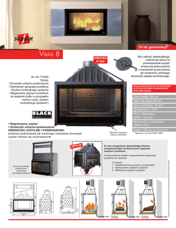 10 lat gwaranacji* Visio 8 Aby uniknąć ewentualnego cofania się dymu na pomieszczenie szyber otwiera się jednocześnie z manewrem podnoszenia lub otwierania uchylnego drzwiczek wkładu kominkowego. KRÓCIEC Ø 200 Nr ref.: F1800 Opcje: • Drzwiczki uchylno-podnoszone • Dystrybutor gorącego powietrza • System podwójnego spalania • Regulowany dopływ powietrza do spalania (tylko w przypadku wyboru opcji „system podwójnego spalania”) WKŁAD MOE ZOSTAĆ WYPOSAONY W OPCJĘ SYSTEMU PODWÓJNEGO SPALANIA (DAFS) Szer. fasady: 80 cm Maks. d∏. polan: 65 cm Moc nominalna: 15 kW** SprawnoÊç: > 70%** Moc z systemem DAFS: 17,4 kW** Sprawność z systemem DAFS: 73%** • Regulowany szyber • Drzwiczki uchylno-podnoszone DRZWICZKI UCHYLNE I PODNOSZONE: podczas podnoszenia lub uchylnego otwierania drzwiczek szyber otwiera się automatycznie Ci´˝ar: 168 kg (wer. podstawowa) Manetka regulująca dopływ powietrza A OPCJ **Zgodnie z normą PN-EN 13229 W celu osiągnięcia optymalnego bilansu energetycznego konieczna jest regulacja dopływu powietrza. 3 pozycje: 1 - Rozpalanie lub ponowne uruchamianie 2 - Maksymalna szybkość spalania 3 - Minimalna szybkość spalania Drzwiczki uchylnopodnoszone i dystrybutor gorącego powietrza 2 3 Drzwiczki 490 1 Drzwiczki 760 Wymiar całkowity: 550 Powietrze z zewnątrz Powietrze z zewnątrz *Szczegółowe warunki gwaranacji zawarte są w kracie gwarancyjnej do łączonej do kadego urządzenia. Funkcjonowanie wkładu z bezpośrednim dopływem powietrza do spalania. ® Generalny przedstawiciel w Polsce: KOPERFAM Sp. z o.o. ul. Olszankowa 51, PL 05-120 Legionowo tel. +48 22 774 11 22, fax +48 22 774 17 11 e-mail [email protected], www.koperfam.pl www.seguin.fr Przedstawiciel Handlowy: Firmy SEGUIN DUTERIEZ oraz KOPERFAM Sp. z o.o. zastrzegajà sobie prawo do wprowadzania, bez uprzedzenia, zmian parametrów technicznych, wyposa˝enia i specyfikacji oferowanych urzàdzeƒ. Podane w niniejszej publikacji promocyjnej informacje sà poglàdowe i nie stanowià zapewnienia zgodnoÊci z umowà w rozumieniu art. 4 ust. 3 i 4 Ustawy z dnia 27 lipca 2002 r. o szczególnych warunkach sprzeda˝y konsumenckiej oraz o zmianie Kodeksu Cywilnego, a tak˝e nie stanowià towaru w rozumieniu art. 4 ust. 2 wy˝ej wymienionej Ustawy. Indywidualne uzgodnienia w∏aÊciwoÊci, warunków gwarancji i specyfikacji urzàdzenia nast´pujà w umowie sprzeda˝y i karcie gwarancyjnej. Niniejsza publikacja nie stanowi oferty w rozumieniu art. 66 Kodeksu Cywilnego. Copyright SEGUIN DUTERIEZ i KOPERFAM Sp. z o.o. 2009. Wszelkie prawa zastrze˝one. Ulotkę wydrukowano w Unii Europejskiej. Wer. V8SEGUIN15122009. Przykładowe realizacje kominków z wkładem kominkowym VISIO 8