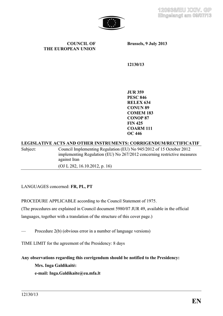 120938/EU XXIV. GP Eingelangt am 09/07/13 COUNCIL OF THE EUROPEAN UNION Brussels, 9 July 2013 12130/13 JUR 359 PESC 846 RELEX 634 CONUN 89 COMEM 183 CONOP 87 FIN 425 COARM 111 OC 446 LEGISLATIVE ACTS AND OTHER INSTRUMENTS: CORRIGENDUM/RECTIFICATIF Subject: Council Implementing Regulation (EU) No 945/2012 of 15 October 2012 implementing Regulation (EU) No 267/2012 concerning restrictive measures against Iran (OJ L 282, 16.10.2012, p. 16) LANGUAGES concerned: FR, PL, PT PROCEDURE APPLICABLE according to the Council Statement of 1975. (The procedures are explained in Council document 5980/07 JUR 49, available in the official languages, together with a translation of the structure of this cover page.) — Procedure 2(b) (obvious error in a number of language versions) TIME LIMIT for the agreement of the Presidency: 8 days Any observations regarding this corrigendum should be notified to the Presidency: 0UV,QJD*DOGLNDLWơ e-mail: [email protected] 12130/13 EN ANNEXE RECTIFICATIF au règlement d'exécution (UE) n° 945/2012 du Conseil du 15 octobre 2012 mettant en œuvre le règlement (UE) n° 267/2012 concernant l'adoption de mesures restrictives à l'encontre de l'Iran (JO L 282 du 16.10.2012, p. 16) Page 21, annexe, point II, B., entrée 31 Au lieu de: " 31. National Iranian Tanker Company (NITC) 35 East Shahid Atefi Street, Africa Ave., 19177 Téhéran, P.O. Box: 19395-4833, Tél: +98 21 23801, Email: [email protected]; tous les bureaux dans le monde Entreprise d'État fournissant un soutien financier au gouvernement iranien 16.10.2012 ", lire: " 31. National Iranian Tanker Company (NITC) 35 East Shahid Atefi Street, Africa Ave., 19177 Téhéran, P.O. Box: 19395-4833, Tél: +98 21 23801, Email: [email protected]; tous les bureaux dans le monde Effectivement contrôlée par le gouvernement iranien. Fournit un soutien financier au gouvernement iranien par l'intermédiaire de ses actionnaires qui entretiennent des liens avec le gouvernement. 16.10.2012 ". 12130/13 ANNEXE 1 FR =$àĄ&=1,. SPROSTOWANIE GRUR]SRU]ąG]HQLDZ\NRQDZF]HJR5DG\8(QU]GQLDSDĨG]LHUQLNDU GRW\F]ąFHJRZ\NRQDQLDUR]SRU]ąG]HQLD8(QUZVSUDZLHĞURGNyZRJUDQLF]DMąF\FK wobec Iranu (Dz.U. L 282 z 16.10.2012, s. 16) 6WURQD]Dáącznik, pkt II, B., pozycja 31 zamiast: „ 31. National Iranian Tanker Company (NITC) 35 East Shahid Atefi Street, Africa Ave., 19177 Teheran, P.O.Box: 19395-4833, Tel: +98 21 23801, Email: [email protected]; ZV]\VWNLHRGG]LDá\QD FDá\PĞZLHFLH Skutecznie 16.10.2012 kontrolowane SU]H]U]ąG,UDQX Udziela finansowego ZVSDUFLDU]ąGRZL Iranu poprzez akcjonariuszy XWU]\PXMąF\FK ]ZLą]NL] ”, 12130/13 =$àĄ&=1,. 2 PL SRZLQQRE\ü „ 31. National Iranian Tanker Company (NITC) 35 East Shahid Atefi Street, Africa Ave., 19177 Teheran, P.O.Box: 19395-4833, Tel: +98 21 23801, Email: [email protected]; ZV]\VWNLHRGG]LDá\QD FDá\PĞZLHFLH 16.10.2012 Skutecznie kontrolowane SU]H]U]ąG,UDQX Udziela finansowego ZVSDUFLDU]ąGRZL Iranu poprzez akcjonariuszy XWU]\PXMąF\FK ]ZLą]NL]U]ąGHP. ”. 12130/13 =$àĄ&=1,. 3 PL ANEXO RETIFICAÇÃO ao Regulamento de Execução (UE) n. 945/2012 do Conselho, de 15 de outubro de 2012, que dá execução ao Regulamento (UE) n. 267/2012 que impõe medidas restritivas contra o Irão (JO L 282 de 16.10.2012, p. 16) Página 17, anexo, ponto I, título da rubrica I do anexo IX do Regulamento (UE) n.° 267/2012 Onde se lê: ""Pessoas e entidades implicadas em atividades relacionadas com mísseis nucleares ou balísticos e entidades que apoiam o Governo do Irão"" leia-se: ""Pessoas e entidades implicadas em atividades nucleares ou atividades relacionadas com mísseis balísticos e pessoas e entidades que prestam apoio ao Governo do Irão"". 12130/13 ANEXO 4 PT