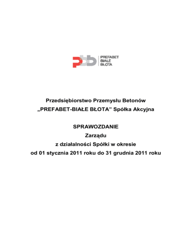 Przedsiębiorstwo Przemysłu Betonów „PREFABET-BIAŁE BŁOTA” Spółka Akcyjna SPRAWOZDANIE Zarządu z działalności Spółki w okresie od 01 stycznia 2011 roku do 31 grudnia 2011 roku 2 1. OPIS SPÓŁKI Przedsiębiorstwo Przemysłu Betonów „PREFABET-BIAŁE BŁOTA” Spółka Akcyjna z siedzibą w Białych Błotach swoją działalność rozpoczęło w 1897 roku jako fabryka uruchomiona przez bydgoski oddział niemieckiej firmy budowlanej. Po odzyskaniu niepodległości przez Polskę w 1918 roku, fabryka została przejęta przez Towarzystwo Robót Inżynierskich w Poznaniu pod nazwą Fabryka Wyrobów Betonowych „TRI”. W 1951 roku fabryka została upaństwowiona a w 1996 roku Przedsiębiorstwo Przemysłu Betonów „PREFABET-BIAŁE BŁOTA” otrzymało status Spółki Akcyjnej. 1.1. DANE SPÓŁKI Nazwa: Przedsiębiorstwo Przemysłu Betonów „PREFABET-BIAŁE BŁOTA” Spółka Akcyjna Siedziba: Białe Błota Adres: 86-005 Białe Błota, ul. Betonowa 1, Telefon: (52) 32 36 502 Adres strony internetowej: www.prefabet-bb.com.pl NIP: 554-031-36-27 REGON: 091290814 KRS: nr 0000046100, Sąd Rejonowy XIII Wydział Gospodarczy w Bydgoszczy Kapitał zakładowy Spółki wynosi 1.884.748,05 zł i dzieli się na 876.627 akcji serii A i B o wartości nominalnej 2,15 zł. 1.2. PRZEDMIOT DZIAŁALNOŚCI Głównym przedmiotem działalności Spółki jest: 1. Produkcja wyrobów budowlanych z betonu 2. Produkcja betonu towarowego 3. Produkcja pozostałych wyrobów z betonu. Firma proponuje klientom bogatą ofertę wyrobów takich jak: − płyty stropowe sprężone SPIROLL, − płyty drogowe żelbetowe, przepusty drogowe, przeciski drogowe i kolejowe, − rury WIPRO betonowe, żelbetowe, kręgi betonowe, żelbetowe i pokrywy, − studzienki pod wpusty uliczne, studzienki kanalizacyjne, − pierścienie odciążające i wyrównawcze, rury bezkielichowe SIMPLEX, zbiorniki − obudowy żelbetowe przepompowni z przejściami szczelnymi, kinety, − ściany oporowe, − elementy konstrukcyjne takie jak: słupy, belki, rygle, podwaliny, ściany. − beton towarowy, − beton mostowy, oraz inne wyroby na indywidualne zamówienia, Oferowane są takie towary jak: − kruszywa budowlane, − tłuczeń drogowy, − płyty drogowe MON i JOMB. 3 1.3. ZAKŁAD PRACY CHRONIONEJ Spółka od 2002 roku posiada status zakładu pracy chronionej. Stwarza warunki zatrudnienia osób niepełnosprawnych i daje tym osobom możliwość realizacji prawa do pracy. 1.4. WŁADZE SPÓŁKI . Zarząd W 2011 roku do marca Zarząd działał jednoosobowo: 1) Dariusz Kaczmarek - Prezes Zarządu Od 2.03.2011 roku Zarząd działa dwuosobowo: 1) Dariusz Kaczmarek - Prezes Zarządu 2) Grzegorz Brzykcy - Wiceprezes Zarządu Rada Nadzorcza W 2011 roku Rada Nadzorcza do 28.02.2011 roku działała w trzyosobowym składzie: 1) Irena Zakrzewska 2) Kinga Śluzek 3) Krystyna Kaczmarek Od 28.02.2011 roku Rada Nadzorcza działała w pięcioosobowym składzie: 1) Mirosław Brzozowski 2) Krystyna Kaczmarek 3) Sławomir Rybka 4) Kinga Śluzek 5) Irena Zakrzewska Od 28.04.2011 roku Rada Nadzorcza działa w pięcioosobowym składzie: 1) Mirosław Brzozowski 2) Krystyna Kaczmarek 3) Sławomir Rybka 4) Michał Tokarz 5) Irena Zakrzewska Walne Zgromadzenie W 2011 roku zwołane zostały trzy Walne Zgromadzenia: - 28 lutego 2011 roku - 28 kwietnia 2011 roku - 22 lipca 2011 roku Na dzień sporządzenia sprawozdania akcjonariat dzieli się na 876.627 akcji na okaziciela o wartości nominalnej 2,15 zł, w tym: - 622.393 serii A nieuprzywilejowanych - 254.234 serii B nieuprzywilejowanych 1.5. ZATRUDNIENIE W SPÓŁCE Przeciętne zatrudnienie w Spółce za 2011 rok wyniosło 150 etatów. Stan zatrudnienia na 31 grudnia 2011 roku wyniósł 125 osób. W porównaniu do analogicznego okresu ubiegłego roku zatrudnienie wzrosło 4 średnio o 9 %. Na dzień 31.12.2011 roku zatrudnione były 53 osoby niepełnosprawne, w tym 17 osób z I i II grupą inwalidzką. W realizacji zadań Spółki ważne są kwalifikacje i przygotowanie merytoryczne kierownictwa i pracowników. Pracownicy brali udział w różnych formach kształcenia i doskonalenia podnoszących kwalifikacje, między innymi w sympozjach, seminariach i szkoleniach. Ponad 21 % wszystkich pracowników jest zrzeszonych w związku zawodowym „Budowlani”. Współpraca Zarządu Spółki ze związkiem zawodowym układała się we właściwy sposób. 1.6. OŚWIADCZENIE I WYBORU ZARZĄDU PODMIOTU ODNOŚNIE UPRAWNIONEGO DO PRZYJĘTYCH BADANIA ZASAD RACHUNKOWOŚCI ROCZNEGO SPRAWOZDANIA FINANSOWEGO Zarząd Spółki oświadcza, iż roczne sprawozdanie finansowe za 2011 rok sporządzone zostało zgodnie z obowiązującymi zasadami rachunkowości oraz odzwierciedla w sposób prawdziwy, rzetelny i jasny sytuację majątkową i finansową Spółki oraz jej wynik finansowy. Sprawozdanie Zarządu zawiera prawdziwy obraz rozwoju i osiągnięć oraz sytuacji Spółki. W dniu 28 listopada 2011 roku Rada Nadzorcza Spółki „PREFABET-BIAŁE BŁOTA” S.A. działając na podstawie uprawnienia wynikającego ze Statutu Spółki, dokonała wyboru firmy „Audyt” Kancelaria Biegłego Rewidenta z siedzibą w Solcu Kujawskim, wpisanej do rejestru Krajowej Rady Biegłych rewidentów pod nr 304 jako podmiotu uprawnionego do badania sprawozdania finansowego Spółki. Podmiot ten został wybrany zgodnie z przepisami prawa i spełniał warunki do wyrażenia bezstronnej i niezależnej opinii o badaniu, zgodnie z właściwymi przepisami prawa krajowego. 2. ODDZIAŁY SPÓŁKI Spółka nie posiada oddziałów samodzielnie sporządzających sprawozdań finansowych. 3. ISTOTNE ZDARZENIA W ROZWOJU DZIAŁALNOŚCI SPÓŁKI, JAKIE NASTĄPIŁY W 2011 ROKU, A TAKŻE PO JEGO ZAKOŃCZENIU, DO DNIA ZATWIERDZENIA SPRAWOZDANIA FINASOWEGO Spółka koncentrowała się na działaniach zmierzających do wejścia na rynek NewConnect oparty na Alternatywnym Systemie Obrotu prowadzonym przez Giełdę Papierów Wartościowych w Warszawie w celu pozyskania kapita
