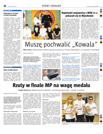 22 SPOR T LOK ALNY 24 kwietnia 2014 www.express.bydgoski.pl C M Y K KO SZYKÓW KA Najmłodsi wojownicy z MDK nr 2 pokazali się w Wyszkowie Gimnazjum nr 15 zagra w finale Gimnazjady Poznaliśmy najlepszy w naszym województwie zespół koszykówki dziewcząt, który będzie rywalizował w inale krajowym. Gimnazjum Sportowe nr 15 w Bydgoszczy po raz drugi z rzędu zdominowało rywalizację w kujawsko-pomorskiem. Tym razem podopieczne Krzysztofa Janika pokonały w inale wojewódzkim zespoły z Grudziądza i Torunia. Reprezentantki Gimnazjum nr 15 to zawodniczki zrzeszone w Międzyszkolnym Uczniowskim Klubie Sportowym. W sezonie 2013/2014 walczyły one w II lidze kobiet, a przed nimi rywalizacja w półinale mistrzostw Polski kadetek (U’16). Gimnazjalistki z Glinek w turnieju półinałowym pokonały Gimnazjum nr 2 w Bydgoszczy (99:15) oraz Gimnazjum nr 9 w Bydgoszczy (57:16). W inale były lepsze od zespołów z Grudziądza (65:16) oraz Torunia (88:30). Tym samym uzyskały przepustkę do inału krajowego. Turniej inałowy odbędzie się 22-25 czerwca br. w Kołobrzegu. Zwycięzca uzyska awans na mistrzostwa świata gimnazjów. Dodajmy, że Gimnazjum Sportowe nr 15 to część Zespołu Szkół nr 26, w którym znajduje się także Szkoła Podstawowa nr 60. Drużyna koszykarek z podstawówki o awans do inału krajowego (Energa Basket Cup) powalczy w przyszłym tygodniu. (marc) P I ŁKA N O Ż N A Nabór do Wdy Świecie KS Wda Świecie ogłasza nabór zawodników w rocznikach 20042008. Więcej informacji udzielają trenerzy: Piotr Grajewski (r. 2004) tel. 606 319-674, Tomasz Walczak (2005) tel. 512 208-475, Grzegorz Brzeziński (2006-08) tel. 605 320-544. (marc) Z okazji 25-lecia Wyszkowskiego Centrum Sztuk Walki należącego do Międzynarodowej Federacji IBDF (International Budo Do Federation) grupa młodych zawodników z MDK nr 2 im. dra Jordana wzięła udział w uroczystym seminarium i pokazach. Mistrzów sztuk walki i gości zaprosił prezes IBDF Polska soke Zbigniew Jeż, 10 dan. Od kilku lat, dzięki dużej przychylności dyrekcji MDK nr 2 prowadzone są tu zajęcia z karate dla grupy najmłodszych dzieci w wieku 5-8 lat. Tu zdobywają podstawy karate shotokan, ćwiczą sprawność ogólną, motorykę i gibkość. - W roku szkolnym 2013/2014 zawiązała się grupa wojowników, którzy wyjątkowo szybko złapali bakcyla młodego samuraja. Dlatego postanowiliśmy dać szansę dzieciom i zorganizowaliśmy im wyjazd Wyszkowa, by mogli zaprezentować swoje już niemałe umiejętności, choć ćwiczą dopiero od 7 miesięcy - powiedział Krzysztof Golec, instruktor z MDK nr 2. Na zdjęciu od lewej: sensei Ryszard Dolata, soke Zbigniew Jeż (10 dan), uczniowie: Filip Suproniak, Mateusz Antoniewicz, Hubert Ptaszyński, Bartek Romiński i Eryk Gotowski (nad, FOT. NADESŁANE) C M Y K Muszę pochwalić „Kowala” Piłka nożna. Beniaminek ze Złotnik spisuje się wiosną w IV lidze rewelacyjnie - w 5 meczach 13 punktów MARCIN KARPIŃSKI - Chyba byśmy musieli sprzedać kilka hektarów ziemi, żeby było nas, w Złotnikach Kujawskich, stać na trzecią ligę - mówi trener tamtejszego Piasta Jerzy Mądrzejewski. Panie trenerze, początek rundy macie rewelacyjny. Skąd tak dobra dyspozycja pana piłkarzy? Jakoś tak się ułożyło po pierwszym meczu, w którym z 0:2 dla Zawiszy II wyciągnęliśmy jeszcze remis 2:2, że notujemy same wygrane, w tym jedną walkowerem. To pierwsze spotkanie dodało nam pewności siebie. Potem pojechaliśmy do Brodnicy na pożarcie, tymczasem gospodarze musieli uznać naszą wyższość. I to była jedyna porażka Sparty w tej rundzie. Kolejny rywal, Grom Osie, który miał na koncie dwa zwycięstwa z rzędu, dostał od nas „trójkę”. Nasza wartość wzrosła i idziemy za ciosem. Jak wysoko sięgają wasze ambicje? Naszym zadaniem jest uplasować się w pierwszej dziesiątce. Ostrożnie podchodzimy do kolejnych meczów, bo nasz jedyny napastnik Marcin Kośka w ostatnim spotkaniu z Mienią Lipno doznał kontuzji kolana. Niewątpliwie natomiast cieszy gra Trener Jerzy Mądrzejewski FOT. D. BLOCH obrony, w tym roku straciliśmy tylko dwie bramki. Wychodzi pan z założenia, że zespół buduje się od tyłu? Całe życie tak uważałem. Trzeba też pamiętać, że w naszej drużynie jest dużo młodych zawodników ze Złotnik. To są chłopcy rocznika 1995. Wasz zespół, to taka mieszanka graczy ze Złotnik i Inowrocławia... Rzeczywiście, z Inowrocławia jest pięciu zawodników. Ale są też piłkarze z Bydgoszczy, doświadczony bramkarz Maciej Kowalski, Sebastian Mędlewski i Maciej Olszewski. Ze wszystkich jestem zadowolony, lecz jak to w futbolu, każdemu zdarzy się lepszy mecz jak i gorszy. A co pan może powiedzieć o „Kowalu”, który kiedyś stał między słupkami bramki w Zawiszy? Oceniam go bardzo wysoko. Nie spotkałem się z tak ambitnym zawodnikiem jak Maciej Kowalski. On codziennie, gdyby była taka możliwość, przyjeżdżałby na trening. Na boisku chciałby spędzać całe dnie. A my trenujemy tylko dwa razy w tygodniu. Czasem też zdarzy mi się nie przyjechać na zajęcia ze względu na obowiązki służbowe i on za mnie je prowadzi wręcz wzorcowo. Jaki przewiduje pan scenariusz na ten sezon, kto wygra IV ligę? Nasza drużyna na pewno będzie chciała uplasować się jeszcze wyżej. Oby tylko omijały nas kontuzje. Muszę dodać, że wiosną poprawiło się sędziowanie, bo jesienią różnie z tym bywało. Ligę chyba wygra Sparta, bo z tego co wiem, to Chełminiankę na trzecią ligę nie stać. Dla nas to też byłoby samobójstwo. C M Y K Rzuty w finale MP na wagę medalu Kręgle klasyczne. Bydgoszczanie trzykrotnie - po emocjonującej walce - stawali na podium W inałowym turnieju wystartowało 5 bydgoszczan. Nasi sportowcy nie zawiedli i wrócili do domu z medalami. Mieczysława Stępniewska (Omega Łódź), osiągając rezultat 870 pkt, czyli zaledwie punkt mniej od Karoliny Rzepy. O ostatecznej kolejności decydowały osta