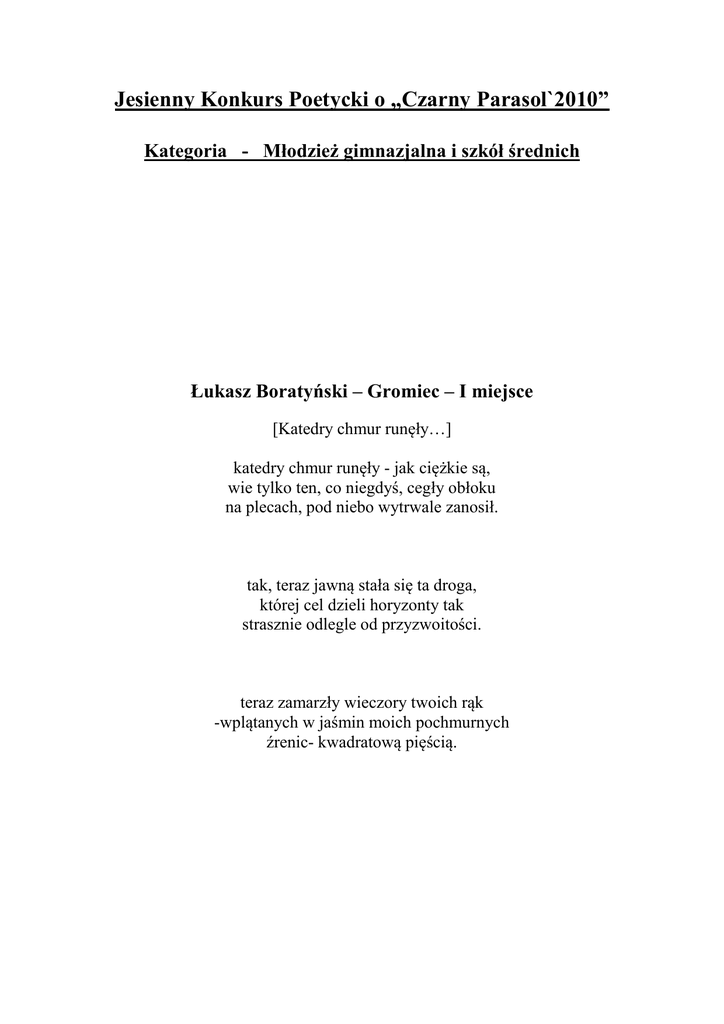 Jesienny Konkurs Poetycki o „Czarny Parasol`2010” Kategoria - Młodzież gimnazjalna i szkół średnich Łukasz Boratyński – Gromiec – I miejsce [Katedry chmur runęły…] katedry chmur runęły - jak ciężkie są, wie tylko ten, co niegdyś, cegły obłoku na plecach, pod niebo wytrwale zanosił. tak, teraz jawną stała się ta droga, której cel dzieli horyzonty tak strasznie odlegle od przyzwoitości. teraz zamarzły wieczory twoich rąk -wplątanych w jaśmin moich pochmurnych źrenic- kwadratową pięścią. Martyna Kopeć – Płaza – II miejsce – Specjalne wyróżnienie za sprawny warsztat poetycki „Dom Dziecka” Przed drzwiami 40 bucików, I w szafkach 20 kurteczek. W jadalni 20 deserów, I mnóstwo wszędzie laleczek... W domu tym miło i ciepło I jakby czas wolniej płynął. Lecz jest też tu coś dziwnego, Bo one chcą czegoś innego. Nie cieszą się z ładnych kurteczek, I wierzcie mi, nawet z laleczek. Wciąż tylko przez okno zerkają A czasem cichutko szlochają. Każdy z pewnością oznajmi: „Wszystkiego tu mają dostatek!” Lecz nigdzie nie widać tu ojców, I kochających je matek. Dawid Czernik – Libiąż – II miejsce „Ból wewnętrzny” ciemne pomieszczenie pozbawione świateł wygląda jak więzienie ściany chropowate zasłony wpuszczają słabe promienie on płacze chłostany batem on krzyczy pod razami mury tłumią cierpienie echo odbija wierszami Ewa Szlachetka – Chrzanów – III miejsce „Dusza” Wrony odlatują jak oparzone do purpury nieba trawa zachodzi czerwienią niesie się powietrzem dusza kruchego jak kreda człowieka martwa błądzi w zaświatach lecz lepiej jej niż na złej ziemi niech więc błądzi nadal dusza niezrozumiałego człowieka Nadia Chochlińska – Chrzanów – wyróżnienie „Ból, który…” Ból, który czujesz po stracie bliskiego jest bardzo trwały, nie słabnie... Ból, który łączy olbrzymią tęsknotę pojawia się gdy przymykasz oczy... Ból, który męczy niszczy wspomnienia czujesz jak nagle po policzku spływa łza... Julia Kasperczyk – Libiąż – wyróżnienie „Niepełnosprawny” Leży kukła na łóżku w kącie Arlekin poszarpany Wierny pies wdrapuje się pod pościel Łagodnie wylizuje rany Bóg zapomniał jak się tą kukłą steruje Zapomniał Nie kocha Może nie umie A kukła żyje choć leży jak martwa Patyki ma złamane A szatka jest podarta Lecz Bóg nie zapomniał Kocha I potrafi Potrafi kukiełkę na nogi postawić Powoli nią rusza Budzi ją do życia Jak kwiat kwitnący wśród leśnego poszycia