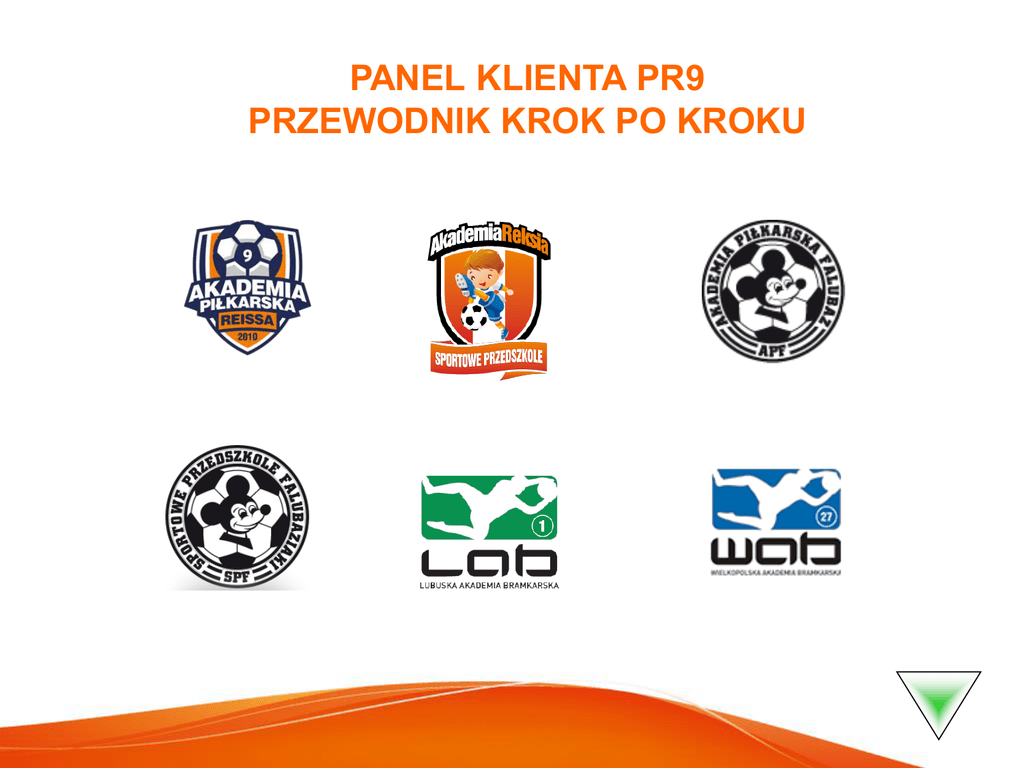PANEL KLIENTA PR9 PRZEWODNIK KROK PO KROKU Krok 1 Zakładanie konta / logowanie Jeśli masz juz konto wpisz nazwę użytkownika (email) i hasło Jeśli nie pamietasz hasła kliknij "zapomniałem hasła" w celu przypomnienia W celu zapisania dziecka do Akademii kliknij "zakładam konto" Krok 1 Zakładanie konta / logowanie Aby odzyskać hasło wpisz adres email użyty przy rejestracji Krok 2 Wypełnij dane Pola oznaczone czerwoną gwiazdką muszą być wypełnione Krok 2 Wypełnij dane Wyraź zgodę na przetwarzanie danych w celu dalszej weryfikacji Po wypełnieniu danych przejdź do kolejnego etapu Krok 3 Wypełnij pola oznaczone czerwoną gwiazdką Formularz rejestracyjny z danymi dziecka Krok 3 Wypełnij pola oznaczone czerwoną gwiazdką Jeśli posiadasz kod promocyjny wpisz go tutaj Po zapoznaniu się z regulaminem i warunkami zaznacz pozycje Zgłoś swoje dziecko do Akademii klikając ten przycisk Krok 4 Tutaj znajdziesz swoje dane Tutaj masz możliwość umieszczenia drugiego rodzica bądź kolejnego opiekuna do kontaktu Krok 5 W zakładce "Twoje dzieci" znajdziesz bieżące informacje np. o płatnościach, treningach
