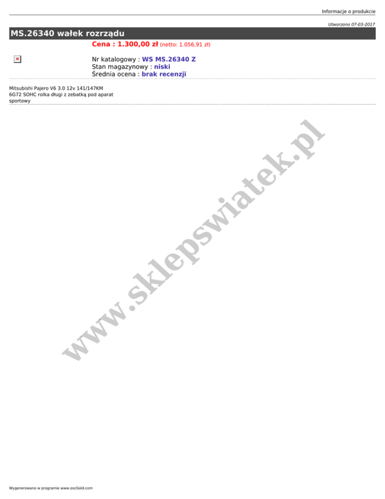 Informacje o produkcie Utworzono 07-03-2017 MS.26340 wałek rozrządu Cena : 1.300,00 zł (netto: 1.056,91 zł) Nr katalogowy : WS MS.26340 Z Stan magazynowy : niski Średnia ocena : brak recenzji w w w .s kl ep sw ia te k. pl Mitsubishi Pajero V6 3.0 12v 141/147KM 6G72 SOHC rolka długi z zebatką pod aparat sportowy Wygenerowano w programie www.oscGold.com