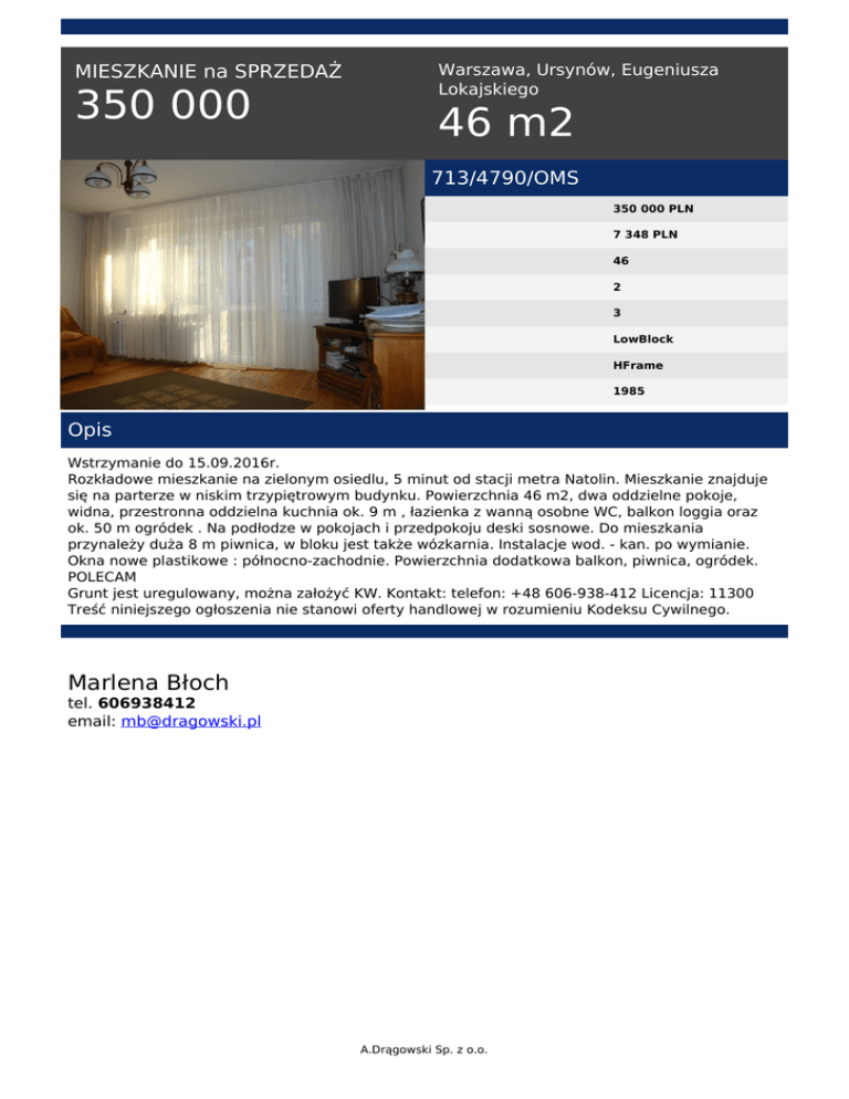 MIESZKANIE na SPRZEDAŻ 350 000 Warszawa, Ursynów, Eugeniusza Lokajskiego 46 m2 713/4790/OMS 350 000 PLN 7 348 PLN 46 2 3 LowBlock HFrame 1985 Opis Wstrzymanie do 15.09.2016r. Rozkładowe mieszkanie na zielonym osiedlu, 5 minut od stacji metra Natolin. Mieszkanie znajduje się na parterze w niskim trzypiętrowym budynku. Powierzchnia 46 m2, dwa oddzielne pokoje, widna, przestronna oddzielna kuchnia ok. 9 m , łazienka z wanną osobne WC, balkon loggia oraz ok. 50 m ogródek . Na podłodze w pokojach i przedpokoju deski sosnowe. Do mieszkania przynależy duża 8 m piwnica, w bloku jest także wózkarnia. Instalacje wod. - kan. po wymianie. Okna nowe plastikowe : północno-zachodnie. Powierzchnia dodatkowa balkon, piwnica, ogródek. POLECAM Grunt jest uregulowany, można założyć KW. Kontakt: telefon: +48 606-938-412 Licencja: 11300 Treść niniejszego ogłoszenia nie stanowi oferty handlowej w rozumieniu Kodeksu Cywilnego. Marlena Błoch tel. 606938412 email: [email protected] A.Drągowski Sp. z o.o. Powered by TCPDF (www.tcpdf.org)
