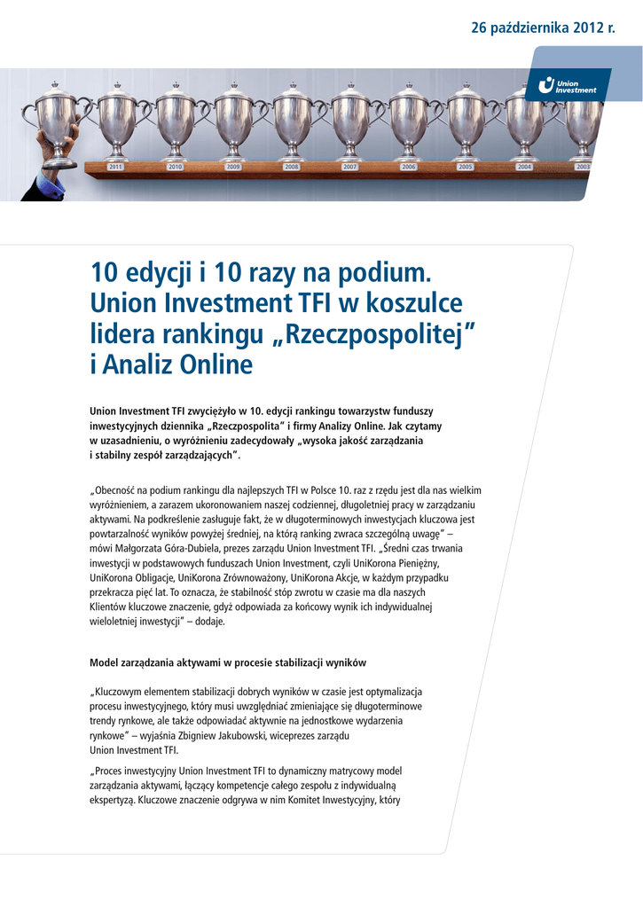26 października 2012 r. 10 edycji i 10 razy na podium. Union Investment TFI w koszulce lidera rankingu „Rzeczpospolitej” i Analiz Online Union Investment TFI zwyciężyło w 10. edycji rankingu towarzystw funduszy inwestycyjnych dziennika „Rzeczpospolita” i firmy Analizy Online. Jak czytamy w uzasadnieniu, o wyróżnieniu zadecydowały „wysoka jakość zarządzania i stabilny zespół zarządzających”. „Obecność na podium rankingu dla najlepszych TFI w Polsce 10. raz z rzędu jest dla nas wielkim wyróżnieniem, a zarazem ukoronowaniem naszej codziennej, długoletniej pracy w zarządzaniu aktywami. Na podkreślenie zasługuje fakt, że w długoterminowych inwestycjach kluczowa jest powtarzalność wyników powyżej średniej, na którą ranking zwraca szczególną uwagę” – mówi Małgorzata Góra-Dubiela, prezes zarządu Union Investment TFI. „Średni czas trwania inwestycji w podstawowych funduszach Union Investment, czyli UniKorona Pieniężny, UniKorona Obligacje, UniKorona Zrównoważony, UniKorona Akcje, w każdym przypadku przekracza pięć lat. To oznacza, że stabilność stóp zwrotu w czasie ma dla naszych Klientów kluczowe znaczenie, gdyż odpowiada za końcowy wynik ich indywidualnej wieloletniej inwestycji” – dodaje. Model zarządzania aktywami w procesie stabilizacji wyników „Kluczowym elementem stabilizacji dobrych wyników w czasie jest optymalizacja procesu inwestycyjnego, który musi uwzględniać zmieniające się długoterminowe trendy rynkowe, ale także odpowiadać aktywnie na jednostkowe wydarzenia rynkowe” – wyjaśnia Zbigniew Jakubowski, wiceprezes zarządu Union Investment TFI. „Proces inwestycyjny Union Investment TFI to dynamiczny matrycowy model zarządzania aktywami, łączący kompetencje całego zespołu z indywidualną ekspertyzą. Kluczowe znaczenie odgrywa w nim Komitet Inwestycyjny, który 26 października 2012 r. definiuje jednolite house view dla poszczególnych kategorii aktywów. Komitet dyskutuje też o proponowanych przez zarządzającego danym portfelem/funduszem krótkoterminowych strategiach inwestycyjnych (KSI), a następnie je akceptuje lub weryfikuje. Komitet Inwestycyjny analizuje także zawartość każdego z funduszy/portfeli i określa charakterystyki ryzyka. Ma prawo wprowadzać zalecenia i podejmować decyzje o dostosowaniu struktury portfela do nowych warunków. W zależności od sytuacji rynkowej dokonuje bieżących aktualizacji każdej KSI” – kontynuuje Zbigniew Jakubowski. „Rolą Komitetu Inwestycyjnego jest też wpisanie pojedynczego instrumentu na jedną z trzech list inwestycyjnych: polską, zagraniczną, kredytową – lub zdejmowanie instrumentów z tych list. Natomiast do osobistej decyzji zarządzającego pozostaje, które konkretnie instrumenty z listy zostaną ostatecznie wprowadzone do portfela oraz z jaką wagą w portfelu”. W departamencie zarządzania Union Investment TFI aktualnie pracują trzy zespoły: akcyjny, dłużny i ilościowy. Wspomagają one zarządzanie poszczególnymi funduszami i portfelami adekwatnie do określonej w prospekcie polityki inwestycyjnej. „Nawet gdy za dany portfel odpowiada tylko jeden zarządzający, rekomendacje do jego końcowych decyzji przygotowywane są przez poszczególnych członków Komitetu Inwestycyjnego i w każdej sytuacji członkowie poszczególnych zespołów mogą służyć pomocą. Dzięki takiemu podziałowi kompetencji osiągane przez towarzystwo wyniki są wyjątkowo stabilne na przestrzeni lat” – podsumowuje Zbigniew Jakubowski. Dobre wyniki, niskie ryzyko, stabilność zespołu zarządzających i bardzo dobra polityka informacyjna Jak informują autorzy rankingu, jedną z głównych zalet Union Investment TFI jest stabilny zespół zarządzających funduszami. Wszystkimi od lat zarządzają bowiem te same osoby, co w długim okresie przekłada się na wysoką efektywność zarządzania. Istotny dla końcowej oceny był też niezmiennie wysoki wskaźnik information ratio (IR), wyliczany na podstawie stóp zwrotu funduszy za ostatnie pięć lat. Oznacza to, że wyniki uzyskane przez fundusze zostały osiągnięte przy stosunkowo niskim nakładzie ryzyka i wyróżniły się pozytywnie zarówno na tle konkurencji, jak i benchmarku. 26 października 2012 r. Według „Rzeczpospolitej” i Analiz Online Union Investment TFI cechuje również bardzo przejrzysta polityka informacyjna, a przede wszystkim wzorowa dostępność informacji ważnych z punktu widzenia Klienta, dotyczących: wysokości opłat manipulacyjnych i kosztów zarządzania, osób zarządzających, benchmarku, struktury aktywów i największych składników portfela. Co więcej, towarzystwo jako pierwsze TFI na polskim rynku udostępniło inwestorom Key Investor Information Document (KIID), czyli zgodne z prawem unijnym karty zastępujące skróty prospektów informacyjnych funduszy. Czołowe miejsca we wszystkich kategoriach W każdej z głównych kategorii fundusze zarządzane przez Union Investment TFI zajęły czołowe pozycje. Na pierwszej pozycji wśród funduszy stabilnego wzrostu uplasował się UniStabilny Wzrost, który w pięcioletnim punktowanym okresie wypracował 49,9% zysku, podczas gdy średnia dla tej grupy wyniosła 1,3%. Najlepszy wynik w swojej kategorii osiągnął także fundusz UniKorona Zrównoważony. W ścisłej czołówce, na drugiej pozycji, uplasowały się subfundusz UniKorona Akcje, który potwierdził swoją mocną pozycję w grupie, oraz UniKorona Pieniężny, który osiągnął najwyższą stopę zwrotu w kategorii funduszy pieniężnych (33,2%) i to pomimo czerwcowych odpisów na obligacjach spółki PBG. Nawet po uwzględnieniu październikowej przeceny (ranking jej nie obejmował – porównywano wyniki na koniec września 2012 r.) UniKorona Pieniężny zachowałby w kategorii funduszy pieniężnych pozycję wicelidera. Wśród funduszy inwestujących przede wszystkim w polskie papiery skarbowe bardzo wysoką czwartą 