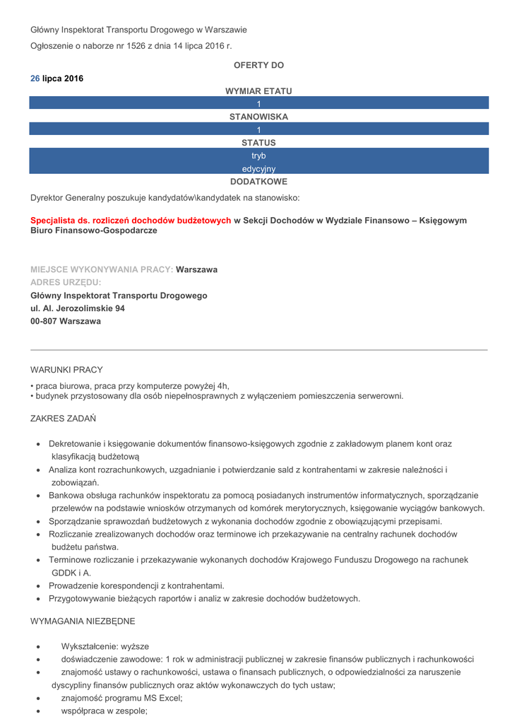 Główny Inspektorat Transportu Drogowego w Warszawie Ogłoszenie o naborze nr 1526 z dnia 14 lipca 2016 r. OFERTY DO 26 lipca 2016 WYMIAR ETATU 1 STANOWISKA 1 STATUS tryb edycyjny DODATKOWE Dyrektor Generalny poszukuje kandydatów\kandydatek na stanowisko: Specjalista ds. rozliczeń dochodów budżetowych w Sekcji Dochodów w Wydziale Finansowo – Księgowym Biuro Finansowo-Gospodarcze MIEJSCE WYKONYWANIA PRACY: Warszawa ADRES URZĘDU: Główny Inspektorat Transportu Drogowego ul. Al. Jerozolimskie 94 00-807 Warszawa WARUNKI PRACY • praca biurowa, praca przy komputerze powyżej 4h, • budynek przystosowany dla osób niepełnosprawnych z wyłączeniem pomieszczenia serwerowni. ZAKRES ZADAŃ Dekretowanie i księgowanie dokumentów finansowo-księgowych zgodnie z zakładowym planem kont oraz klasyfikacją budżetową Analiza kont rozrachunkowych, uzgadnianie i potwierdzanie sald z kontrahentami w zakresie należności i Bankowa obsługa rachunków inspektoratu za pomocą posiadanych instrumentów informatycznych, sporządzanie zobowiązań. przelewów na podstawie wniosków otrzymanych od komórek merytorycznych, księgowanie wyciągów bankowych. Sporządzanie sprawozdań budżetowych z wykonania dochodów zgodnie z obowiązującymi przepisami. Rozliczanie zrealizowanych dochodów oraz terminowe ich przekazywanie na centralny rachunek dochodów budżetu państwa. Terminowe rozliczanie i przekazywanie wykonanych dochodów Krajowego Funduszu Drogowego na rachunek GDDK i A. Prowadzenie korespondencji z kontrahentami. Przygotowywanie bieżących raportów i analiz w zakresie dochodów budżetowych. WYMAGANIA NIEZBĘDNE Wykształcenie: wyższe doświadczenie zawodowe: 1 rok w administracji publicznej w zakresie finansów publicznych i rachunkowości znajomość ustawy o rachunkowości, ustawa o finansach publicznych, o odpowiedzialności za naruszenie dyscypliny finansów publicznych oraz aktów wykonawczych do tych ustaw; znajomość programu MS Excel; współpraca w zespole; podejmowanie decyzji; samodzielność; radzenie sobie ze stresem; myślenie analityczne; rozwiązywanie problemów. Posiadanie obywatelstwa polskiego Korzystanie z pełni praw publicznych Nieskazanie prawomocnym wyrokiem za umyślne przestępstwo lub umyśle przestępstwo skarbowe WYMAGANIA DODATKOWE Wykształcenie: wyższe ekonomiczne doświadczenie zawodowe: 1 rok z zakresu budżetu zadaniowego i rachunkowości budżetowej; Znajomość ustawy o służbie cywilnej i podstawowa wiedza z zakresu naliczania wynagrodzeń. DOKUMENTY I OŚWIADCZENIA NIEZBĘDNE Życiorys/CV i list motywacyjny Kopie dokumentów potwierdzających spełnienie wymagania niezbędnego w zakresie wykształcenia Kopie dokumentów potwierdzających spełnienie wymagania niezbędnego w zakresie doświadczenia zawodowego / stażu pracy Oświadczenie o posiadaniu obywatelstwa polskiego albo kopia dokumentu potwierdzającego posiadanie polskiego obywatelstwa Oświadczenie o wyrażeniu zgody na przetwarzanie danych osobowych do celów naboru Oświadczenie o korzystaniu z pełni praw publicznych Oświadczenie o nieskazaniu prawomocnym wyrokiem za umyślne przestępstwo lub umyślne przestępstwo skarbowe DOKUMENTY I OŚWIADCZENIA DODATKOWE kopia dokumentu potwierdzającego niepełnosprawność - w przypadku kandydatek/kandydatów, zamierzających skorzystać z pierwszeństwa w zatrudnieniu w przypadku, gdy znajdą się w gronie najlepszych kandydatek/kandydatów Kopie dokumentów potwierdzających spełnienie wymagania dodatkowego w zakresie wykształcenia Kopie dokumentów potwierdzających spełnienie wymagania dodatkowego w zakresie doświadczenia zawodowego / stażu pracy TERMINY I MIEJSCE SKŁADANIA DOKUMENTÓW Dokumenty należy złożyć do: 26 lipca 2016 r. Decyduje data: stempla pocztowego / osobistego dostarczenia oferty do urzędu Miejsce składania dokumentów: Główny Inspektorat Transportu Drogowego Biuro Dyrektora Generalnego Al. Jerozolimskie 94 00-807 Warszawa z dopiskiem na kopercie i w liście motywacyjnym: BDG.110.35.2016.0308 INNE INFORMACJE: W miesiącu poprzedzającym datę upublicznienia ogłoszenia wskaźnik zatrudnienia osób niepełnosprawnych w urzędzie, w rozumieniu przepisów o rehabilitacji zawodowej i społecznej oraz zatrudnianiu osób niepełnosprawnych, nie wynosi co najmniej 6%. Prosimy o napisanie w liście motywacyjnym, jakiego ogłoszenia dotyczy oferta–numer podany w „miejscu składania dokumentów”. Kandydaci zakwalifikowani zostaną powiadomieni o terminie postępowania rekrutacyjnego. Oferty przesłane drogą elektroniczną nie opatrzone bezpiecznym podpisem elektronicznym lub faksem lub otrzymane po terminie lub nie spełniające wymagań określonych w ogłoszeniu nie będą rozpatrywane. Oferty odrzucone zostaną komisyjnie zniszczone. Przyjmujemy tylko kserokopie dokumentów. W przypadku wpływu dużej liczby ofert, Urząd zastrzega sobie możliwość rozsyłania informacji o terminie postępowania rekrutacyjnego wyłącznie drogą e-mailową. W sytuacji braku dostępu kandydata do poczty elektronicznej, prosimy o zamieszczenie takiej informacji wraz z telefonem kontaktowym w liście motywacyjnym. Weryfikacja spełniania przez kandydatów wymagań formalnych dokonana zostanie na podstawie dokumentów wymienionych w części „wymagane dokumenty i oświadczenia”. Za kompletne oferty uznane będą oferty, zawierając wszystkie wymagane dokumenty i własnoręcznie podpisane oświadczenia. Prosimy o skorzystanie ze wzorów oświadczeń, które dostępne są na stronie internetowej Inspektoratu w zakładce Kariera pod adresem http://www.gitd.gov.pl/kariera/dokumenty-do-pobrania. Zachęcamy do zapoznania się z informacjami dotyczącymi zasad organizacji naboru, które są dostępne w zakładce Kariera na stronie internetowej Inspektoratu pod adresemhttp://www.gitd.gov.pl/kariera. Pod tym adresem znajduję się również formularz kontaktowy, umożliwiający bezpośredni kontakt z działem rekrutacji. Za