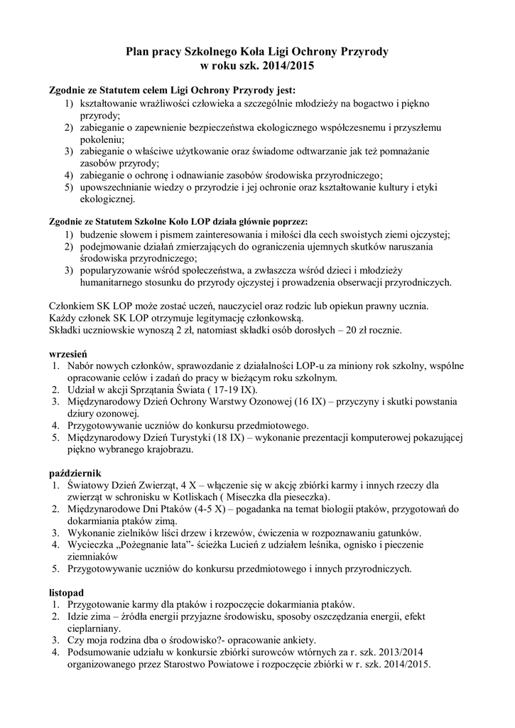Plan pracy Szkolnego Koła Ligi Ochrony Przyrody w roku szk. 2014/2015 Zgodnie ze Statutem celem Ligi Ochrony Przyrody jest: 1) kształtowanie wrażliwości człowieka a szczególnie młodzieży na bogactwo i piękno przyrody; 2) zabieganie o zapewnienie bezpieczeństwa ekologicznego współczesnemu i przyszłemu pokoleniu; 3) zabieganie o właściwe użytkowanie oraz świadome odtwarzanie jak też pomnażanie zasobów przyrody; 4) zabieganie o ochronę i odnawianie zasobów środowiska przyrodniczego; 5) upowszechnianie wiedzy o przyrodzie i jej ochronie oraz kształtowanie kultury i etyki ekologicznej. Zgodnie ze Statutem Szkolne Koło LOP działa głównie poprzez: 1) budzenie słowem i pismem zainteresowania i miłości dla cech swoistych ziemi ojczystej; 2) podejmowanie działań zmierzających do ograniczenia ujemnych skutków naruszania środowiska przyrodniczego; 3) popularyzowanie wśród społeczeństwa, a zwłaszcza wśród dzieci i młodzieży humanitarnego stosunku do przyrody ojczystej i prowadzenia obserwacji przyrodniczych. Członkiem SK LOP może zostać uczeń, nauczyciel oraz rodzic lub opiekun prawny ucznia. Każdy członek SK LOP otrzymuje legitymację członkowską. Składki uczniowskie wynoszą 2 zł, natomiast składki osób dorosłych – 20 zł rocznie. wrzesień 1. Nabór nowych członków, sprawozdanie z działalności LOP-u za miniony rok szkolny, wspólne opracowanie celów i zadań do pracy w bieżącym roku szkolnym. 2. Udział w akcji Sprzątania Świata ( 17-19 IX). 3. Międzynarodowy Dzień Ochrony Warstwy Ozonowej (16 IX) – przyczyny i skutki powstania dziury ozonowej. 4. Przygotowywanie uczniów do konkursu przedmiotowego. 5. Międzynarodowy Dzień Turystyki (18 IX) – wykonanie prezentacji komputerowej pokazującej piękno wybranego krajobrazu. październik 1. Światowy Dzień Zwierząt, 4 X – włączenie się w akcję zbiórki karmy i innych rzeczy dla zwierząt w schronisku w Kotliskach ( Miseczka dla pieseczka). 2. Międzynarodowe Dni Ptaków (4-5 X) – pogadanka na temat biologii ptaków, przygotowań do dokarmiania ptaków zimą. 3. Wykonanie zielników liści drzew i krzewów, ćwiczenia w rozpoznawaniu gatunków. 4. Wycieczka „Pożegnanie lata”- ścieżka Lucień z udziałem leśnika, ognisko i pieczenie ziemniaków 5. Przygotowywanie uczniów do konkursu przedmiotowego i innych przyrodniczych. listopad 1. Przygotowanie karmy dla ptaków i rozpoczęcie dokarmiania ptaków. 2. Idzie zima – źródła energii przyjazne środowisku, sposoby oszczędzania energii, efekt cieplarniany. 3. Czy moja rodzina dba o środowisko?- opracowanie ankiety. 4. Podsumowanie udziału w konkursie zbiórki surowców wtórnych za r. szk. 2013/2014 organizowanego przez Starostwo Powiatowe i rozpoczęcie zbiórki w r. szk. 2014/2015. 5. Rady na odpady – segregacja śmieci, recykling (zasady segregowania odpadów przekazane młodszym kolegom). grudzień 1. Dokarmianie ptaków i ogłoszenie akcji „Pomóżmy ptakom przetrwać zimę". 2. Stroik zamiast choinki – wykonanie świątecznego stroika. Konkurs na najładniejszą ozdobę. styczeń 1. Dzień LOP (9 I) – historia, cele i zadania LOP. 2. Mój przyjaciel – wystawa fotografii i rysunków zwierząt domowych. 3. Opracowanie i ogłoszenie konkursu „Moje dobre uczynki dla środowiska". luty 1. Wykonanie prac plastycznych „Moja Ziemia - mój świat”, wystawa. 2. Pielęgnacja i rozmnażanie roślin doniczkowych. marzec 1. Formy ochrony przyrody w Polce i najbliższej okolicy. 2. Ćwiczenia w rozpoznawaniu gatunków roślin i zwierząt chronionych. 3. Przeprowadzenie akcji „Drzewko mojej klasy". 4. Udział w konkursie „Zbiórka surowców wtórnych”. kwiecień 1. Woda w życiu człowieka. Znaczenie wody, przyczyny i skutki skażenia wód, konieczność oszczędzania wody. 2. Prace porządkowe przy szkole – zbieramy surowce wtórne. 3. Obchody Dnia Ziemi (22 IV)–przygotowanie i przeprowadzenie imprezy otwartej. maj 1. Święto Niezapominajki (15 V) – czym jest akcja „Niezapominajka” i jak możemy się w nią włączyć? 2. Zbiórka karmy dla zwierząt w schronisku w Kotliskach. czerwiec 1. Dni Lasu (1-7 VI) – Lasy i ich ochrona; wycieczka do lasu. 2. Światowy Dzień Ochrony Środowiska (5 VI) – przykładowe obchody tego święta w kraju. 3. Podsumowanie całorocznej pracy SK LOP. Opiekun SK LOP - Alicja Wróblewska