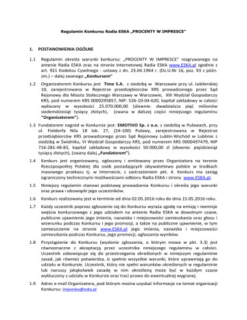 Regulamin Konkursu Radia ESKA „PROCENTY W IMPRESCE” 1. POSTANOWIENIA OGÓLNE 1.1 Regulamin określa warunki konkursu: „PROCENTY W IMPRESCE” rozgrywanego na antenie Radia ESKA oraz na stronie internetowej Radia ESKA www.ESKA.pl zgodnie z art. 921 Kodeksu Cywilnego - ustawy z dn. 23.04.1964 r. (Dz.U.Nr 16, poz. 93 z późn. zm.) – dalej zwanego „Konkursem” 1.2 Organizatorem Konkursu jest Time S.A. z siedzibą w Warszawie przy ul. Jubilerskiej 10, zarejestrowana w Rejestrze przedsiębiorców KRS prowadzonego przez Sąd Rejonowy dla Miasta Stołecznego Warszawy w Warszawie, XIII Wydział Gospodarczy KRS, pod numerem KRS 0000295857, NIP: 526-10-04-620, kapitał zakładowy w całości wpłacony w wysokości 25.070.000,00 (słownie: dwadzieścia pięć milionów siedemdziesiąt tysięcy złotych), (zwana w dalszej części niniejszego regulaminu "Organizatorem"). 1.3 Fundatorem nagród w Konkursie jest: EMOTIVO Sp. z o.o. z siedzibą w Puławach, przy ul. Fieldorfa Nila 18 lok. 27, (24-100) Puławy, zarejestrowana w Rejestrze przedsiębiorców KRS prowadzonego przez Sąd Rejonowy Lublin-Wschód w Lublinie z siedzibą w Świdniku, VI Wydział Gospodarczy KRS, pod numerem KRS 0000497479, NIP 716-281-48-83, kapitał zakładowy w wysokości 50 000,00 zł (słownie: pięćdziesiąt tysięcy złotych), (zwany dalej „Fundatorem”). 1.4 Konkurs jest organizowany, ogłaszany i emitowany przez Organizatora na terenie Rzeczpospolitej Polskiej dla osób posiadających obywatelstwo polskie w środkach masowego przekazu tj. w Internecie, z zastrzeżeniem pkt. 4. Konkurs ma zasięg ograniczony technicznymi możliwościami odbioru Radia ESKA i strony www.ESKA.pl. 1.5 Niniejszy regulamin stanowi podstawę prowadzenia Konkursu i określa jego warunki oraz prawa i obowiązki jego uczestników. 1.6 Konkurs realizowany jest w terminie od dnia 02.05.2016 roku do dnia 15.05.2016 roku. 1.7 Każdy uczestnik poprzez zgłoszenie się do Konkursu wyraża zgodę na emisję i reemisje wejścia konkursowego z jego udziałem na antenie Radia ESKA w dowolnym czasie, publiczne ujawnienie jego imienia, nazwiska i miejscowości zamieszkania oraz głosu i wizerunku podczas Konkursu i jego promocji, a także na publiczne ujawnienie, w tym zamieszczenie na stronie www.ESKA.pl jego imienia, nazwiska i miejscowości zamieszkania podczas Konkursu, jego promocji, ogłaszania wyników. 1.8 Przystąpienie do Konkursu (wysłanie zgłoszenia, o którym mowa w pkt. 3.3) jest równoznaczne z akceptacją przez uczestnika niniejszego regulaminu w całości. Uczestnik zobowiązuje się do przestrzegania określonych w niniejszym regulaminie zasad, jak również potwierdza, iż spełnia wszystkie warunki, które uprawniają go do udziału w Konkursie. Uczestnik, który nie spełni warunków określonych w regulaminie lub naruszy jakąkolwiek zasadę w nim określoną może być w każdym czasie wykluczony z udziału w Konkursie oraz traci prawo do ewentualnej wygranej. 1.9 Adres e-mail Organizatora, pod którym można uzyskać informacje na temat organizacji Konkursu: [email protected] 2. Nagrody 2.1st Zwycięzca każdej edycji Konkursu otrzyma nagrodę w postaci: boxu prezentowego „Prezent Marzeń” o wartości od 199 zł (słownie: sto dziewięćdziesiąt dziewięć złotych) do 399 zł (słownie: trzysta dziewięćdziesiąt dziewięć złotych) brutto. - box dla Dwojga – wartość 299 zł (słownie: dwieście dziewięćdziesiąt dziewięć złotych) brutto (I i VII edycja) - box Przygoda – wartość 199 zł (słownie: sto dziewięćdziesiąt dziewięć złotych) brutto (II i VIII edycja) - Box W powietrzu – wartość 359 zł (słownie: trzysta pięćdziesiąt dziewięć złotych) brutto (III i IX edycja) - box Za kierownicą – wartość 399 zł (słownie: trzysta dziewięćdziesiąt dziewięć złotych) brutto (IV i X edycja) - box Relaks i Uroda – wartość 299 zł (słownie: dwieście dziewięćdziesiąt dziewięć złotych) brutto (V i XI edycja) - box Adrenalina - wartość 299 zł (słownie: dwieście dziewięćdziesiąt dziewięć złotych) brutto (VI i XII edycja) 2.2 Organizator oświadcza, iż wszystkie nagrody obowiązującymi przepisami prawa podatkowego. zostaną wydane zgodnie z 2.3 Organizator nie ponosi odpowiedzialności za niemożność odbioru lub nieodebranie którejkolwiek nagrody, z jakiejkolwiek przyczyny leżącej po stronie nagrodzonego uczestnika. 2.4 Organizator nie ponosi odpowiedzialności za zmianę miejsca zamieszkania i/lub podanego przez uczestnika Konkursu adresu lub zmianę innych danych – uniemożliwiającą kontakt z tym uczestnikiem lub odebranie przez niego zestawu nagrody. 2.5 O szczegółach odbioru i realizacji nagrody zwycięzca każdej edycji Konkursu zostanie poinformowany przez Organizatora drogą mailową lub za pośrednictwem rozmowy telefonicznej. 2.6 Nagrody nie odebrane przez zwycięzcę Konkursu w terminie 30 dni od rozstrzygnięcia Konkursu przechodzą na własność Organizatora. 2.7 Przy odbiorze przez zwycięzcę edycji Konkursu nagrody zobowiązany jest on okazać dokument potwierdzający jego tożsamość lub w przypadku odbioru tej nagrody przez pełnomocnika zwycięzcy zobowiązany jest on okazać pisemne upoważnienie od zwycięzcy, który wygrał daną nagrodę, zawierające następujące informacje: imię nazwisko, adres, numer i seria dowodu osobistego, telefon kontaktowy tego zwycięzcy oraz adnotację o upoważnieniu określonej osoby do odbioru w jego imieniu danej nagrody, jak również podpis tego zwycięzcy wraz z danymi osoby odbierającej czyli imieniem, nazwiskiem, serią i numerem dowodu osobistego oraz telefonem odbiorcy. W przypadku niespełnienia przez osobę podającą się za pełnomocnika zwycięzcy powyższych warunków nagroda nie będzie jej wydany. 2.8 Jeżeli Zwycięzca nagrody nie spełnienia warunków określonych w pkt. 2.6 – 2.7, traci prawo do nagród w Konkursie i ich odbioru. Nagrody te pozostają własnością Fundatora