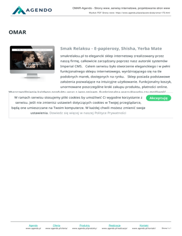 OMAR-Agendo - Strony www, serwisy internetowe, projektowanie stron www Wydruk PDF Strony www: https://www.agendo.pl/powiazane-dzialy/omar-175.html OMAR Smak Relaksu - E-papierosy, Shisha, Yerba Mate smakrelaksu.pl to elegancki sklep internetowy zrealizowany przez naszą firmę, całkowicie zarządzany poprzez nasz autorski systemów Imperial CMS. Celem serwisu było stworzenie eleganckiego i w pełni funkcjonalnego sklepu internetowego, wyróżniającego się na tle podobnych marek, dostępnych na rynku. Sklep posiada podstawowe założenia pozwalające na intuicyjne użytkowanie. Funkcjonalny koszyk, unormowane poszczególne kroki zakupu produktu, płatności online. Wyszczególnienie każdego produktu wraz z jego opisem. Funkcjonalna wyszukiwarka czy możliwość segregacji produktów. W ramach serwisu stosujemy pliki cookies by umożliwić Ci wygodne korzystanie z Akceptuję serwisu. Jeśli nie zmienisz ustawień dotyczących cookies w Twojej przeglądarce, zobacz więcej będą one umieszczane na Twoim komputerze. W każdej chwili możesz zmienić swoje ustawienia. Dowiedz się więcej w naszej Polityce Prywatności Agendo Oferta Produkty Realizacje Kontakt www.agendo.pl www.agendo.pl/oferta/ www.agendo.pl/produkty/ www.agendo.pl/realizacje/ www.agendo.pl/kontakt/ Strona 1 z 1