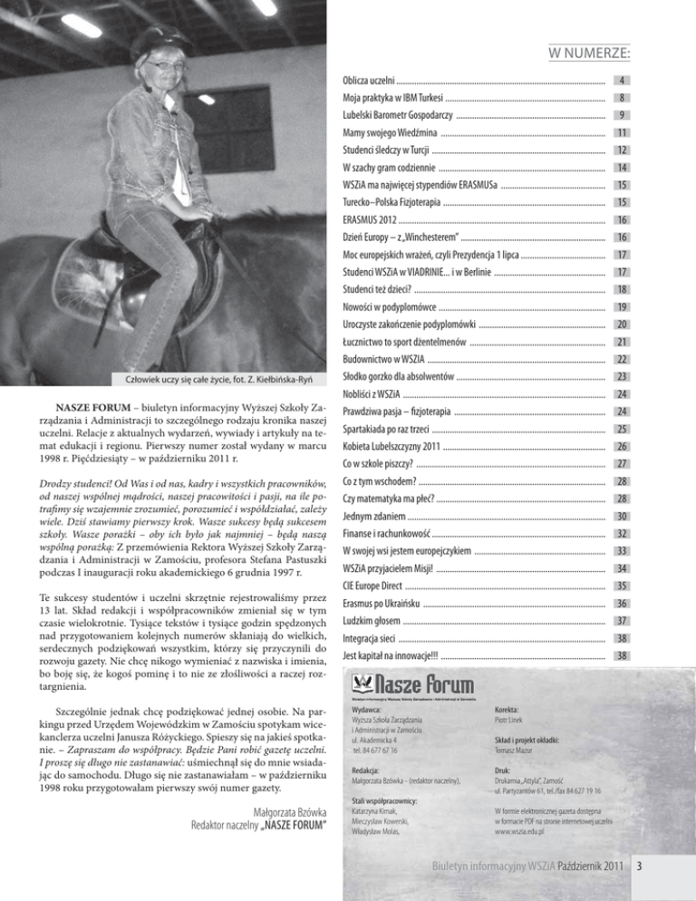 W NUMERZE: Oblicza uczelni .............................................................................................. 4 Moja praktyka w IBM Turkesi ........................................................................ 8 Lubelski Barometr Gospodarczy ................................................................... 9 Mamy swojego Wiedźmina .......................................................................... 11 Studenci śledczy w Turcji .............................................................................. 12 W szachy gram codziennie ........................................................................... 14 WSZiA ma najwięcej stypendiów ERASMUSa ............................................... 15 Turecko–Polska Fizjoterapia ......................................................................... 15 ERASMUS 2012 ............................................................................................. 16 Dzień Europy – z „Winchesterem” ................................................................. 16 Moc europejskich wrażeń, czyli Prezydencja 1 lipca ...................................... 17 Studenci WSZiA w VIADRINIE... i w Berlinie .................................................. 17 Studenci też dzieci? ...................................................................................... 18 Nowości w podyplomówce ........................................................................... 19 Uroczyste zakończenie podyplomówki ......................................................... 20 Łucznictwo to sport dżentelmenów ............................................................. 21 Budownictwo w WSZIA ................................................................................ 22 Człowiek uczy się całe życie, fot. Z. Kiełbińska-Ryń Słodko gorzko dla absolwentów ................................................................... 23 Nobliści z WSZiA ........................................................................................... 24 NASZE FORUM – biuletyn informacyjny Wyższej Szkoły Zarządzania i Administracji to szczególnego rodzaju kronika naszej uczelni. Relacje z aktualnych wydarzeń, wywiady i artykuły na temat edukacji i regionu. Pierwszy numer został wydany w marcu 1998 r. Pięćdziesiąty – w październiku 2011 r. Prawdziwa pasja – fizjoterapia .................................................................... 24 Drodzy studenci! Od Was i od nas, kadry i wszystkich pracowników, od naszej wspólnej mądrości, naszej pracowitości i pasji, na ile potrafimy się wzajemnie zrozumieć, porozumieć i współdziałać, zależy wiele. Dziś stawiamy pierwszy krok. Wasze sukcesy będą sukcesem szkoły. Wasze porażki – oby ich było jak najmniej – będą naszą wspólną porażką: Z przemówienia Rektora Wyższej Szkoły Zarządzania i Administracji w Zamościu, profesora Stefana Pastuszki podczas I inauguracji roku akademickiego 6 grudnia 1997 r. Co z tym wschodem? .................................................................................... 28 Spartakiada po raz trzeci .............................................................................. 25 Kobieta Lubelszczyzny 2011 ......................................................................... 26 Co w szkole piszczy? ..................................................................................... 27 Czy matematyka ma płeć? ............................................................................ 28 Jednym zdaniem ......................................................................................... 30 Finanse i rachunkowość .............................................................................. 32 W swojej wsi jestem europejczykiem ........................................................... 33 WSZiA przyjacielem Misji! ............................................................................ 34 CIE Europe Direct .......................................................................................... 35 Te sukcesy studentów i uczelni skrzętnie rejestrowaliśmy przez 13 lat. Skład redakcji i współpracowników zmieniał się w tym czasie wielokrotnie. Tysiące tekstów i tysiące godzin spędzonych nad przygotowaniem kolejnych numerów skłaniają do wielkich, serdecznych podziękowań wszystkim, którzy się przyczynili do rozwoju gazety. Nie chcę nikogo wymieniać z nazwiska i imienia, bo boję się, że kogoś pominę i to nie ze złośliwości a raczej roztargnienia. Szczególnie jednak chcę podziękować jednej osobie. Na parkingu przed Urzędem Wojewódzkim w Zamościu spotykam wicekanclerza uczelni Janusza Różyckiego. Spieszy się na jakieś spotkanie. – Zapraszam do współpracy. Będzie Pani robić gazetę uczelni. I proszę się długo nie zastanawiać: uśmiechnął się do mnie wsiadając do samochodu. Długo się nie zastanawiałam – w październiku 1998 roku przygotowałam pierwszy swój numer gazety. Małgorzata Bzówka Redaktor naczelny „NASZE FORUM” Erasmus po Ukraińsku .................................................................................. 36 Ludzkim głosem ........................................................................................... 37 Integracja sieci ............................................................................................. 38 Jest kapitał na innowacje!!! .......................................................................... 38 Wydawca: Wyższa Szkoła Zarządzania i Administracji w Zamościu ul. Akademicka 4 tel. 84 677 67 16 Korekta: Piotr Linek Redakcja: Małgorzata Bzówka - (redaktor naczelny), Druk: Drukarnia „Attyla”, Zamość ul. Partyzantów 61, tel./fax 84 627 19 16 Stali współpracownicy: Katarzyna Kimak, Mieczysław Kowerski, Władysław Molas, Skład i projekt okładki: Tomasz Mazur W formie elektronicznej gazeta dostępna w formacie PDF na stronie internetowej uczelni www.wszia.edu.pl Biuletyn in