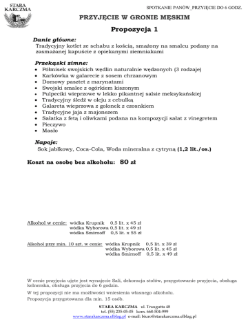 SPOTKANIE PANÓW_PRZYJĘCIE DO 6 GODZ. PRZYJĘCIE W GRONIE MĘSKIM Propozycja 1 Danie główne: Tradycyjny kotlet ze schabu z kością, smażony na smalcu podany na zasmażanej kapuście z opiekanymi ziemniakami Przekąski zimne: Półmisek swojskich wędlin naturalnie wędzonych (3 rodzaje) Karkówka w galarecie z sosem chrzanowym Domowy pasztet z marynatami Swojski smalec z ogórkiem kiszonym Pulpeciki wieprzowe w lekko pikantnej salsie meksykańskiej Tradycyjny śledź w oleju z cebulką Galareta wieprzowa z golonek z czosnkiem Tradycyjne jaja z majonezem Sałatka z fetą i oliwkami podana na kompozycji sałat z vinegretem Pieczywo Masło Napoje: Sok jabłkowy, Coca-Cola, Woda mineralna z cytryną (1,2 lit./os.) Koszt na osobę bez alkoholu: 80 zł Alkohol w cenie: wódka Krupnik 0,5 lit. x 45 zł wódka Wyborowa 0,5 lit. x 49 zł wódka Smirnoff 0,5 lit. x 55 zł Alkohol przy min. 10 szt. w cenie: wódka Krupnik 0,5 lit. x 39 zł wódka Wyborowa 0,5 lit. x 45 zł wódka Smirnoff 0,5 lit. x 49 zł W cenie przyjęcia ujęte jest wynajęcie Sali, dekoracja stołów, przygotowanie przyjęcia, obsługa kelnerska, obsługa przyjęcia do 6 godzin. W tej propozycji nie ma możliwości wniesienia własnego alkoholu. Propozycja przygotowana dla min. 15 osób. STARA KARCZMA ul. Traugutta 48 tel. (55) 235-05-05 kom. 668-504-999 www.starakarczma.elblag.pl e-mail: [email protected] SPOTKANIE PANÓW_PRZYJĘCIE DO 6 GODZ. Propozycja 2 Danie główne: Koperty „Żuławskie” z szynki wieprzowej nadziewane ogórkiem kiszonym i wędzonką duszone w sosie własnym z tradycyjnym ziemniakiem i kapustą szmurowaną Przekąska ciepła: Bogracz – lekko pikantna zupa gulaszowa Przekąski zimne: Półmisek mięs pieczystych z marynatami (3 rodzaje mięs pieczonych) Roladka drobiowa faszerowana czerwoną papryką z omletem z Rusollion Koreczki z kotlecików mielonych z pieczarkami i pomidorkiem Śledź po cygańsku (w sosie pomidorowym) Jaja faszerowane pastą paprykową Smalec ze skwarkami i swojskim ogórkiem kiszonym Kulki sałatki jarzynowej w majonezowej pierzynce Caprese - pomidory z mozarellą podane z pesto i świeżą bazylią Sałatka grecka na lodowej sałacie Sos czosnkowy Pieczywo swojskie Masło Napoje: Sok jabłkowy, Coca-Cola, Woda mineralna z cytryną (1,2 lit./os.) Koszt na osobę bez alkoholu: 90 zł Alkohol w cenie: wódka Krupnik 0,5 lit. x 45 zł wódka Wyborowa 0,5 lit. x 49 zł wódka Smirnoff 0,5 lit. x 55 zł Alkohol przy min. 10 szt. w cenie: wódka Krupnik 0,5 lit. x 39 zł wódka Wyborowa 0,5 lit. x 45 zł wódka Smirnoff 0,5 lit. x 49 zł W cenie przyjęcia ujęte jest wynajęcie Sali, dekoracja stołów, przygotowanie przyjęcia, obsługa kelnerska, obsługa przyjęcia do 6 godzin. W tej propozycji nie ma możliwości wniesienia własnego alkoholu. Propozycja przygotowana dla min. 15 osób. STARA KARCZMA ul. Traugutta 48 tel. (55) 235-05-05 kom. 668-504-999 www.starakarczma.elblag.pl e-mail: [email protected] SPOTKANIE PANÓW_PRZYJĘCIE DO 6 GODZ. Propozycja 3 Zupa: Puszysty krem z pomidorów z ziołowymi grzankami Danie główne: Golonka zapiekana w ciemnym piwie z opiekanymi ziemniakami i kapustą zasmażaną Przekąska ciepła: Żur staropolski na własnym zakwasie z jajkiem i białą kiełbasą Przekąski zimne: Półmisek swojskich wędlin i kiełbas (4 rodzaje) Pieczeń rzymska z marynatami Galareta wieprzowa z golonek z czosnkiem Swojski smalec z ogórkiem kiszonym Tradycyjny tatar wołowy z ogórkiem i cebulką Śledź w śmietanie z ogórkiem, jabłkiem i cebulką z plastrami ziemniaka Swojski schab ze śliwką w galarecie z sosem czosnkowym Sałatka z grillowanym kurczakiem w duecie sosów Sałatka jarzynowa tradycyjnie po polsku Sosy: czosnkowy, salsa meksykańska Pieczywo swojskie Masło Napoje: Sok jabłkowy, Coca-Cola, Woda mineralna z cytryną (1,5 lit./os.) Koszt na osobę bez alkoholu: 110 zł Alkohol w cenie: wódka Krupnik 0,5 lit. x 45 zł wódka Wyborowa 0,5 lit. x 49 zł wódka Smirnoff 0,5 lit. x 55 zł Alkohol przy min. 10 szt. w cenie: wódka Krupnik 0,5 lit. x 39 zł wódka Wyborowa 0,5 lit. x 45 zł wódka Smirnoff 0,5 lit. x 49 zł W cenie przyjęcia ujęte jest wynajęcie Sali, dekoracja stołów, przygotowanie przyjęcia, obsługa kelnerska, obsługa przyjęcia do 6 godzin. W tej propozycji możliwość wniesienia własnego alkoholu (wódka czysta z akcyzą) -> opłata serwisowa tzw. korkowe 6 zł/os. (serwis: zmrożenie alkoholu, wydanie szkła, serwowanie lodu). Propozycja przygotowana dla min. 15 osób. STARA KARCZMA ul. Traugutta 48 tel. (55) 235-05-05 kom. 668-504-999 www.starakarczma.elblag.pl e-mail: [email protected]
