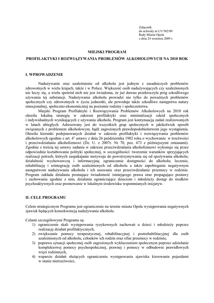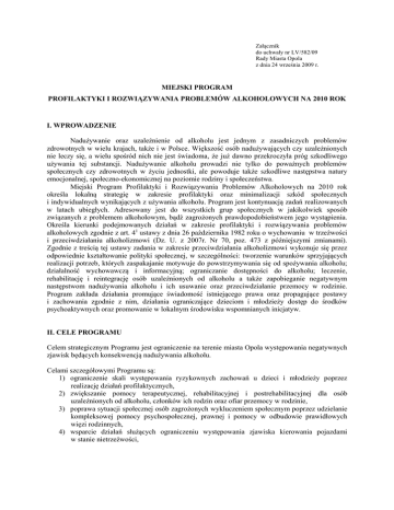 Załącznik do uchwały nr LV/582/09 Rady Miasta Opola z dnia 24 września 2009 r. MIEJSKI PROGRAM PROFILAKTYKI I ROZWIĄZYWANIA PROBLEMÓW ALKOHOLOWYCH NA 2010 ROK I. WPROWADZENIE Nadużywanie oraz uzależnienie od alkoholu jest jednym z zasadniczych problemów zdrowotnych w wielu krajach, także i w Polsce. Większość osób nadużywających czy uzależnionych nie leczy się, a wielu spośród nich nie jest świadoma, że już dawno przekroczyła próg szkodliwego używania tej substancji. Nadużywanie alkoholu prowadzi nie tylko do poważnych problemów społecznych czy zdrowotnych w życiu jednostki, ale powoduje także szkodliwe następstwa natury emocjonalnej, społeczno-ekonomicznej na poziomie rodziny i społeczeństwa. Miejski Program Profilaktyki i Rozwiązywania Problemów Alkoholowych na 2010 rok określa lokalną strategię w zakresie profilaktyki oraz minimalizacji szkód społecznych i indywidualnych wynikających z używania alkoholu. Program jest kontynuacją zadań realizowanych w latach ubiegłych. Adresowany jest do wszystkich grup społecznych w jakikolwiek sposób związanych z problemem alkoholowym, bądź zagrożonych prawdopodobieństwem jego wystąpienia. Określa kierunki podejmowanych działań w zakresie profilaktyki i rozwiązywania problemów alkoholowych zgodnie z art. 41 ustawy z dnia 26 października 1982 roku o wychowaniu w trzeźwości i przeciwdziałaniu alkoholizmowi (Dz. U. z 2007r. Nr 70, poz. 473 z późniejszymi zmianami). Zgodnie z treścią tej ustawy zadania w zakresie przeciwdziałania alkoholizmowi wykonuje się przez odpowiednie kształtowanie polityki społecznej, w szczególności: tworzenie warunków sprzyjających realizacji potrzeb, których zaspakajanie motywuje do powstrzymywania się od spożywania alkoholu; działalność wychowawczą i informacyjną; ograniczanie dostępności do alkoholu; leczenie, rehabilitację i reintegrację osób uzależnionych od alkoholu a także zapobieganie negatywnym następstwom nadużywania alkoholu i ich usuwanie oraz przeciwdziałanie przemocy w rodzinie. Program zakłada działania promujące świadomość istniejącego prawa oraz propagujące postawy i zachowania zgodnie z nim, działania ograniczające dzieciom i młodzieży dostęp do środków psychoaktywnych oraz promowanie w lokalnym środowisku wspomnianych inicjatyw. II. CELE PROGRAMU Celem strategicznym Programu jest ograniczenie na terenie miasta Opola występowania negatywnych zjawisk będących konsekwencją nadużywania alkoholu. Celami szczegółowymi Programu są: 1) ograniczenie skali występowania ryzykownych zachowań u dzieci i młodzieży poprzez realizację działań profilaktycznych, 2) zwiększanie pomocy terapeutycznej, rehabilitacyjnej i postrehabilitacyjnej dla osób uzależnionych od alkoholu, członków ich rodzin oraz ofiar przemocy w rodzinie, 3) poprawa sytuacji społecznej osób zagrożonych wykluczeniem społecznym poprzez udzielanie kompleksowej pomocy psychospołecznej, prawnej i pomocy w odbudowie prawidłowych więzi rodzinnych, 4) wsparcie działań służących ograniczeniu występowania zjawiska kierowania pojazdami w stanie nietrzeźwości, 5) zwiększenie dostępu do oferty pomocowej poprzez wspomaganie działalności instytucji, stowarzyszeń i osób fizycznych służącej rozwiązywaniu problemów alkoholowych, innych uzależnień oraz przemocy domowej. Powyższe cele osiągane będą poprzez realizację zadań zgrupowanych w 5 obszarach: 1. profilaktyka, 2. pomoc psychospołeczna i prawna, 3. terapia, rehabilitacja i postrehabilitacja, 4. edukacja publiczna, 5. interwencje. III. ZADANIA PROGRAMU W POSZCZEGÓLNYCH OBSZARACH. OBSZAR 1 – PROFILAKTYKA 1. Prowadzenie profilaktycznej działalności informacyjnej i edukacyjnej w zakresie rozwiązywania problemów alkoholowych i przeciwdziałania narkomanii, w szczególności dla dzieci, młodzieży i dorosłych poprzez realizację nowoczesnych programów profilaktycznych. 2. Tworzenie warunków sprzyjających prawidłowemu rozwojowi społecznemu, psychicznemu i fizycznemu dzieci i młodzieży poprzez: 1) prowadzenie pozalekcyjnych zajęć sportowych, 2) dożywianie dzieci uczestniczących w pozalekcyjnych programach opiekuńczowychowawczych i socjoterapeutycznych, 3) wspieranie bieżącej działalności świetlic środowiskowych, 4) realizację programu budowy placów zabaw. OBSZAR 2 – POMOC PSYCHOSPOŁECZNA I PRAWNA 1. Zwiększanie dostępności do pomocy psychospołecznej i prawnej dla osób uzależnionych od alkoholu i członków ich rodzin, a w szczególności dla osób doznających i stosujących przemoc poprzez prowadzenie poradnictwa prawnego. 2. Organizacja wakacyjnych form wyjazdowych o charakterze rekreacyjno- profilaktycznym dla dzieci i młodzieży żyjących w najbliższym otoczeniu osób uzależnionych od alkoholu oraz w rodzinach dotkniętych wykluczeniem społecznym lub nim zagrożonych – Akcja LATO 2010. 3. Podejmowanie działań mających na celu przeciwdziałanie przemocy w rodzinie, w tym: 1) dofinansowanie działalności specjalistycznych miejsc pomocy dla ofiar przemocy w rodzinie (Miejski Ośrodek Pomocy Rodzinie - Ośrodek Interwencji Kryzysowej), 2) dofinansowanie działalności specjalistycznych miejsc pomocy dla osób, które swoim zachowaniem dają powód do zgorszenia w miejscu publicznym lub zakładzie pracy, znajdują się w okolicznościach zagrażających ich życiu lub zdrowiu albo zagrażają życiu lub zdrowiu innych osób (Miejski Ośrodek Pomocy Osobom Bezdomnym i Uzależnionym). 2 OBSZAR 3 – TERAPIA, REHABILITACJA I POSTREHABILITACJA 1. Zwiększanie dostępności do pomocy terapeutycznej dla osób uzależnionych od alkoholu, dorosłych dzieci alkoholików, ich rodzin oraz osób doznających i stosujących przemoc poprzez: 1) realizację dodatkowych programów terapeutycznych, 2) intensyfikację działań w zakresie rozpatrywania wniosków o skierowanie na leczenie oraz motywowanie do podjęcia leczenia odwykowego.