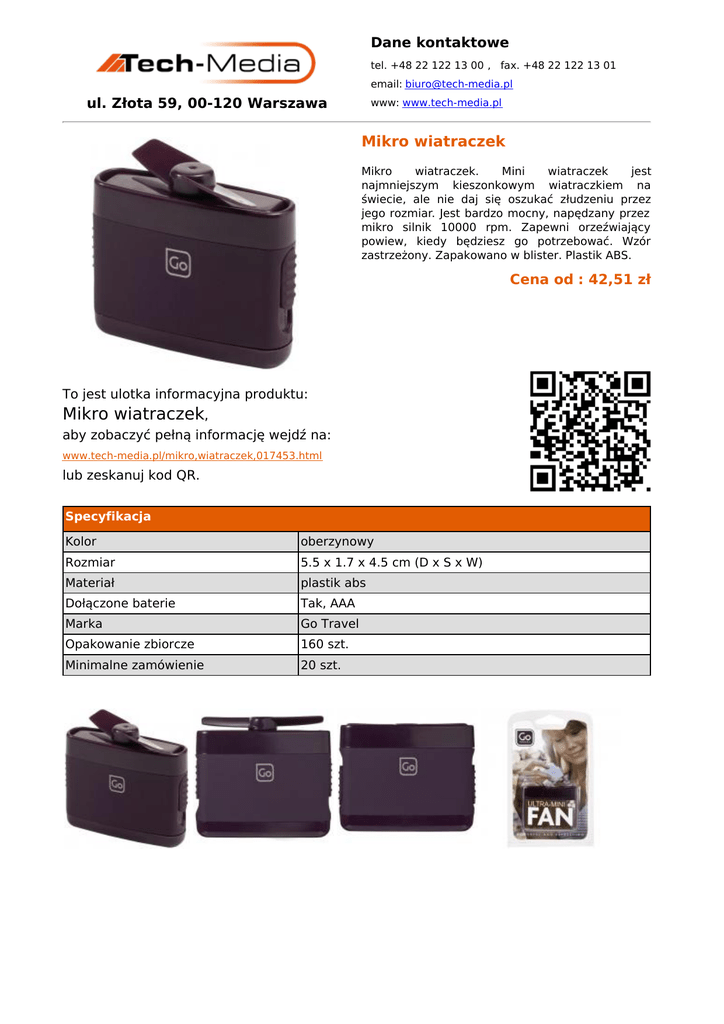 Dane kontaktowe tel. +48 22 122 13 00 , fax. +48 22 122 13 01 email: [email protected] ul. Złota 59, 00-120 Warszawa www: www.tech-media.pl Mikro wiatraczek Mikro wiatraczek. Mini wiatraczek jest najmniejszym kieszonkowym wiatraczkiem na świecie, ale nie daj się oszukać złudzeniu przez jego rozmiar. Jest bardzo mocny, napędzany przez mikro silnik 10000 rpm. Zapewni orzeźwiający powiew, kiedy będziesz go potrzebować. Wzór zastrzeżony. Zapakowano w blister. Plastik ABS. Cena od : 42,51 zł To jest ulotka informacyjna produktu: Mikro wiatraczek, aby zobaczyć pełną informację wejdź na: www.tech-media.pl/mikro,wiatraczek,017453.html lub zeskanuj kod QR. Specyfikacja Kolor oberzynowy Rozmiar 5.5 x 1.7 x 4.5 cm (D x S x W) Materiał plastik abs Dołączone baterie Tak, AAA Marka Go Travel Opakowanie zbiorcze 160 szt. Minimalne zamówienie 20 szt.