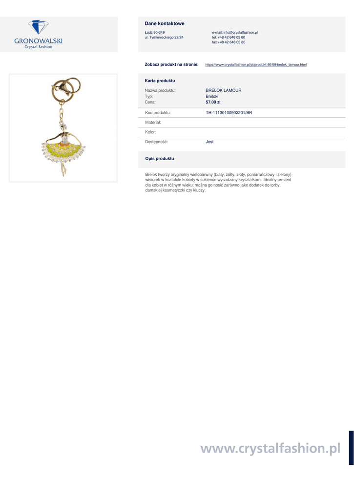 Powered by TCPDF (www.tcpdf.org) Dane kontaktowe Łódź 90-349 ul. Tymienieckiego 22/24 Zobacz produkt na stronie: e-mail: [email protected] tel. +48 42 648 05 60 fax +48 42 648 05 80 https://www.crystalfashion.pl/pl/produkt/46/59/brelok_lamour.html Karta produktu Nazwa produktu: Typ: Cena: BRELOK LAMOUR Breloki 57.00 zł Kod produktu: TH-11130100902201/BR Materiał: Kolor: Dostępność: Jest Opis produktu Brelok tworzy oryginalny wielobarwny (biały, żółty, złoty, pomarańczowy i zielony) wisiorek w kształcie kobiety w sukience wysadzany kryształkami. Idealny prezent dla kobiet w różnym wieku: można go nosić zarówno jako dodatek do torby, damskiej kosmetyczki czy kluczy.