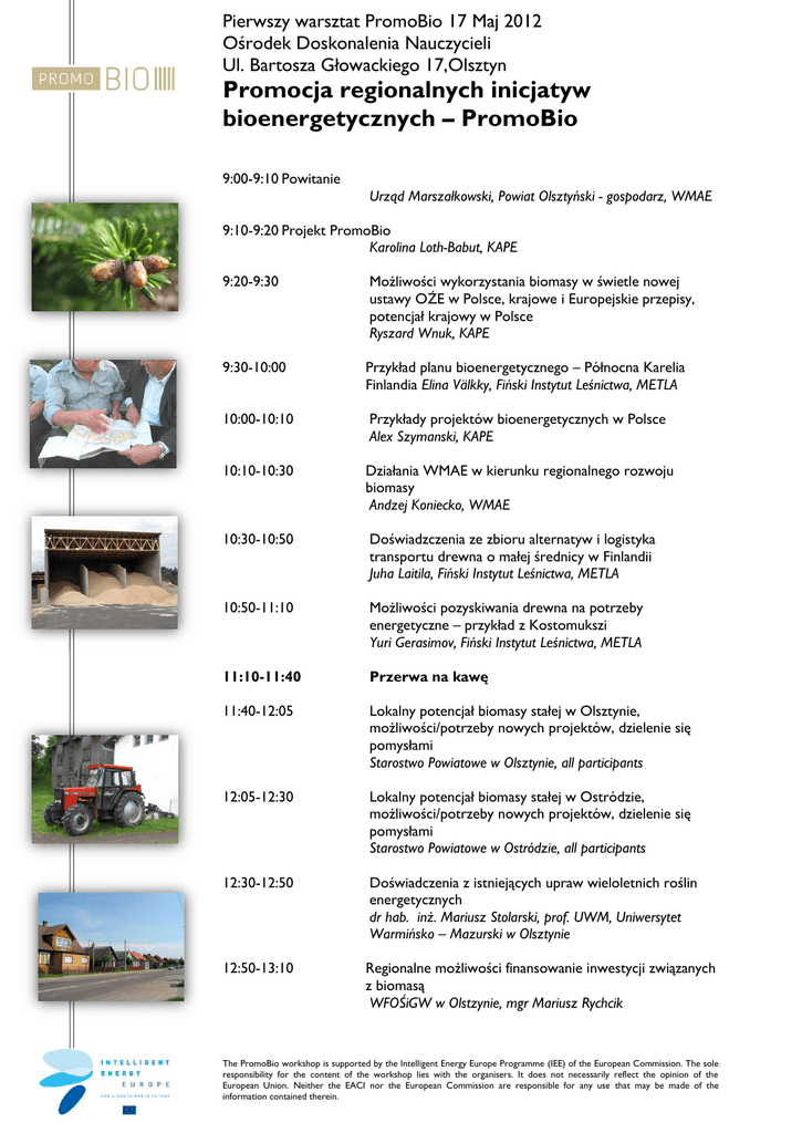 Pierwszy warsztat PromoBio 17 Maj 2012 Ośrodek Doskonalenia Nauczycieli Ul. Bartosza Głowackiego 17,Olsztyn Promocja regionalnych inicjatyw bioenergetycznych – PromoBio 9:00-9:10 Powitanie Urząd Marszałkowski, Powiat Olsztyński - gospodarz, WMAE 9:10-9:20 Projekt PromoBio Karolina Loth-Babut, KAPE 9:20-9:30 Możliwości wykorzystania biomasy w świetle nowej ustawy OŹE w Polsce, krajowe i Europejskie przepisy, potencjał krajowy w Polsce Ryszard Wnuk, KAPE 9:30-10:00 Przykład planu bioenergetycznego – Północna Karelia Finlandia Elina Välkky, Fiński Instytut Leśnictwa, METLA 10:00-10:10 Przykłady projektów bioenergetycznych w Polsce Alex Szymanski, KAPE 10:10-10:30 Działania WMAE w kierunku regionalnego rozwoju biomasy Andzej Koniecko, WMAE 10:30-10:50 Doświadzczenia ze zbioru alternatyw i logistyka transportu drewna o małej średnicy w Finlandii Juha Laitila, Fiński Instytut Leśnictwa, METLA 10:50-11:10 Możliwości pozyskiwania drewna na potrzeby energetyczne – przykład z Kostomukszi Yuri Gerasimov, Fiński Instytut Leśnictwa, METLA 11:10-11:40 Przerwa na kawę 11:40-12:05 Lokalny potencjał biomasy stałej w Olsztynie, możliwości/potrzeby nowych projektów, dzielenie się pomysłami Starostwo Powiatowe w Olsztynie, all participants 12:05-12:30 Lokalny potencjał biomasy stałej w Ostródzie, możliwości/potrzeby nowych projektów, dzielenie się pomysłami Starostwo Powiatowe w Ostródzie, all participants 12:30-12:50 Doświadczenia z istniejących upraw wieloletnich roślin energetycznych dr hab. inż. Mariusz Stolarski, prof. UWM, Uniwersytet Warmińsko – Mazurski w Olsztynie 12:50-13:10 Regionalne możliwości finansowanie inwestycji związanych z biomasą WFOŚiGW w Olstzynie, mgr Mariusz Rychcik The PromoBio workshop is supported by the Intelligent Energy Europe Programme (IEE) of the European Commission. The sole responsibility for the content of the workshop lies with the organisers. It does not necessarily reflect the opinion of the European Union. Neither the EACI nor the European Commission are responsible for any use that may be made of the information contained therein. 13:10-13:40 Podsumowanie i dyskusja na temat pierwszego projektu regionalnego planu bioenergetycznego 14:00 Lunch The PromoBio workshop is supported by the Intelligent Energy Europe Programme (IEE) of the European Commission. The sole responsibility for the content of the workshop lies with the organisers. It does not necessarily reflect the opinion of the European Union. Neither the EACI nor the European Commission are responsible for any use that may be made of the information contained therein.