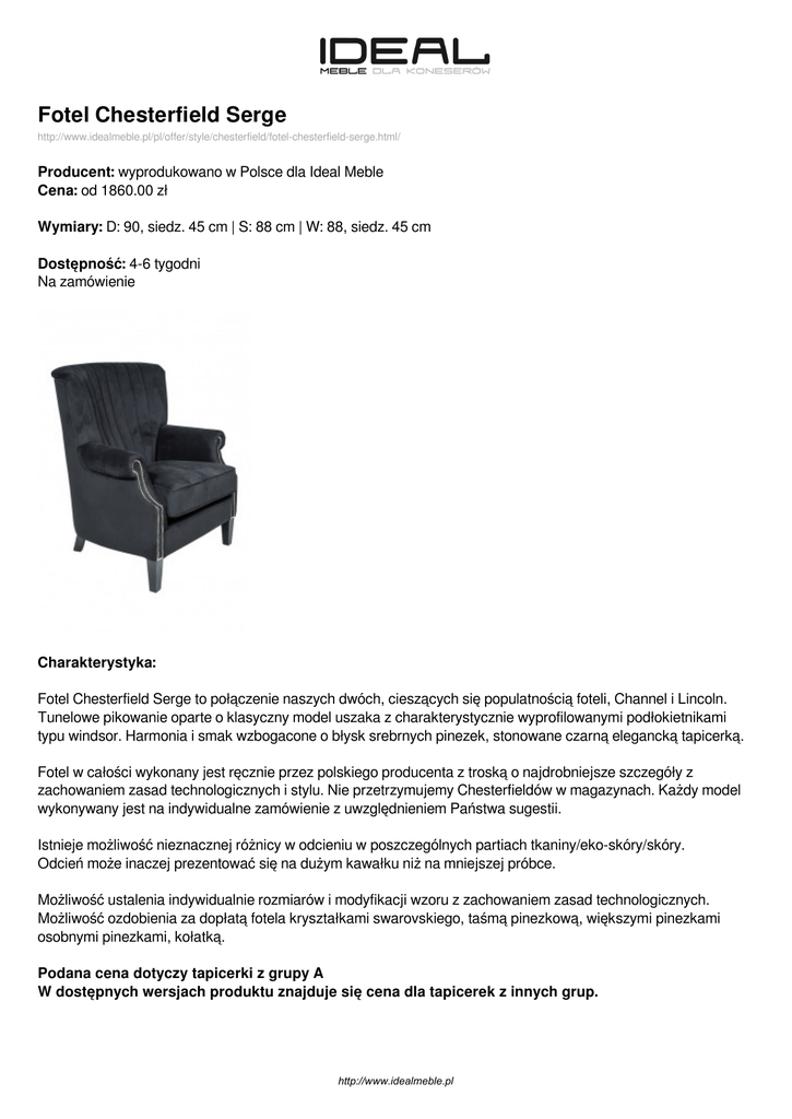 Fotel Chesterfield Serge http://www.idealmeble.pl/pl/offer/style/chesterfield/fotel-chesterfield-serge.html/ Producent: wyprodukowano w Polsce dla Ideal Meble Cena: od 1860.00 zł Wymiary: D: 90, siedz. 45 cm | S: 88 cm | W: 88, siedz. 45 cm Dostępność: 4-6 tygodni Na zamówienie Charakterystyka: Fotel Chesterfield Serge to połączenie naszych dwóch, cieszących się populatnością foteli, Channel i Lincoln. Tunelowe pikowanie oparte o klasyczny model uszaka z charakterystycznie wyprofilowanymi podłokietnikami typu windsor. Harmonia i smak wzbogacone o błysk srebrnych pinezek, stonowane czarną elegancką tapicerką. Fotel w całości wykonany jest ręcznie przez polskiego producenta z troską o najdrobniejsze szczegóły z zachowaniem zasad technologicznych i stylu. Nie przetrzymujemy Chesterfieldów w magazynach. Każdy model wykonywany jest na indywidualne zamówienie z uwzględnieniem Państwa sugestii. Istnieje możliwość nieznacznej różnicy w odcieniu w poszczególnych partiach tkaniny/eko-skóry/skóry. Odcień może inaczej prezentować się na dużym kawałku niż na mniejszej próbce. Możliwość ustalenia indywidualnie rozmiarów i modyfikacji wzoru z zachowaniem zasad technologicznych. Możliwość ozdobienia za dopłatą fotela kryształkami swarovskiego, taśmą pinezkową, większymi pinezkami osobnymi pinezkami, kołatką. Podana cena dotyczy tapicerki z grupy A W dostępnych wersjach produktu znajduje się cena dla tapicerek z innych grup. http://www.idealmeble.pl W przypadku tapicerki skórzanej prosimy o kontakt. http://www.idealmeble.pl Dostępne wersje produktu: nazwa produktu Fotel Chesterfield Serge warianty Tapicerka materiał, tkanina, plusz gr A cena 1860.00zł dostępne 4-6 tygodni Fotel Chesterfield Serge Tapicerka materiał, tkanina, plusz gr B 2120.00zł 4-6 tygodni Fotel Chesterfield Serge Tapicerka materiał, tkanina, plusz gr C 2640.00zł 4-6 tygodni Fotel Chesterfield Serge Tapicerka materiał, tkanina, plusz gr D 2950.00zł 4-6 tygodni http://www.idealmeble.pl Zdjęcia produktu: http://www.idealmeble.pl Powered by TCPDF (www.tcpdf.org)