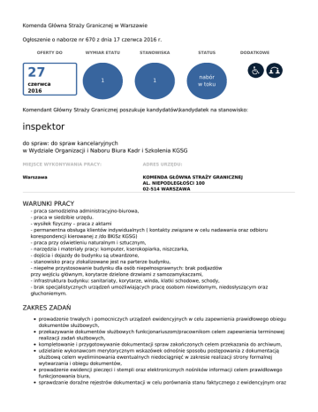 Komenda Główna Straży Granicznej w Warszawie Ogłoszenie o naborze nr 670 z dnia 17 czerwca 2016 r. OFERTY DO 27 czerwca 2016 WYMIAR ETATU STANOWISKA STATUS 1 1 nabór w toku DODATKOWE Komendant Główny Straży Granicznej poszukuje kandydatów\kandydatek na stanowisko: inspektor do spraw: do spraw kancelaryjnych w Wydziale Organizacji i Naboru Biura Kadr i Szkolenia KGSG MIEJSCE WYKONYWANIA PRACY: ADRES URZĘDU: Warszawa KOMENDA GŁÓWNA STRAŻY GRANICZNEJ AL. NIEPODLEGŁOŚCI 100 02-514 WARSZAWA WARUNKI PRACY - praca samodzielna administracyjno-biurowa, - praca w siedzibie urzędu. - wysiłek fizyczny – praca z aktami - permanentna obsługa klientów indywidualnych ( kontakty związane w celu nadawania oraz odbioru korespondencji kierowanej z /do BKiSz KGSG) - praca przy oświetleniu naturalnym i sztucznym, - narzędzia i materiały pracy: komputer, kserokopiarka, niszczarka, - dojścia i dojazdy do budynku są utwardzone, - stanowisko pracy zlokalizowane jest na parterze budynku, - niepełne przystosowanie budynku dla osób niepełnosprawnych: brak podjazdów przy wejściu głównym, korytarze dzielone drzwiami z samozamykaczami, - infrastruktura budynku: sanitariaty, korytarze, winda, klatki schodowe, schody, - brak specjalistycznych urządzeń umożliwiających pracę osobom niewidomym, niedosłyszącym oraz głuchoniemym. ZAKRES ZADAŃ prowadzenie trwałych i pomocniczych urządzeń ewidencyjnych w celu zapewnienia prawidłowego obiegu dokumentów służbowych, przekazywanie dokumentów służbowych funkcjonariuszom/pracownikom celem zapewnienia terminowej realizacji zadań służbowych, kompletowanie i przygotowywanie dokumentacji spraw zakończonych celem przekazania do archiwum, udzielanie wykonawcom merytorycznym wskazówek odnośnie sposobu postępowania z dokumentacją służbową celem wyeliminowania ewentualnych niedociągnięć w zakresie realizacji strony formalnej wytwarzania i obiegu dokumentów, prowadzenie ewidencji pieczęci i stempli oraz elektronicznych nośników informacji celem prawidłowego funkcjonowania biura, sprawdzanie doraźne rejestrów dokumentacji w celu porównania stanu faktycznego z ewidencyjnym oraz rozliczanie z pobranych dokumentów wykonawców merytorycznych odchodzących z komórki organizacyjnej, prowadzenie bieżącej kontroli postępowań z dokumentami, które zostały udostępnione funkcjonariuszom i pracownikom BKiSz KGSG. WYMAGANIA NIEZBĘDNE Wykształcenie: średnie doświadczenie zawodowe: 1 rok w pracy kancelaryjnej komunikatywność, umiejętność interpretacji przepisów, umiejętność pracy w zespole, czytelny charakter pisma, umiejętność działania w sytuacjach stresowych, skrupulatność, terminowość, odpowiedzialność, pozytywne przejście procedury sprawdzającej w celu uzyskania poświadczenia bezpieczeństwa osobowego, uprawniającego do dostępu do informacji niejawnych. Posiadanie obywatelstwa polskiego Korzystanie z pełni praw publicznych Nieskazanie prawomocnym wyrokiem za umyślne przestępstwo lub umyśle przestępstwo skarbowe DOKUMENTY I OŚWIADCZENIA NIEZBĘDNE Życiorys/CV i list motywacyjny Kopie dokumentów potwierdzających spełnienie wymagania niezbędnego w zakresie wykształcenia Kopie dokumentów potwierdzających spełnienie wymagania niezbędnego w zakresie doświadczenia zawodowego / stażu pracy Oświadczenie o posiadaniu obywatelstwa polskiego albo kopia dokumentu potwierdzającego posiadanie polskiego obywatelstwa Oświadczenie o wyrażeniu zgody na przetwarzanie danych osobowych do celów naboru Oświadczenie o korzystaniu z pełni praw publicznych Oświadczenie o nieskazaniu prawomocnym wyrokiem za umyślne przestępstwo lub umyślne przestępstwo skarbowe DOKUMENTY I OŚWIADCZENIA DODATKOWE kopia dokumentu potwierdzającego niepełnosprawność - w przypadku kandydatek/kandydatów, zamierzających skorzystać z pierwszeństwa w zatrudnieniu w przypadku, gdy znajdą się w gronie najlepszych kandydatek/kandydatów kopie innych dokumentów potwierdzających posiadane kwalifikacje. TERMINY I MIEJSCE SKŁADANIA DOKUMENTÓW Dokumenty należy złożyć do: 27 czerwca 2016 r. Decyduje data: stempla pocztowego / osobistego dostarczenia oferty do urzędu Miejsce składania dokumentów: Biuro Kadr i Szkolenia Komendy Głównej Straży Granicznej Al. Niepodległości 100 02-514 Warszawa z dopiskiem "oferta pracy – inspektor BKiSz KGSG oraz numer ogłoszenia" INNE INFORMACJE: W miesiącu poprzedzającym datę upublicznienia ogłoszenia wskaźnik zatrudnienia osób niepełnosprawnych w urzędzie, w rozumieniu przepisów o rehabilitacji zawodowej i społecznej oraz zatrudnianiu osób niepełnosprawnych, nie wynosi co najmniej 6%. - wynagrodzenie na powyższym stanowisku wynosi ok. 1700 zł. netto + dodatek za wysługę lat, - dokumenty należy składać osobiście w siedzibie urzędu lub listownie, - oferty otrzymane po terminie nie będą rozpatrywane – decyduje data przyjęcia oferty w urzędzie lub data stempla pocztowego, - rozpatrzeniu nie będą podlegać oferty niespełniające wymagań określonych w ogłoszeniu a także oferty, które nie zawierają kompletu wymaganych oraz uwiarygodnionych (opatrzonych datą i własnoręcznym podpisem kandydata) dokumentów i oświadczeń, - kandydaci zakwalifikowani będą informowani telefonicznie lub za pośrednictwem poczty elektronicznej o terminie rozmowy kwalifikacyjnej, - przyjmujemy tylko kompletne kserokopie dokumentów, - oferty odrzucone zostaną komisyjnie zniszczone, - wzory wymaganych oświadczeń znajdują się na stronie: http://www.strazgraniczna.pl/pl/straz-graniczna/sprawy-kadrowe/korpus-sluzby-cywilnej/2487,Korpus-sluzby-cy wilnej.html Uwaga! Weryfikacja spełniania przez kandydatów wymagań formalnych dokonana zostanie na podstawie dokumentów wymienionych w części "wymagane dokumenty i oświadczenia". W związku z tym podkreślamy, że kompletne aplikacje to takie, które zawierają wszystkie wymagane i uwiarygodnione (opatrzon