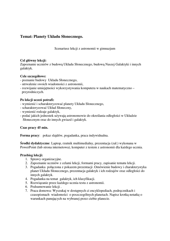 Temat: Planety Układu Słonecznego. Scenariusz lekcji z astronomii w gimnazjum Cel główny lekcji: Zapoznanie uczniów z budową Układu Słonecznego, budową Naszej Galaktyki i innych galaktyk. Cele szczegółowe: - poznanie budowy Układu Słonecznego, - utrwalenie swoich wiadomości z astronomii, - rozwijanie umiejętności wykorzystywania komputera w naukach matematyczno – przyrodniczych. Po lekcji uczeń potrafi: - wymienić i scharakteryzować planety Układu Słonecznego, - scharakteryzować Układ Słoneczny, - wymienić rodzaje galaktyk, - podać jakich jednostek używają astronomowie do określania odległości w Układzie Słonecznym oraz do innych gwiazd i galaktyk. Czas pracy 45 min. Forma pracy: pokaz slajdów, pogadanka, praca indywidualna. Środki dydaktyczne: Laptop, rzutnik multimedialny, prezentacja (zał.) wykonana w PowerPoint (lub strona internetowa), komputer z testem z astronomii dla każdego ucznia. Przebieg lekcji: 1. Sprawy organizacyjne. 2. Zapoznanie uczniów z celami lekcji, formami pracy, zapisanie tematu lekcji. 3. Pogadanka połączona z pokazem prezentacji .Omówienie budowy i charakterystyka planet Układu Słonecznego, prezentacja galaktyk i ich rodzajów oraz odległości do innych galaktyk. 4. Pogadanka na temat galaktyk, ich klasyfikacji. 5. Rozwiązanie przez każdego ucznia testu z astronomii. 6. Podsumowanie lekcji . 7. Praca domowa: Wyszukaj w dostępnych ci encyklopediach, podręcznikach i czasopismach wiadomości o poszczególnych planetach. Napisz krotką notatkę o warunkach panujących na wybranej przez ciebie planecie.