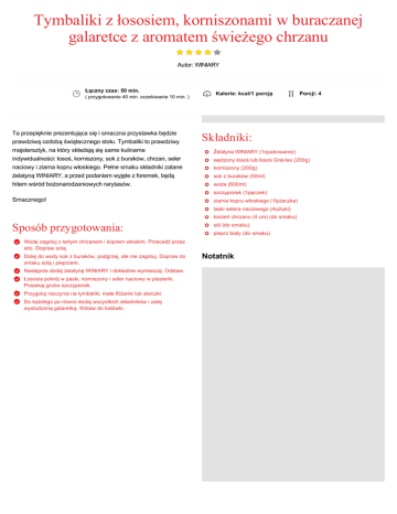 Tymbaliki z łososiem, korniszonami w buraczanej galaretce z aromatem świeżego chrzanu Autor: WINIARY Łączny czas: 50 min. ( przygotowanie 40 min. oczekiwanie 10 min. ) Ta przepięknie prezentująca się i smaczna przystawka będzie prawdziwą ozdobą świątecznego stołu. Tymbaliki to prawdziwy Kalorie: kcal/1 porcję Porcji: 4 Składniki: majstersztyk, na który składają się same kulinarne Żelatyna WINIARY (1opakowanie) indywidualności: łosoś, korniszony, sok z buraków, chrzan, seler naciowy i ziarna kopru włoskiego. Pełne smaku składniki zalane wędzony łosoś lub łosoś Gravlax (200g) żelatyną WINIARY, a przed podaniem wyjęte z foremek, będą sok z buraków (50ml) hitem wśród bożonarodzeniowych rarytasów. woda (600ml) korniszony (200g) szczypiorek (1pęczek) Smacznego! ziarna kopru włoskiego (1łyżeczka) laski selera naciowego (4sztuki) korzeń chrzanu (4 cm) (do smaku) Sposób przygotowania: sól (do smaku) pieprz biały (do smaku) Wodę zagotuj z tartym chrzanem i koprem włoskim. Przecedź przez sito. Dopraw solą. Dolej do wody sok z buraków, podgrzej, ale nie zagotuj. Dopraw do smaku solą i pieprzem. Następnie dodaj żelatynę WINIARY i dokładnie wymieszaj. Odstaw. Łososia pokrój w paski, korniszony i seler naciowy w plasterki. Posiekaj grubo szczypiorek. Przygotuj naczynia na tymbaliki, małe filiżanki lub słoiczki. Do każdego po równo dodaj wszystkich składników i zalej wystudzoną galaretką. Wstaw do lodówki. Notatnik