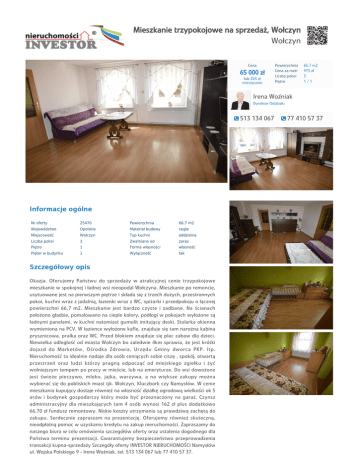 Mieszkanie trzypokojowe na sprzedaż, Wołczyn Wołczyn Cena 65 000 zł lub 283 zł miesięcznie Powierzchnia Cena za metr Liczba pokoi Piętro 66.7 m2 975 zł 3 1/1 Irena Woźniak Dyrektor Oddziału 513 134 067 Informacje ogólne Nr oferty 25470 Powierzchnia 66.7 m2 Województwo Opolskie Materiał budowy cegła Miejscowość Wołczyn Typ kuchni oddzielna Liczba pokoi 3 Zwalniane od zaraz Piętro 1 Forma własności własność Pięter w budynku 1 Wyłączność tak Szczegółowy opis Okazja. Oferujemy Państwu do sprzedaży w atrakcyjnej cenie trzypokojowe mieszkanie w spokojnej i ładnej wsi nieopodal Wołczyna. Mieszkanie po remoncie, usytuowane jest na pierwszym piętrze i składa się z trzech dużych, przestronnych pokoi, kuchni wraz z jadalnią, łazienki wraz z WC, spiżarki i przedpokoju o łącznej powierzchni 66,7 m2. Mieszkanie jest bardzo czyste i zadbane. Na ścianach położono gładzie, pomalowano na cieple kolory, podłogi w pokojach wyłożone są ładnymi panelami, w kuchni natomiast gumolit imitujący deski. Stolarka okienna wymieniona na PCV. W łazience wyłożone kafle, znajduje się tam narożna kabina prysznicowa, pralka oraz WC. Przed blokiem znajduje się plac zabaw dla dzieci. Niewielka odległość od miasta Wołczyn bo zaledwie 4km sprawia, że jest krótki dojazd do Marketów, Ośrodka Zdrowia, Urzędu Gminy dworca PKP. Itp. Nieruchomość ta idealnie nadaje dla osób ceniących sobie ciszę , spokój, otwartą przestrzeń oraz ludzi którzy pragną odpocząć od miejskiego zgiełku i żyć wolniejszym tempem po pracy w mieście, lub na emeryturze. Do wsi dowożone jest świeże pieczywo, mleko, jajka, warzywa, a na większe zakupy można wybierać się do pobliskich miast tjk. Wołczyn, Kluczbork czy Namysłów. W cenie mieszkania kupujący dostaje również na własność działkę ogrodową wielkości ok 5 arów i budynek gospodarczy który może być przeznaczony na garaż. Czynsz administracyjny dla mieszkających tam 4 osób wynosi 162 zł plus dodatkowo 66,70 zł fundusz remontowy. Niskie koszty utrzymania są prawdziwą zachętą do zakupu. Serdecznie zapraszam na prezentację. Oferujemy również skuteczną, nieodpłatną pomoc w uzyskaniu kredytu na zakup nieruchomości. Zapraszamy do naszego biura w celu omówienia szczegółów oferty oraz ustalenia dogodnego dla Państwa terminu prezentacji. Gwarantujemy bezpieczeństwo przeprowadzenia transakcji kupna-sprzedaży Szczegóły oferty INVESTOR NIERUCHOMOŚCI Namysłów ul. Wojska Polskiego 9 - Irena Woźniak, tel. 513 134 067 lub 77 410 57 37. 77 410 57 37 Nota prawna: Informacje dotyczące opisu nieruchomości podane są przez właściciela, mają charakter wyłącznie informacyjny i mogą podlegać aktualizacji. Oferta dotycząca nieruchomości stanowi zaproszenie do rokowań zgodnie z art. 71 Kodeksu Cywilnego i nie stanowi oferty określonej w art. 66 i następnych KC. Oddział Namysłów, ul. Wojska Polskiego 9 , 46-100 Namysłów 77 400 01 76 • [email protected] • www.investor.net.pl 2017-03-07 21:21:51 Strona 1 z 1
