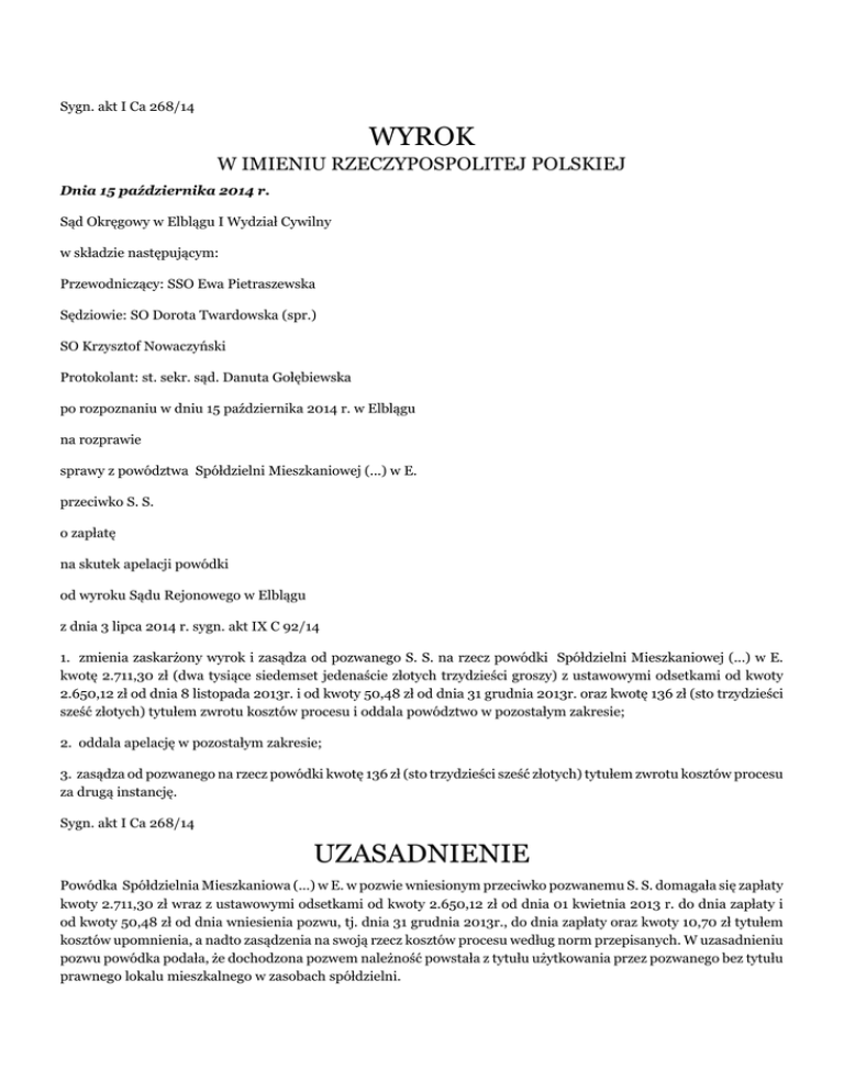 Sygn. akt I Ca 268/14 WYROK W IMIENIU RZECZYPOSPOLITEJ POLSKIEJ Dnia 15 października 2014 r. Sąd Okręgowy w Elblągu I Wydział Cywilny w składzie następującym: Przewodniczący: SSO Ewa Pietraszewska Sędziowie: SO Dorota Twardowska (spr.) SO Krzysztof Nowaczyński Protokolant: st. sekr. sąd. Danuta Gołębiewska po rozpoznaniu w dniu 15 października 2014 r. w Elblągu na rozprawie sprawy z powództwa Spółdzielni Mieszkaniowej (...) w E. przeciwko S. S. o zapłatę na skutek apelacji powódki od wyroku Sądu Rejonowego w Elblągu z dnia 3 lipca 2014 r. sygn. akt IX C 92/14 1. zmienia zaskarżony wyrok i zasądza od pozwanego S. S. na rzecz powódki Spółdzielni Mieszkaniowej (...) w E. kwotę 2.711,30 zł (dwa tysiące siedemset jedenaście złotych trzydzieści groszy) z ustawowymi odsetkami od kwoty 2.650,12 zł od dnia 8 listopada 2013r. i od kwoty 50,48 zł od dnia 31 grudnia 2013r. oraz kwotę 136 zł (sto trzydzieści sześć złotych) tytułem zwrotu kosztów procesu i oddala powództwo w pozostałym zakresie; 2. oddala apelację w pozostałym zakresie; 3. zasądza od pozwanego na rzecz powódki kwotę 136 zł (sto trzydzieści sześć złotych) tytułem zwrotu kosztów procesu za drugą instancję. Sygn. akt I Ca 268/14 UZASADNIENIE Powódka Spółdzielnia Mieszkaniowa (...) w E. w pozwie wniesionym przeciwko pozwanemu S. S. domagała się zapłaty kwoty 2.711,30 zł wraz z ustawowymi odsetkami od kwoty 2.650,12 zł od dnia 01 kwietnia 2013 r. do dnia zapłaty i od kwoty 50,48 zł od dnia wniesienia pozwu, tj. dnia 31 grudnia 2013r., do dnia zapłaty oraz kwoty 10,70 zł tytułem kosztów upomnienia, a nadto zasądzenia na swoją rzecz kosztów procesu według norm przepisanych. W uzasadnieniu pozwu powódka podała, że dochodzona pozwem należność powstała z tytułu użytkowania przez pozwanego bez tytułu prawnego lokalu mieszkalnego w zasobach spółdzielni. Pozwany S. S. zakwestionował istnienie zobowiązania, składając do akt dokument rozliczenia mieszkania. Wyrokiem z dnia 03 lipca 2014 r. Sąd Rejonowy w Elblągu oddalił powództwo. Rozstrzygnięcie było wynikiem następujących ustaleń faktycznych i oceny prawnej dokonanej przez Sąd pierwszej instancji: Sąd Rejonowy ustalił, że Spółdzielnia Mieszkaniowa (...) w E. jest właścicielką lokalu mieszkalnego położonego w E. przy ul. (...). Powódkę oraz pozwanego S. S. łączyła umowa o ustanowienie lokatorskiego prawa do lokalu, przedmiotem której był lokal mieszkalny położony w E. przy ul. (...). Lokatorskie prawo do przedmiotowego lokalu wygasło z dniem 31 maja 2004 r. S. S. zajmował bez tytułu prawnego lokal mieszkalny położony w E. przy ul. (...) od dnia 01 czerwca 2004 r. Wskazano, że powódka dochodziła od pozwanego wynagrodzenia za bezumowne korzystanie z lokalu mieszkalnego, stanowiącego jej własność. Podstawą prawną powództwa był art. 225 k.c. w zw. z art. 224 § 2 k.c., zgodnie z którym posiadacz samoistny w złej wierze (czyli ten, kto wie albo wiedzieć powinien na podstawie towarzyszących okoliczności, że nie przysługuje mu prawo własności) jest m.in. obowiązany uiszczać właścicielowi rzeczy wynagrodzenie za korzystanie z niej. Podkreślono, że pozwany S. S. nie kwestionował faktu zajmowania lokalu mieszkalnego bez tytułu prawnego, a jedynie fakt istnienia przedmiotowego zobowiązania. W ocenie Sądu pierwszej instancji załączone do pozwu dokumenty nie mogły stanowić dowodu potwierdzającego istnienie przedmiotowego roszczenia z uwagi na zakwestionowanie przez pozwanego jego zasadności. Powołano twierdzenia pozwanego, że zgodnie z uzyskaną informacją w siedzibie powódki, to on powinien otrzymać 2.000 zł z rozliczenia powstałych zaległości z tytułu bezumownego korzystania, a wpłaconym przez niego wkładem. Sąd pierwszej instancji wskazał, że w dniu 29 kwietnia 2014 r. powódka złożyła pismo, w którego załączniku podano stan zadłużenia przed rozliczeniem wkładu. W piśmie tym wskazano stan zadłużenia po rozliczeniu wkładu i odstąpieniu od odsetek, ale kwota tam wskazana nie jest tożsama z kwotą żądaną pozwem. Podkreślono, że żądanego roszczenia wydaje się dotyczyć jedynie wzmianka oznaczona sygnaturą niniejszej sprawy, jednakże nie wynika z niej sposób jej naliczenia, szczególnie w odniesieniu do podnoszonego przez pozwanego wkładu. W ocenie Sądu pierwszej instancji przedłożone dokumenty nie wykazały zasadności dochodzonego w niniejszym postępowaniu roszczenia. Z dokumentów tych wynika jedynie, że powódce przysługują w stosunku do pozwanego S. S. także inne wierzytelności, których powódka dochodzi na drodze postępowania sądowego. W apelacji powódka Spółdzielnia Mieszkaniowa (...) w E. wniosła o zmianę powyższego wyroku i orzeczenie zgodnie z żądaniem pozwu, ewentualnie o uchylenie powyższego wyroku i przekazanie sprawy do ponownego rozpoznania Sądowi pierwszej instancji. W uzasadnieniu wskazano, że z oświadczenia z dnia 05 sierpnia 2013 r., na które powoływał się pozwany wynika, iż z należnej mu kwoty 23.517,84 zł powódka dokonała potrącenia między innymi części przysługującej jej wierzytelności z tytułu czynszu, tj. kwoty 21.984,03 zł. Powódka podkreśliła, że obok kwoty zadłużenia wskazanego w piśmie z dnia 05 sierpnia 2013 r., do zaspokojenia której doszło na skutek potrącenia, pozwany posiadał kolejne zadłużenia, które z uwagi na wartość wkładu nie zostały zaspokojone. Kwoty tego zadłużenia, w tym zadłużenia objętego żądaniem pozwu, ujęte zostały w rozliczeniu skierowanym do Sądu na skutek wezwania z dnia 22 kwietnia 2014 r. W rozliczeniu wskazano stan zadłużenia na dzień sprzed rozliczenia wkładu – 45.844,68 zł oraz stan zadłużenia po rozliczeniu wkładu – 19.917,35 zł. Różnica w kwocie 25.927,33 zł stanowiła kwotę odsetek, od których dochodzenia powódka odstąpiła (3.943,30zł) oraz kwotę częściowego z