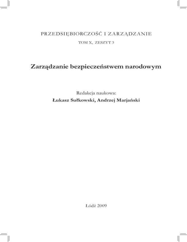 PR ZEDSIĘBIORCZOŚĆ I ZA R ZĄ DZA NIE TOM X, ZESZYT 3 Zarządzanie bezpieczeństwem narodowym Redakcja naukowa: Łukasz Sułkowski, Andrzej Marjański Łódź 2009 Redakcja naukowa: Łukasz Sułkowski, Andrzej Marjański Skład i łamanie tekstu: Ilona Marczak, Agnieszka Zytka Projekt okładki: Marcin Szadkowski © Copyright: Społeczna Wyższa Szkoła Przedsiębiorczości i Zarządzania ISSN 1733-2486 Druk i oprawa: Drukarnia „Green”, Plac Komuny Paryskiej 4 90-007 Łódź, tel./fax 042 632 27 13, 0 604 507 082 e-mail: [email protected] Adrzej Marjański, Mirosław Włodarczyk Wstęp......................................................................................... 5 Mirosław Kwieciński Bezpieczeństwo wewnętrzne państwa z perspektywy organizacji i zarządzania. Przykład kasztelanii . ...................................................................... 7 Mirosław Włodarczyk Bezpieczeństwo narodowe a prawa i obowiązki obywatela ............................ 21 Włodzimierz Fehler Pojęcie i istota bezpieczeństwa wewnętrznego państwa................................ 31 Natalia Czuhraj, Zina Żywko The Role of Law Enforcement bodies in Home and International Security Systems..... 41 Jan D. Antoszkiewicz Postępowanie kryzysowe w organizacji a zmiana globalna.. ........................... 53 Stanisław Kwiatkowski Trzy uwagi do repertuaru językowego struktur bezpieczeństwa...................... 73 Jadwiga Mazur Public Relations w organizacjach zajmujących się bezpieczeństwem................. 85 Henryk Skłodowski Psychologia sytuacji kryzysowych....................................................... 97 Jerzy Szafrański Rola Policji w likwidacji zagrożeń powodowanych katastrofami naturalnymi i awariami technicznymi oraz zdarzeniami terrorystycznymi........................ 107 Kazimierz Kołodziejczyk Człowiek – centrum rozważań o bezpieczeństwie ..................................... 121 Tomasz Barański, Rafał Szklarek Specjalistyczne uzbrojone formacje ochronne a bezpieczeństwo państwa.. ..........133 Tomasz Hoffmann Policja jako organ bezpieczeństwa i porządku publicznego ........................... 151 Tadeusz Leszczyński Migrations and security of the European Union....................................... 159 Maciej Trippner Znaczenie prognoz w planistycznych działaniach antykryzysowych................ 175 Halina Sobocka-Szczapa Kształcenie ustawiczne jako determinanta bezpieczeństwa zasobów pracy na rynku pracy w Polsce................................................................. 183 Dariusz Rzepka Model zarządzania strategicznego organizacją ratowniczą w systemie bezpieczeństwa państwa........................................................................ 195 Tomasz Hoffmann, Michał Śnierzyński Wsparcie zadań gminy przez fundusze Unii Europejskiej w obszarze zarządzania kryzysowego w ramach regionalnych programów operacyjnych................ 203 Konrad Piechota Ekspansja światowych korporacji energetycznych a bezpieczeństwo narodowe.. ... 219 Michał Śnierzyński Specyfika kształtowania struktur organizacyjnych w małych przedsiębiorstwach w obszarze zarządzania kryzysowego................................................... 227 Tomasz Hoffman, Michał Śnierzyński Wsparcie finansowe ratownictwa medycznego jako istotnego obszaru zapewniającego bezpieczeństwo narodowe za pomocą środków Unii Europejskiej ............237 Michał Chmielecki, Łukasz Sułkowski Rozwiązywanie kryzysów w negocjacjach międzykulturowych...................... 249 Joanna Łuczak Problematyka występowania stresu zawodowego jako nieodłącznego elementu pracy funkcjonariusza i zarządzania jednostkami Policji .............................257 Rafał Szklarek Historia, polityka, strategia i zarządzanie bezpieczeństwem Rosji na Kaukazie Północnym w XIX i XX w............................................................... 267 Joanna Sułkowska, Robert Seliga Komunikacja marketingowa w sytuacji kryzysowej na przykładzie zagrożenia zarażeniem wirusem ptasiej grypy..................................................... 277 Gniewomir Pieńkowski Zarządzanie kryzysowe jako najważniejszy element zarządzania bezpieczeństwem.. ........................................................................287 Andrzej Marjański Organizacja zarządzania kryzysowego jako element bezpieczeństwa wewnętrznego państwa................................................................................... 297 Jan Wojnarowski Wstęp do rozważań o gotowości systemu bezpieczeństwa narodowego............. 3 07 Wstęp Wśród wielu nowych procesów i zjawisk, z którymi spotykamy się w codziennym funkcjonowaniu w wymiarze osobowym, społecznym i funkcjonowania organizacji problematyka bezpieczeństwa, zagrożeń i zarządzania kryzysowego zyskuje coraz większe znaczenie. Bezpieczeństwo choć jest różnie określane i pojmowane stanowi jedną z najwyżej cenionych wartości zarówno przez jednostki, narody i organizacje. Coraz bardziej widoczne staje się nie tylko wzrastanie poziomu ryzyka i szybkości przemieszczania jego źródeł, ale także coraz powszechniejsza świadomość wzrostu zagrożeń we wszystkich obszarach począwszy od skali lokalnej a na globalnej skończywszy. Kształtowanie polityki i rozwijanie metod zarządzania w zakresie bezpieczeństwa narodowego to jedno z najważniejszych wyzwań przed jakimi staje współczesne państwo. Niezbędne staje się podejmowanie dyskusji i badań związanych z bezpieczeństwem oraz prób usystematyzowania wiedzy w zakresie bezpieczeństwa państwa i porządku publicznego. Wiedza ta jest niezbędna do pełnienia różnych funkcji administracyjnych i kierowniczych w życiu społeczno-politycznym i gospodarczym kraju zwłaszcza w okresie postępującej globalizacji. Szczególna rolę ogrywa działalność kryzysowa na poziomie samorządu i przedsiębiorstw. Posiadanie wiedzy z zakresu zarządzania bezpi